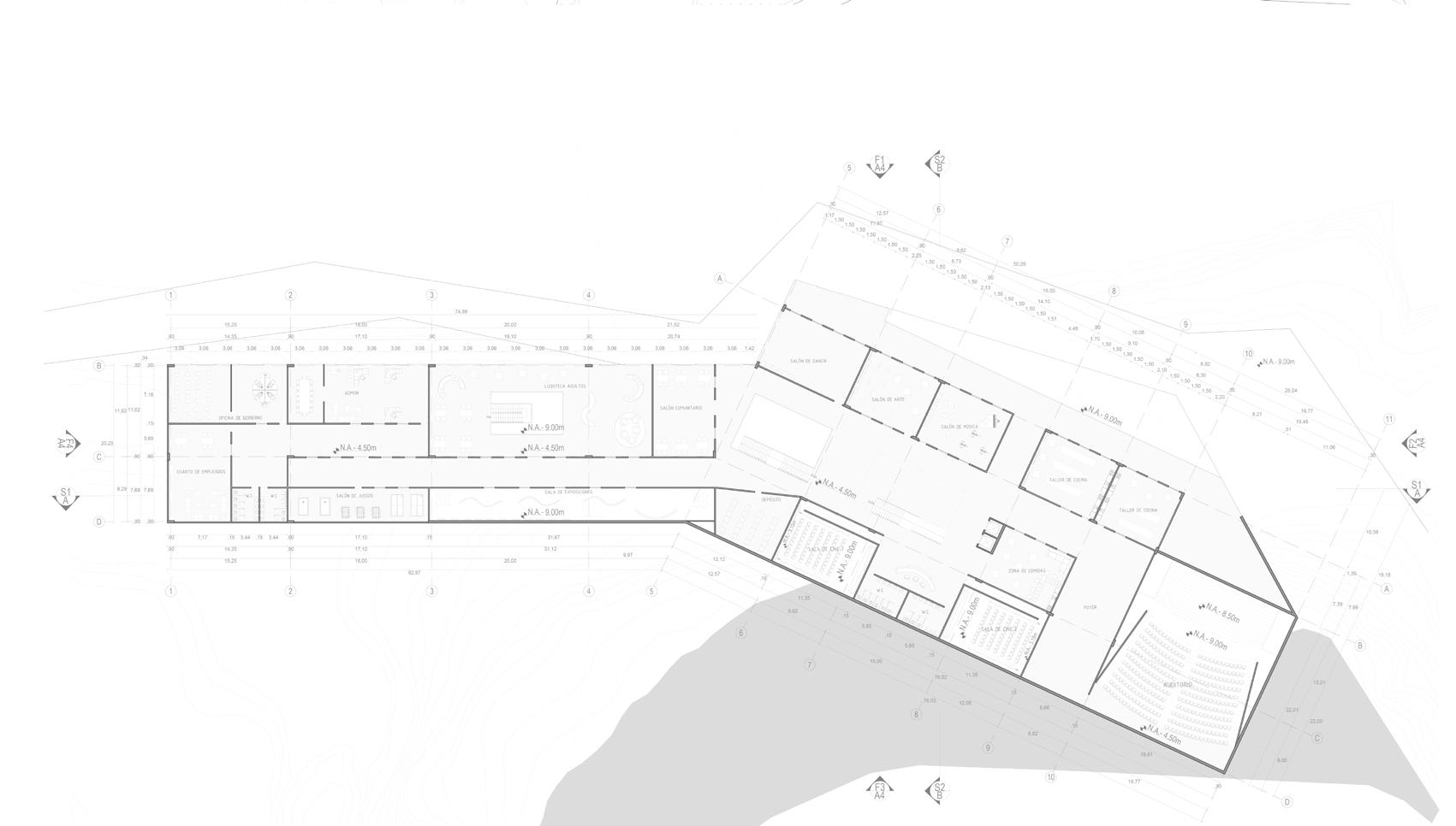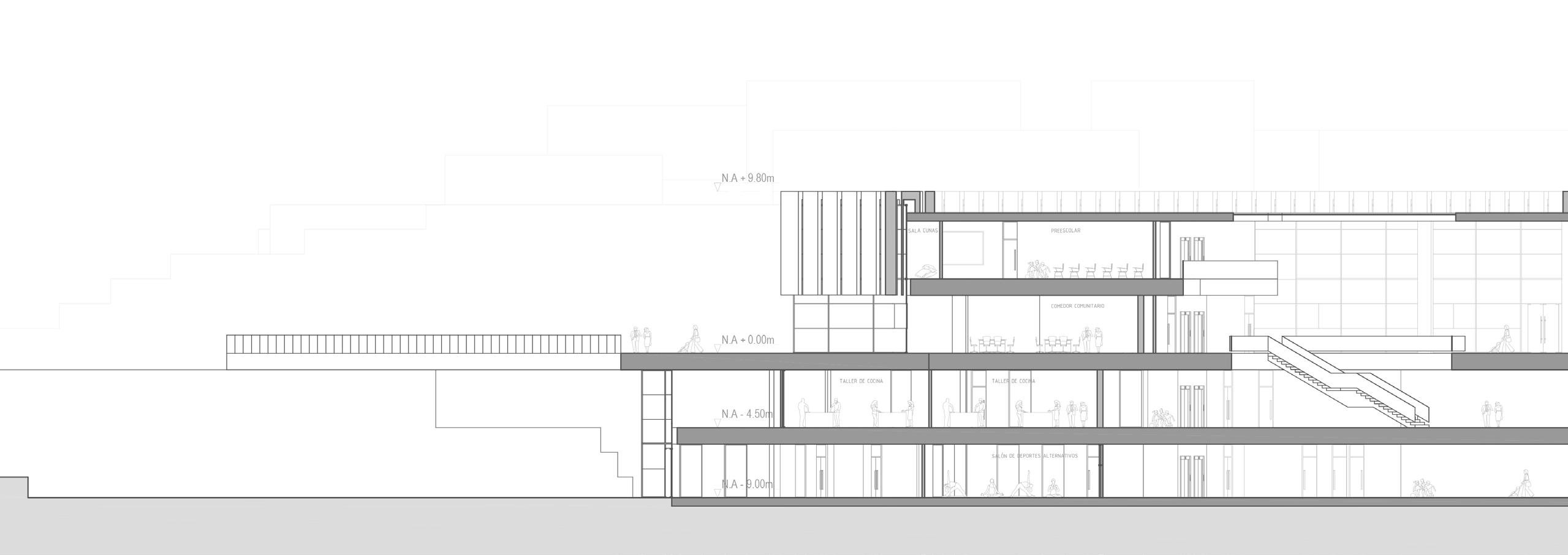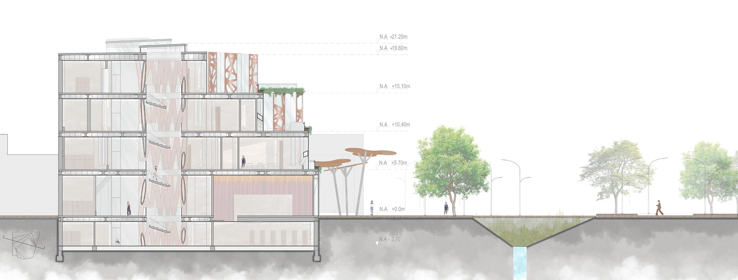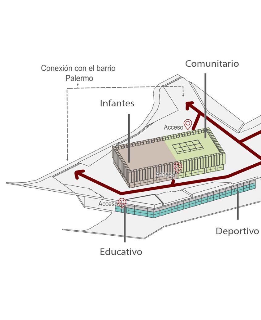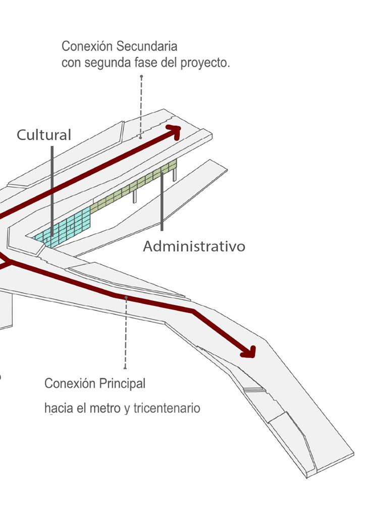 Debido a que el lote cuenta con una topografía de una gran pendiente, el edificio trata de acomplarse a esta, desarrollando así no solo el edificio hacia pisos superiores sino también inferiores; el proyecto prima las circulaciones y relaciones entre el barrio, el edificio y la estación, y por otro lado entre el edificio y el río.