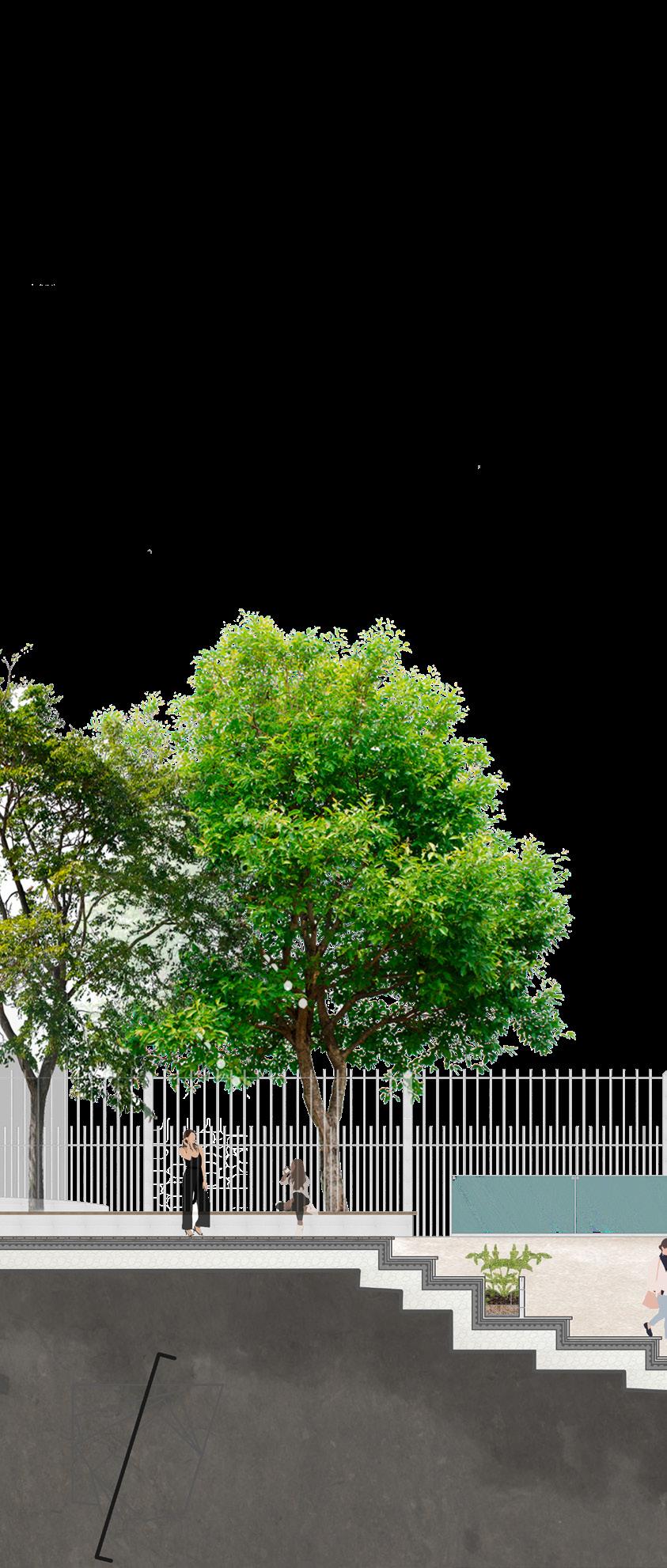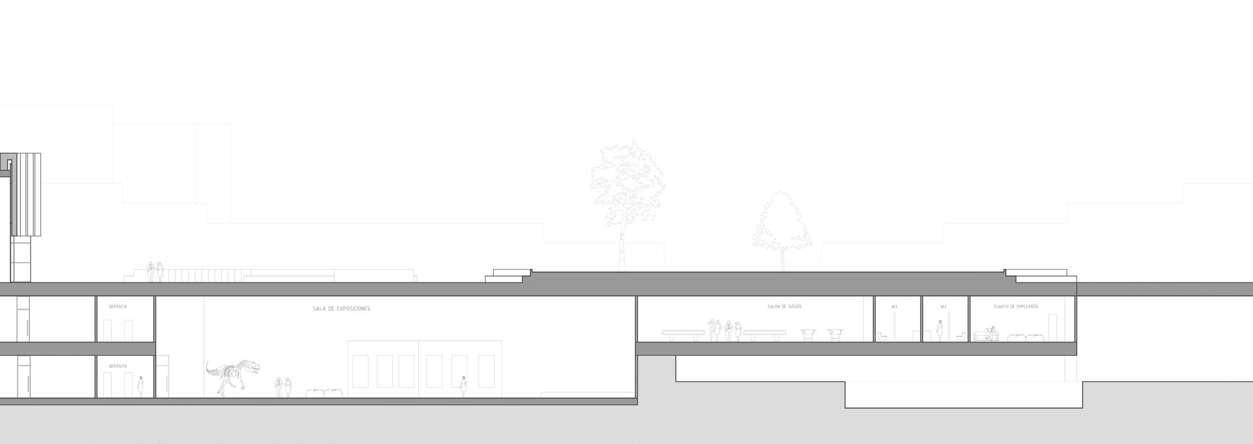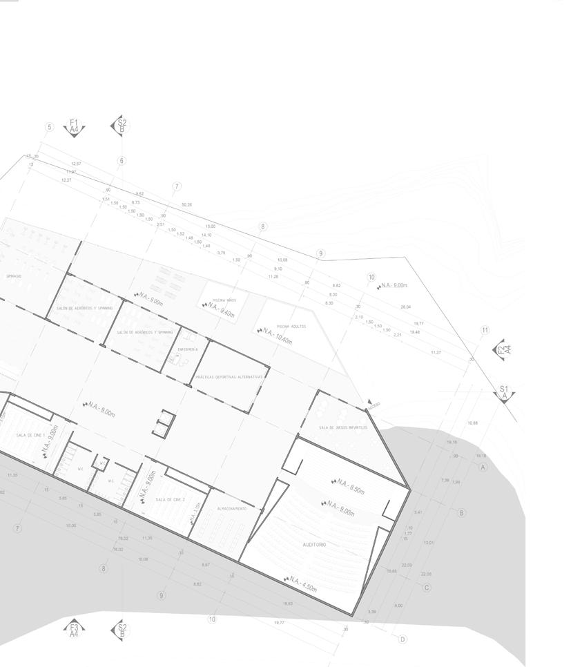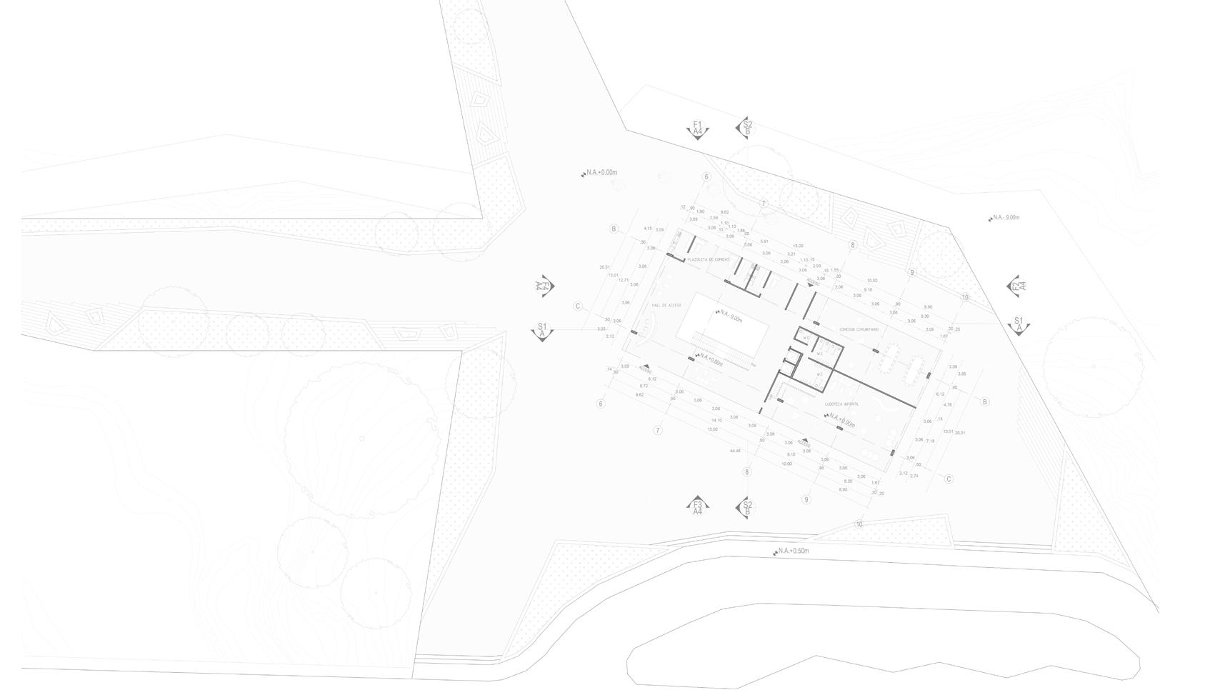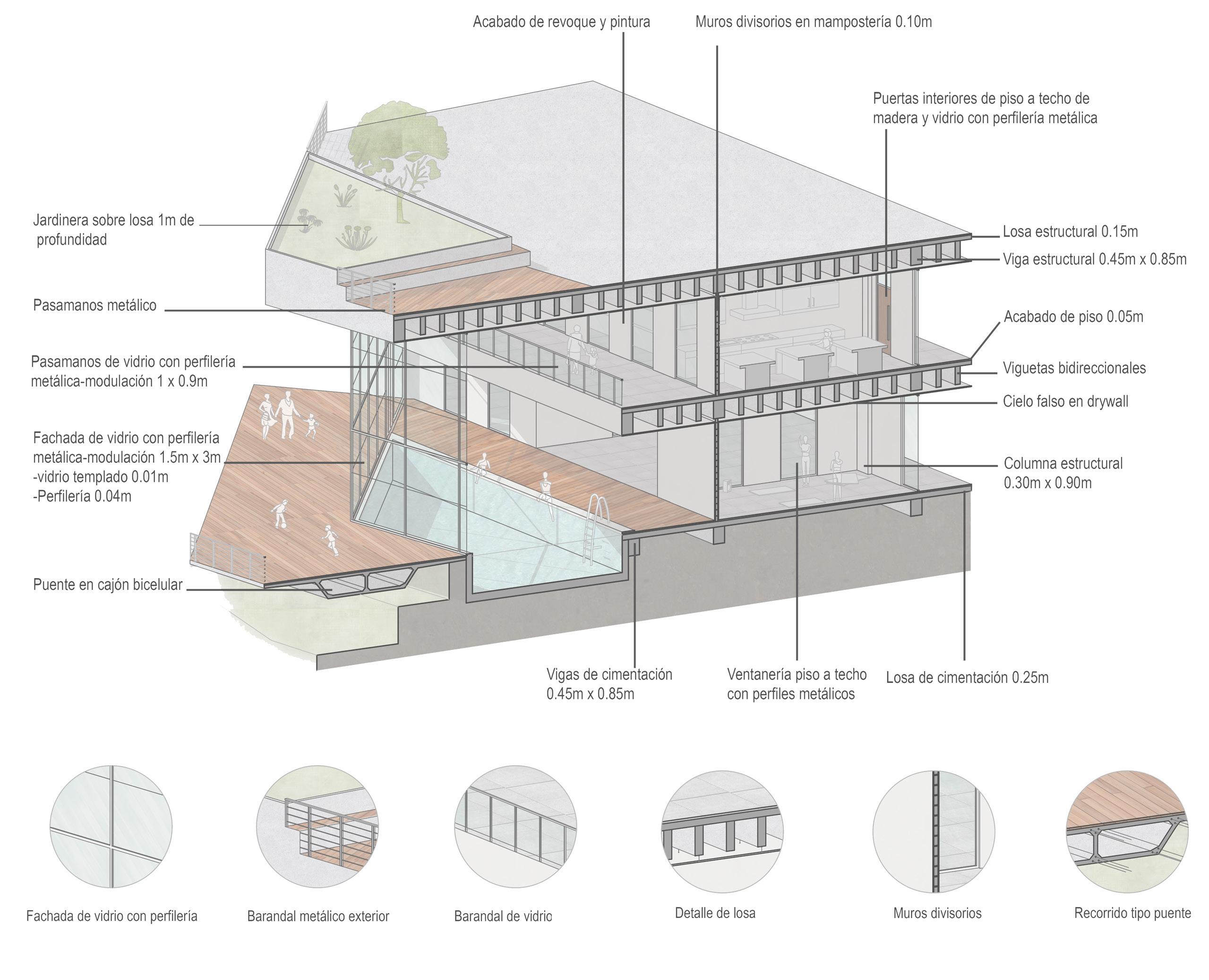 Debido a que el lote cuenta con una topografía de una gran pendiente, el edificio trata de acomplarse a esta, desarrollando así no solo el edificio hacia pisos superiores sino también inferiores; el proyecto prima las circulaciones y relaciones entre el barrio, el edificio y la estación, y por otro lado entre el edificio y el río.