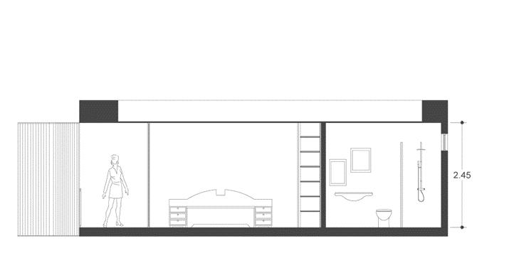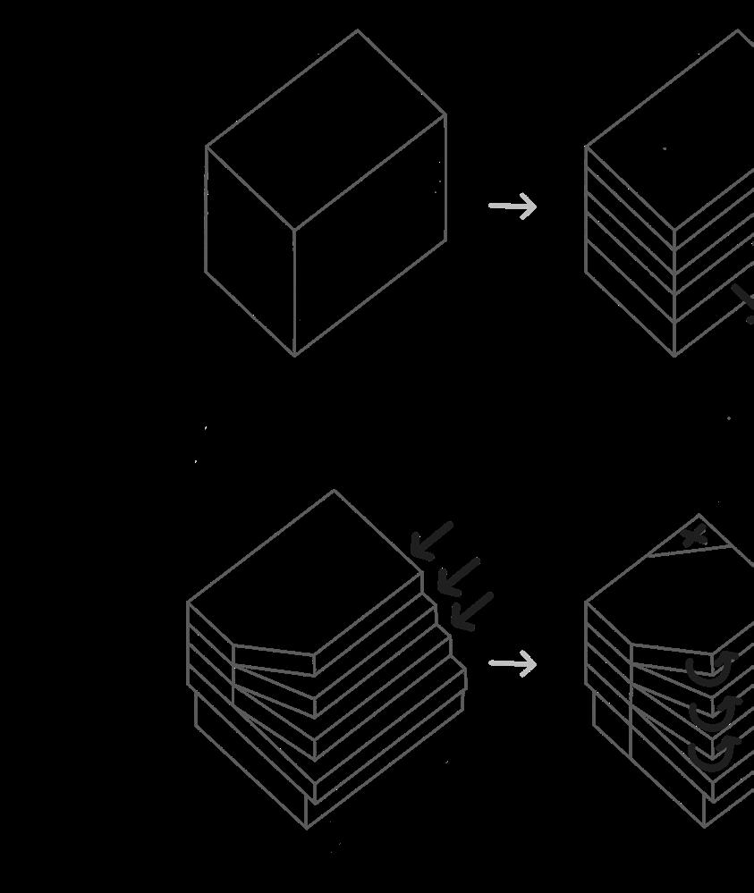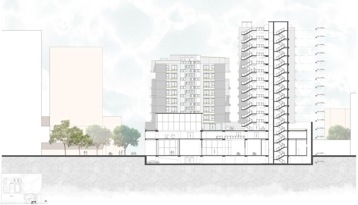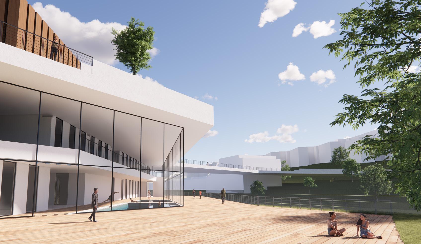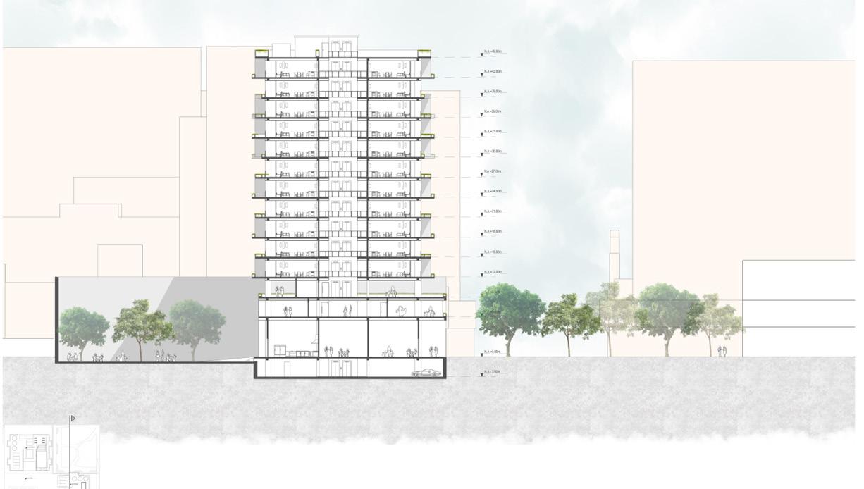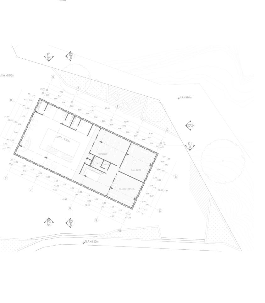 Debido a que el lote cuenta con una topografía de una gran pendiente, el edificio trata de acomplarse a esta, desarrollando así no solo el edificio hacia pisos superiores sino también inferiores; el proyecto prima las circulaciones y relaciones entre el barrio, el edificio y la estación, y por otro lado entre el edificio y el río.