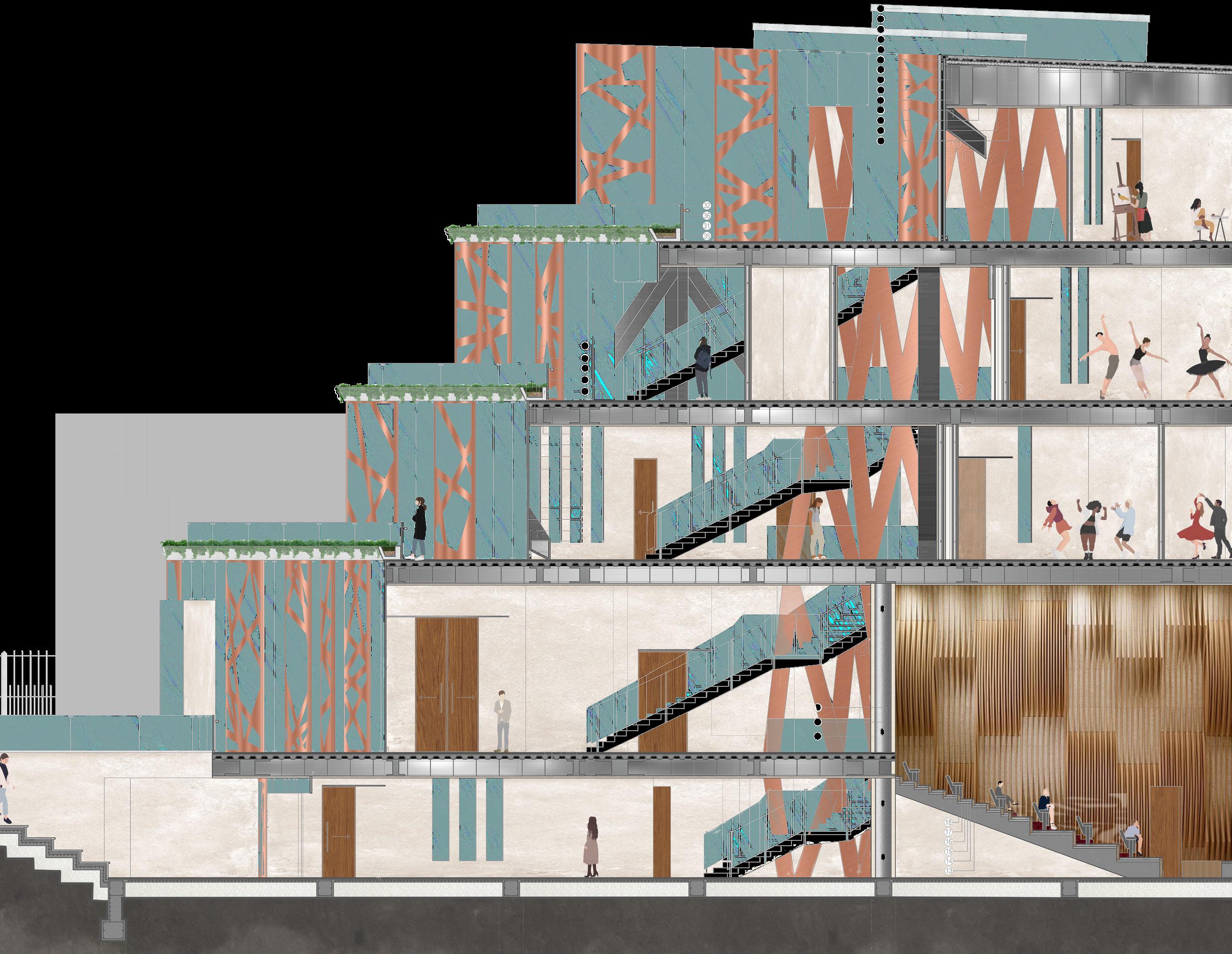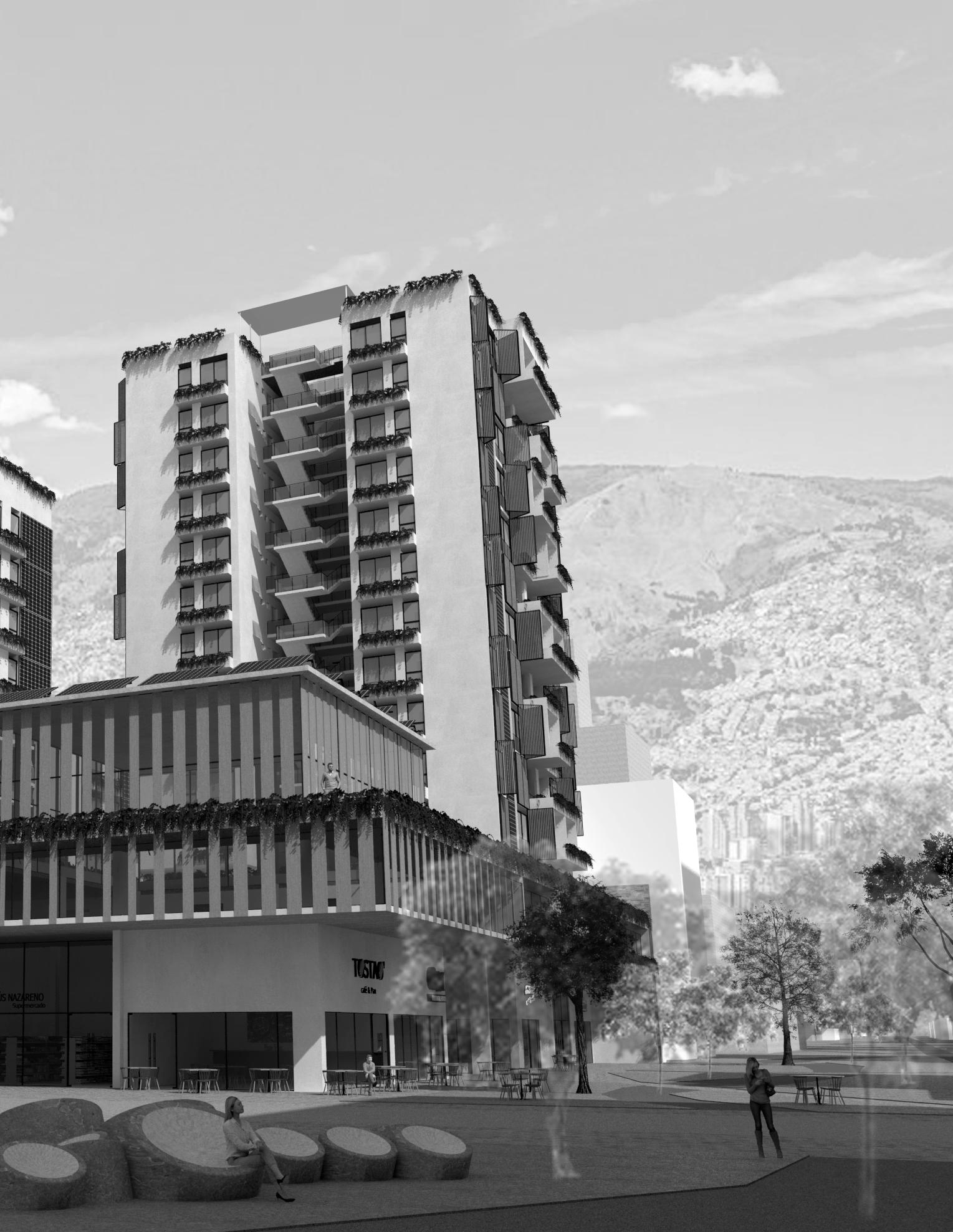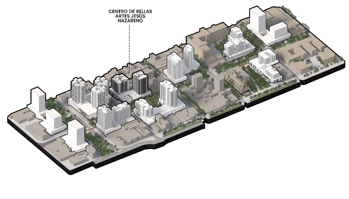 En el capítulo, solo se trae a colación el edificio que se abordo de manera específica, llamado “Centro de Bellas Artes”, el cual como su nombre lo indica, tiene un equipamiento (ubicado en plataforma) de caracter cultural dedicado a diversas expresiones artisticas, como la danza, la música, la pintura, la escultura y el dibujo. La parte de comercio se ubica en el zócalo de todo el edificio, y las dos torres corresponden a la parte de la vivienda.