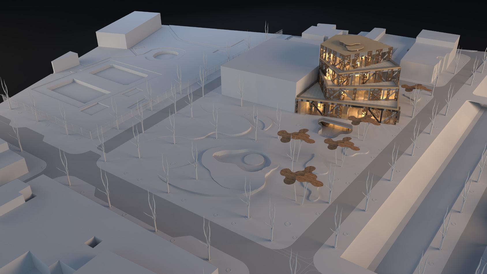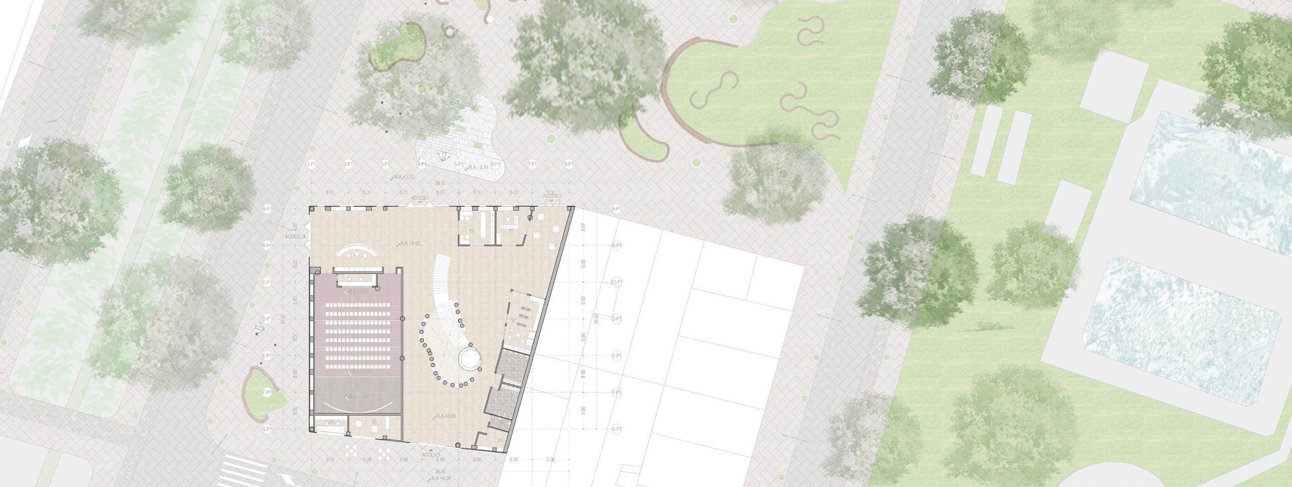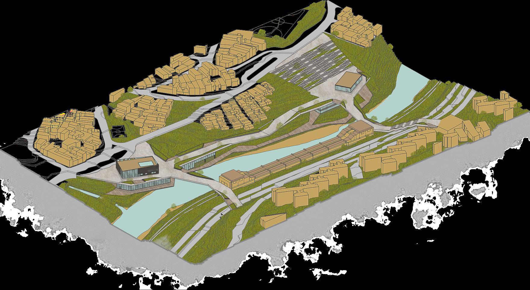 El proyecto en cuestión tiene por nombre “Aqua-Dance”, y es una escuela de danza; dicho proyecto trata de establecer relaciones visuales con la quebrada la Guayabala la cual se escuentra justo a un costado, y ademas la intrega a la propuesta del espacio público.