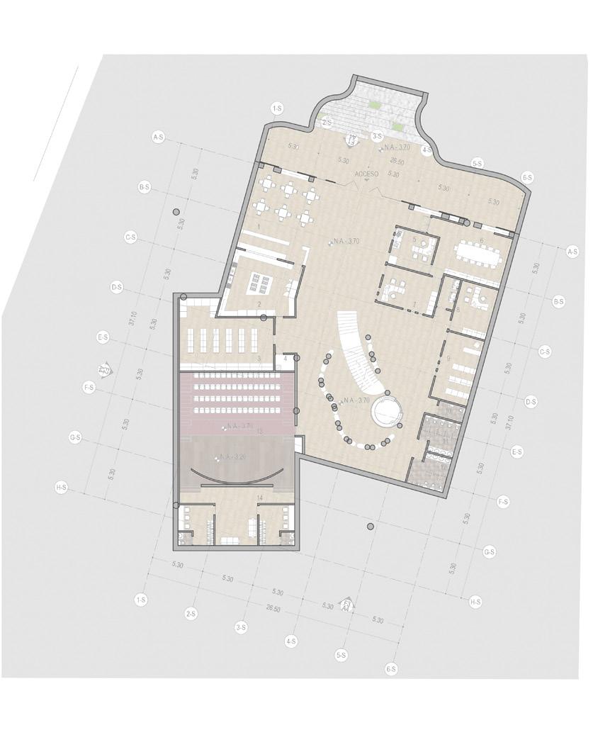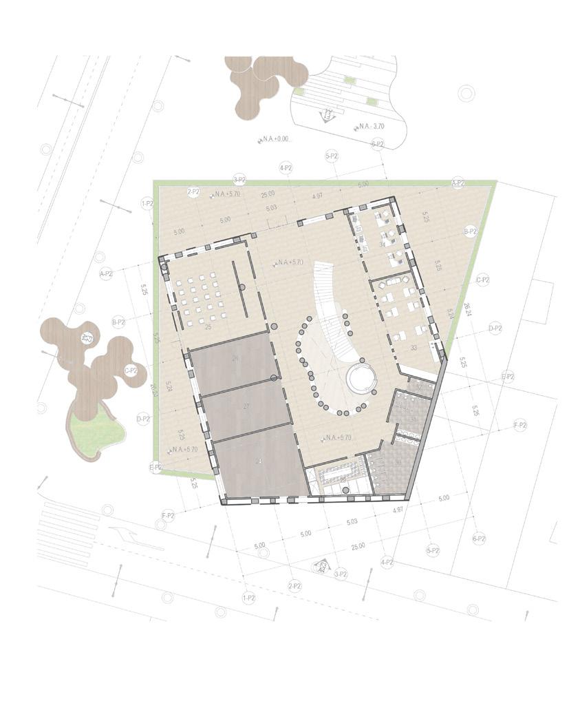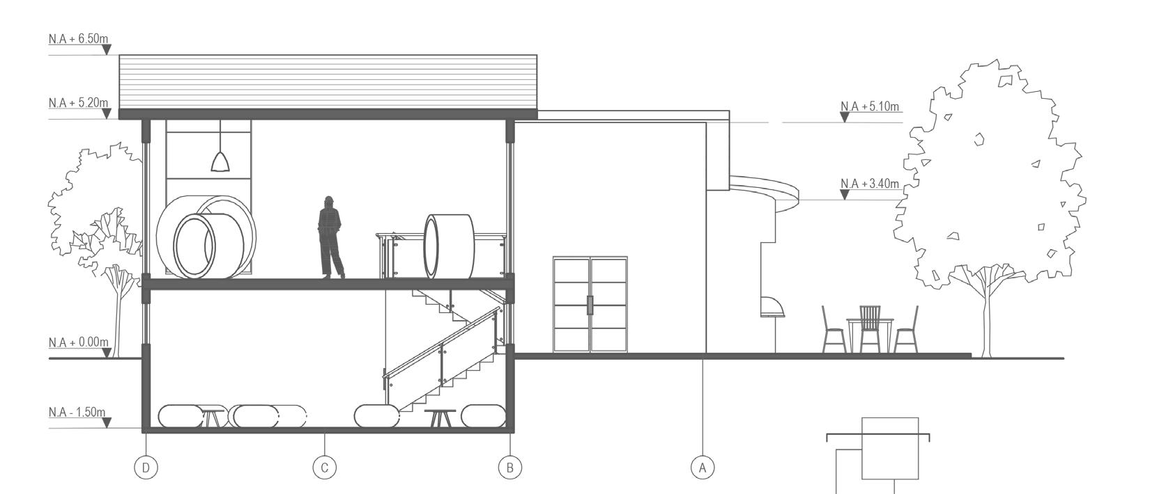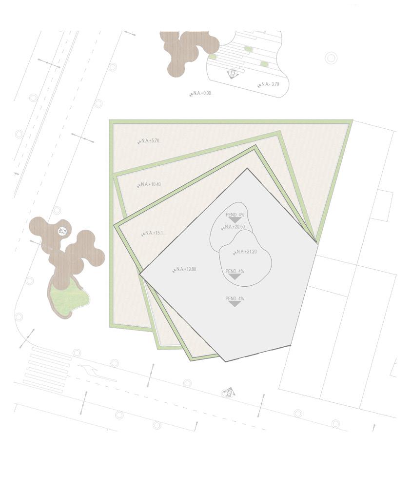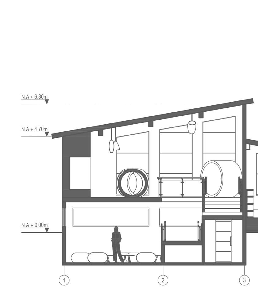 Además de ellos, el proyecto trata de articular todos los niveles a traves de vanos para dar una armonía y continuidad, pero sobre todo de permitir la mayor iluminación ya que debido a que la mitad el edificio esta semi-soterrado, esta es muy limitada.