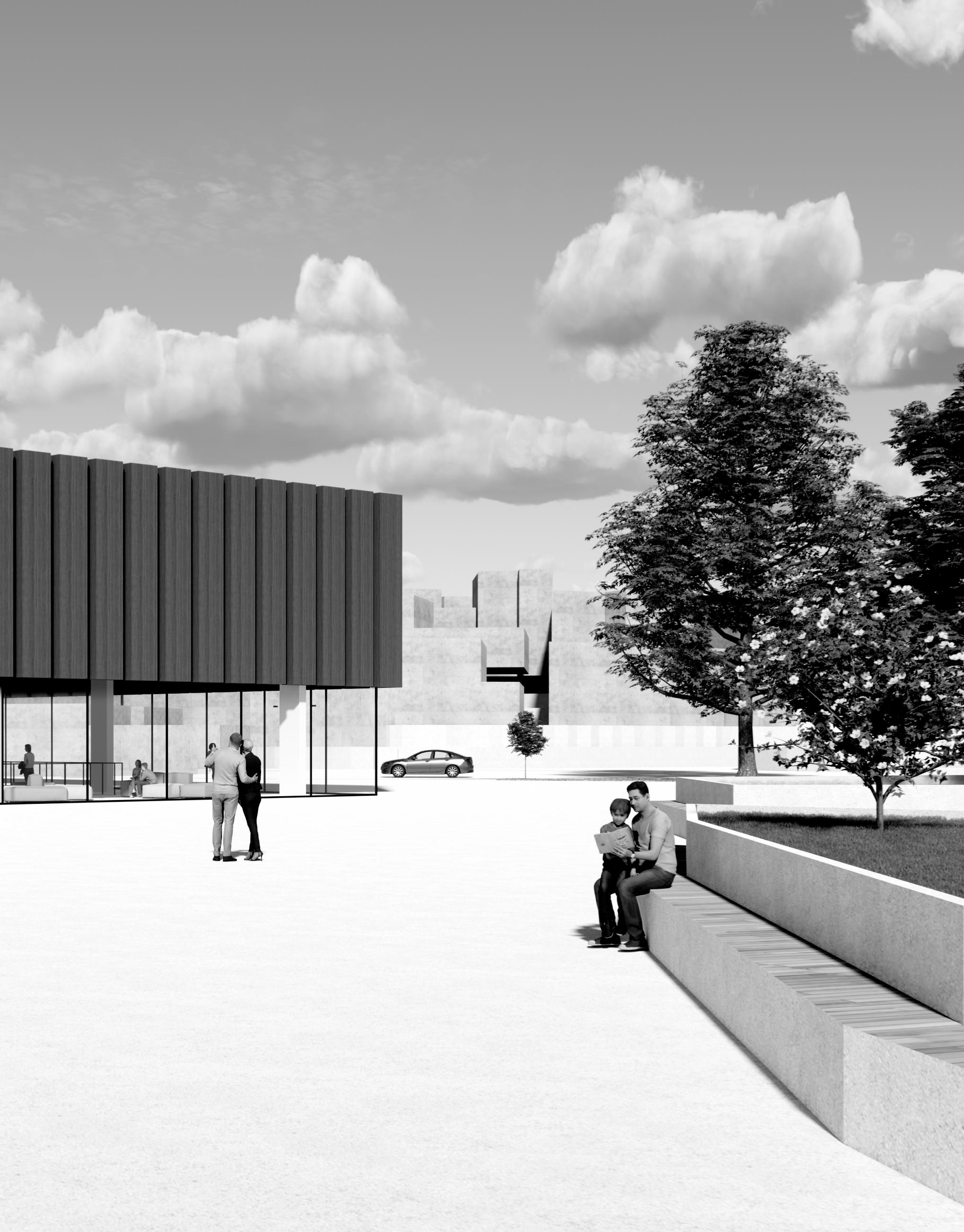 La plaza, se contrasta con la geométria del edificio, esta tiene formas más fluidas y dinámicas, lo que genera un equilibrio visual