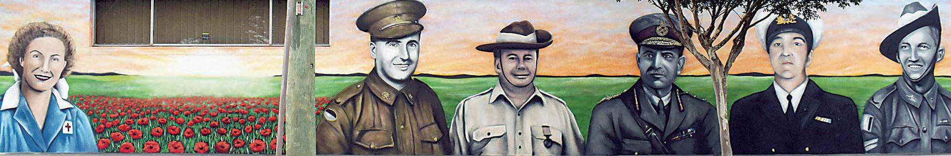 LOCAL veterans have been honoured in a new mural at the Yallourn/Newborough RSL. Painted by artist Steve Bechaz, the mural depicts Jean Bickerton, Robert Pritchett, George Harris, Sir John Monash, Ernie Clegg and Jack Hamilton. On Thursday, February 3, veterans, members of the RSL, family and community members gathered to admire Mr Bechaz’s work and honour those who served Australia in the war. Mr Bechaz said the mural took many months of research and preparing to reach the finished product. The mural is primarily spray paint, although Mr Bechaz said he did use a brush on the finer details. Mr Bechaz said the mural would not have been possible without the supported from Veterans Minister Shaun Leane, a veteran’s grant and the Yallourn/Newborough RSL. “It took a few months to do, because there was lots of research and designing that went into it,” Mr Bechaz said. “I do love a challenge, and I do want to do more portraits.” Mr Bechaz said he enjoyed learning more about local servicemen and women while he worked on the mural. “Thank you to the veterans for putting their trust in me ... thank you to the community, and a special thanks to Steve Moy - he help get it all started,” he said. The mural faces towards the location where the dawn service is held each year, and has the Ode of Remembrance painted on the side. World War II nurse Jean Bickerton attended the event. She is pictured in her nurse uniform on the mural, an image which was painted from a photograph taken when she was about 21 years old. Mrs Bickerton said she was “shocked” to find out she would appear on the wall. Her nurse’s cape is currently on display at the Moe RSL. Robert Pritchett, illustrated next to Mrs Bickerton on the mural, was a driver in the Royal Army Service Corps in World War II. He died as a prisoner of war in 1943 after he was captured in Singapore. After Mr Pritchett’s family were notified of his death, a wreath has been laid every year for over 75 years by his son Tom Pritchett. George Harris, a member of the Morwell RSL, was pleased to be featured on the wall. Mr Harris has been a local for most of his life, having moved to Morwell at the age of 15. “It is an honour,” Mr Harris said. Mr Harris is painted next to Sir John Monash, the first chairman of the Victorian State Electricity Commission. Sir Monash served in World War I and was amongst those first under fire in Gallipoli. He was in charge of the entire Australian Corps by 1918. Ernie Clegg’s great granddaughter Chloe Clegg also attended. Chloe was very close with her great grandfather. She spent every Anzac Day and Remembrance Day with Mr Clegg, who she remembers fondly. Mr Clegg had a long career in the Royal Australian Navy, and was remembered by his peers for entertaining the crew on ships with singing, dancing and humour.” “It is very special to have him on the wall,” Chloe said. The daughters of Jack Hamilton, Beth Cox and Faye Brown, were present at the event with Mr Hamilton’s granddaughter Kelly Cox. Mr Hamilton was a long-time president of the Yallourn-Newborough RSL, and his family delighted he featured in the artwork. “It’s amazing to drive past and see him on the wall,” Beth said. Faye agreed with her sister. “It’s pretty special ... I cried when I first saw him,” she said. Former Latrobe City Mayor Sharon Gibson voiced her support for the new mural. “I think it’s a very respectful and thought provoking thing,” Cr Gibson said. “These are the faces of people who gave everything.” Cr Gibson said she hopes Mr Bechaz’s artistic additions to the region will bring more visitors to Newborough and Moe. “It’s lovely to take pride in our town ... hopefully they will make people come and see what we have to offer,” she said. The full dedication ceremony for the mural will be at the Yallourn/Newborough RSL on February 17, 2022, from 10am to 11am.