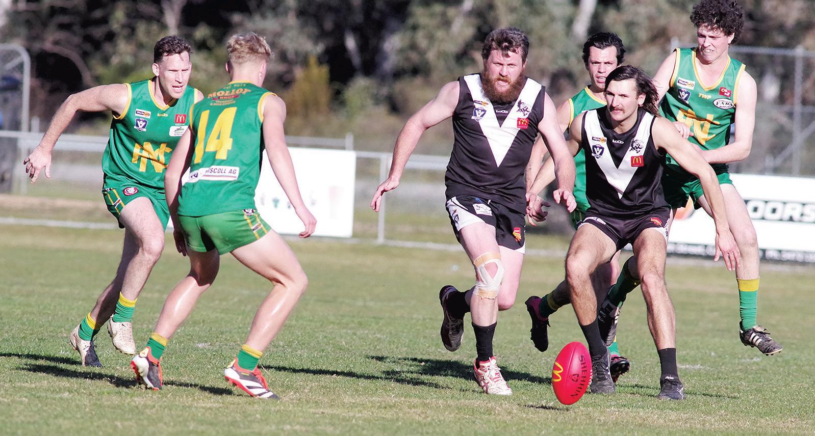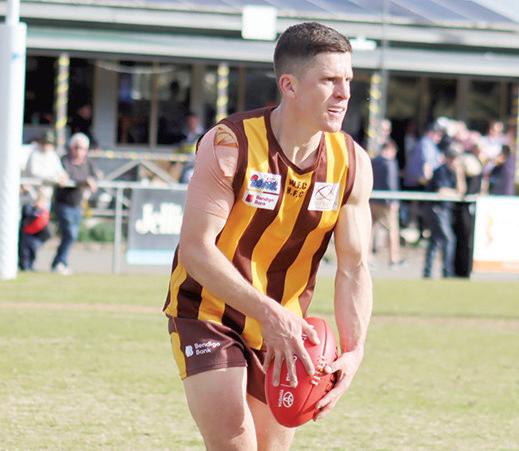 Remarkable season: Woodend-Hesket’s Dan Toman about to pass to ateam-mate against Kyneton. He must be astrong chance to take out another Bowen Medal.