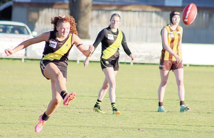 Kyneton’s Ella Jeffrey boots away against Woodend-Hesket at the Kyneton Showgrounds on Saturday.
