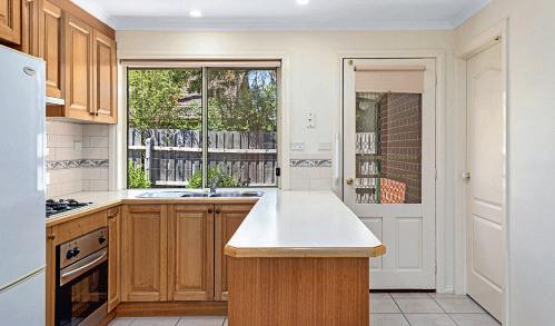•Kitchen has solid core timber cabinetry, with adoublebowl stainless steelsink