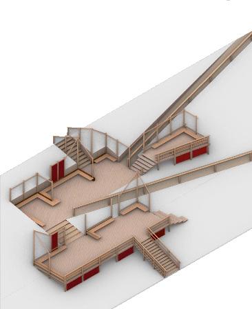 Design for a wooden spatial structure, bridging the embankment that otherwise functions as a big green wall, isolating the neighbourhood from the rest of the city. It serves as a multifunctional space, accomodating pedestrians and cyclists on their way to cross the dyke, as well as residents simply wanting to meet each other and sit down for a chat.