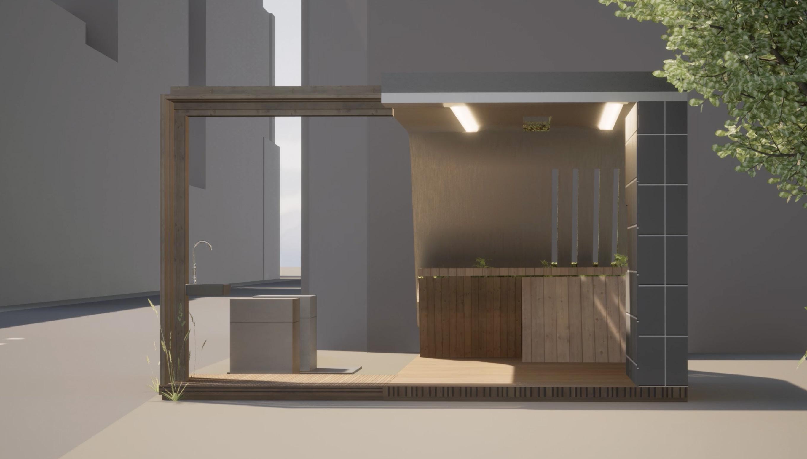 render showing the following elements (L>R): sink with tapwater from rain collection on roof, existing waste collection bins, biodegradable plastic collection bin, worm hotel, centralised mail collection wall.