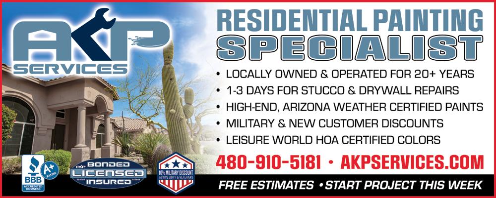 AKP Services is now offering RESIDENTIAL PAINTING in LEISURE WORLD. We will handle all stucco, siding, and drywall repairs. We have been serving the valley for 20+ years. 480.910.5181 – See the GAMES page for more info.