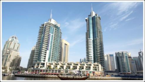 Marinascape - mixed-use development in Dubai Marina, featuring twin towers and villas, with retail along the promenade.