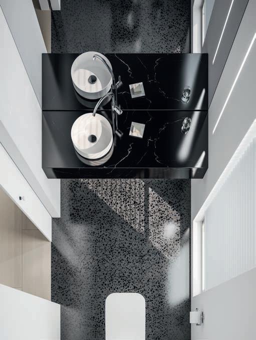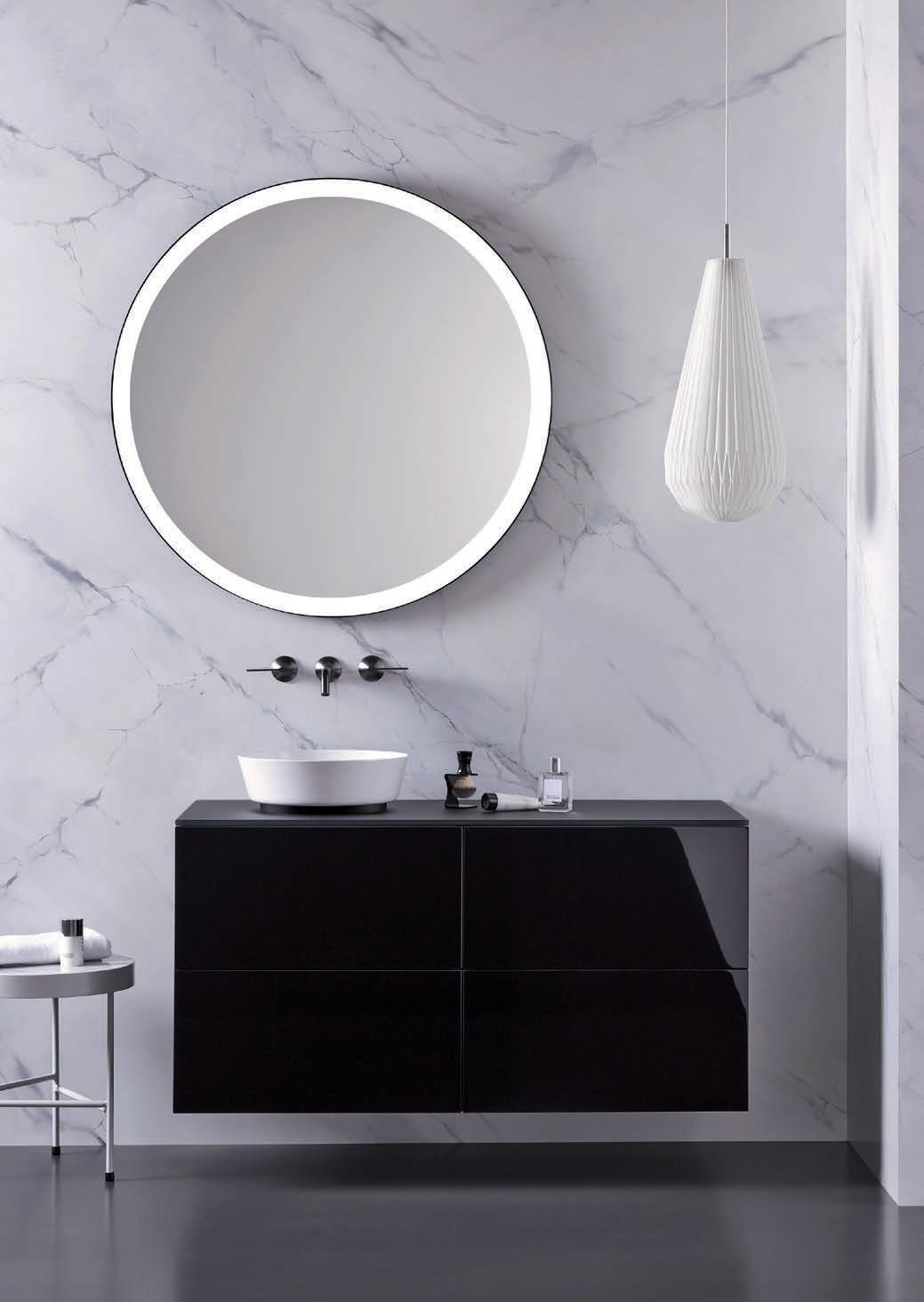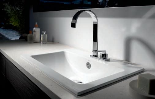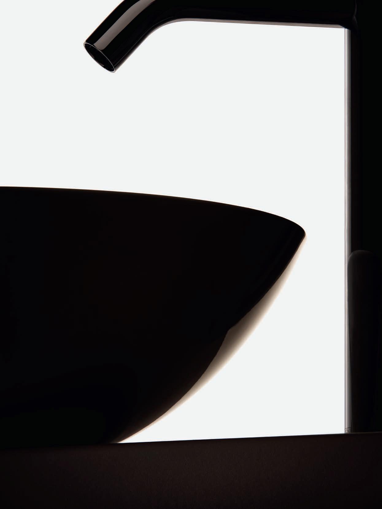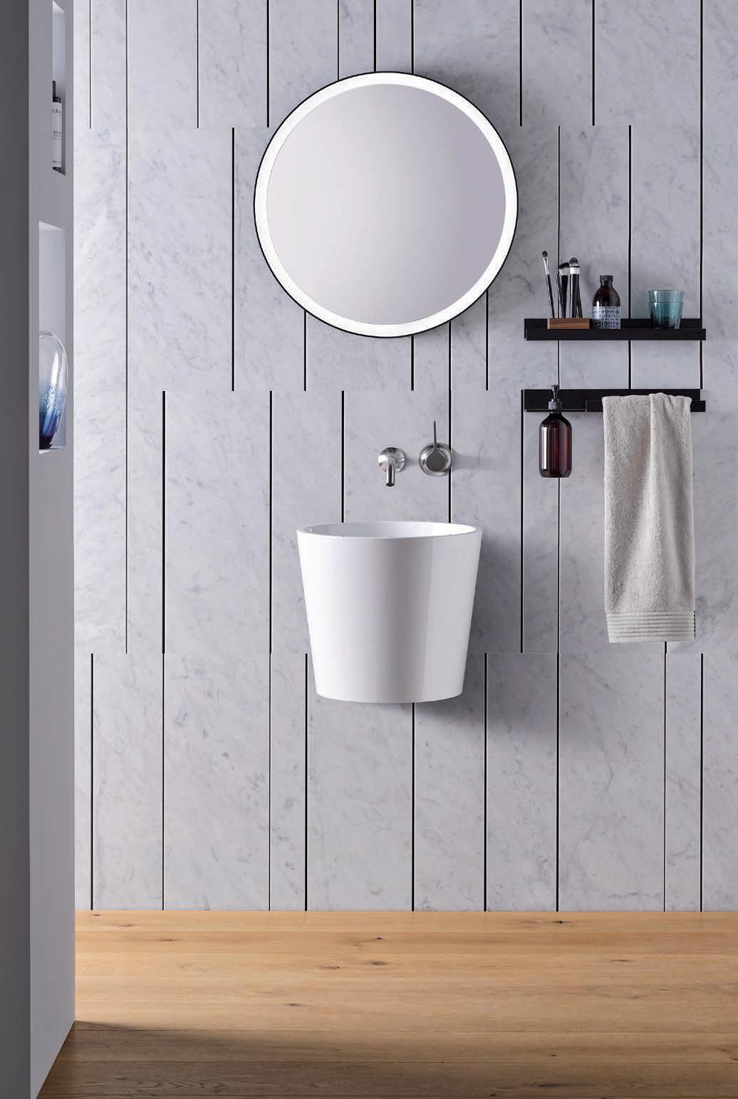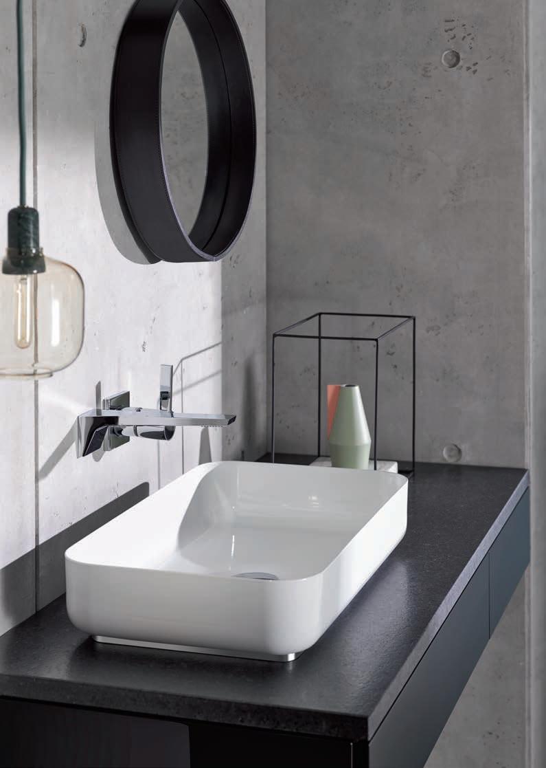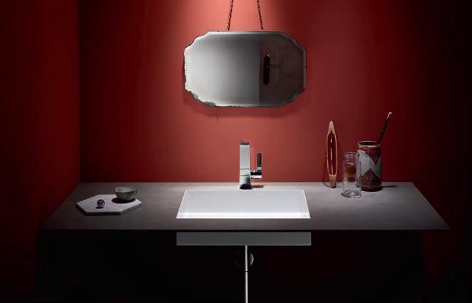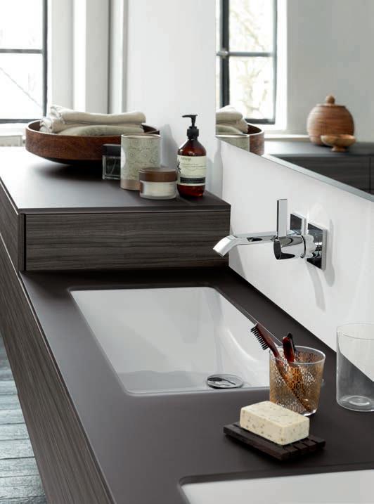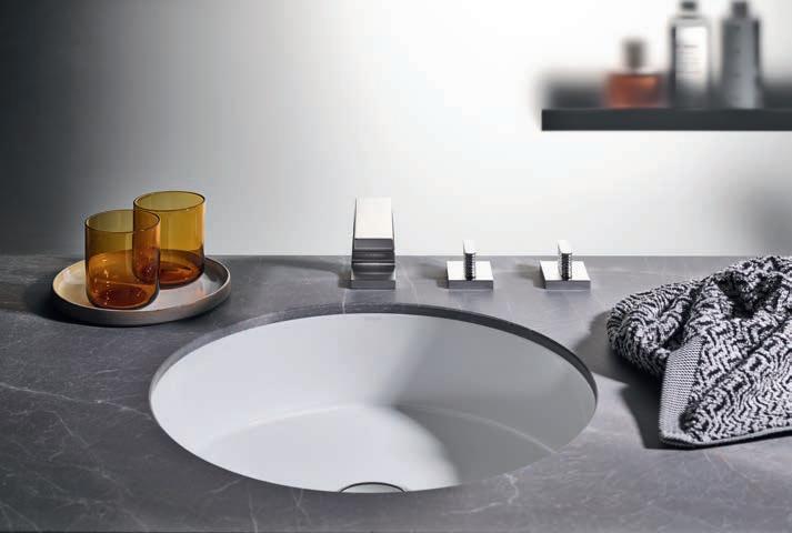 Die neuen Oberflächenserien der Shaping Surfaces Kollektion setzen auf Anleihen aus der Natur. Mit multisensorisch angelegten Materialkompositionen, die von natürlichen Elementen inspiriert sind, knüpfen sie an unseren ursprünglichsten Lebensraum an –und bringen einen Hauch der Ursprünglich keit ins heimische Bad. Während das ausdrucksstarke AQUA mit seiner Emaillierung das Licht bricht und damit wechselhaft wirkt wie eine Wasseroberfläche, setzt TERRA auf den erdenden Effekt feinster mineralischer Partikel. Beide Oberflächen wurden speziell für Schalen becken entwickelt, deren Form optimal mit ihrer Materialität korrespondiert.
