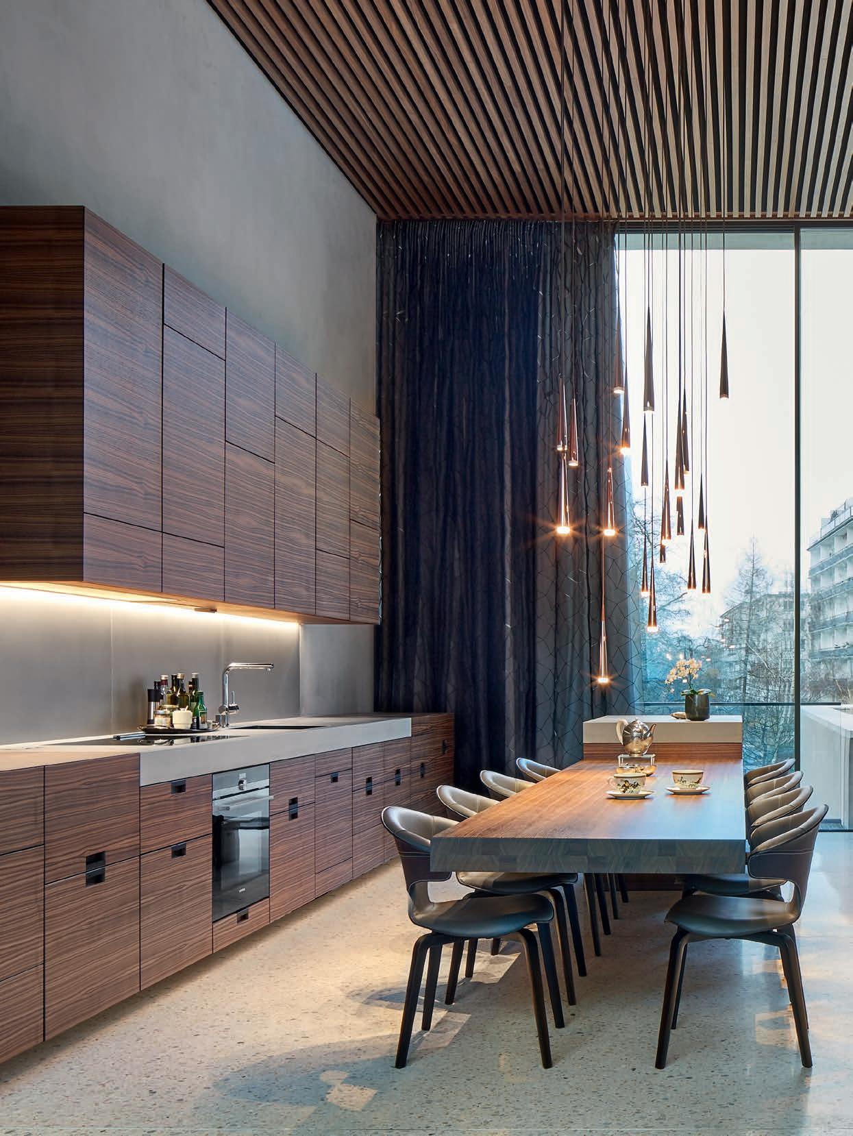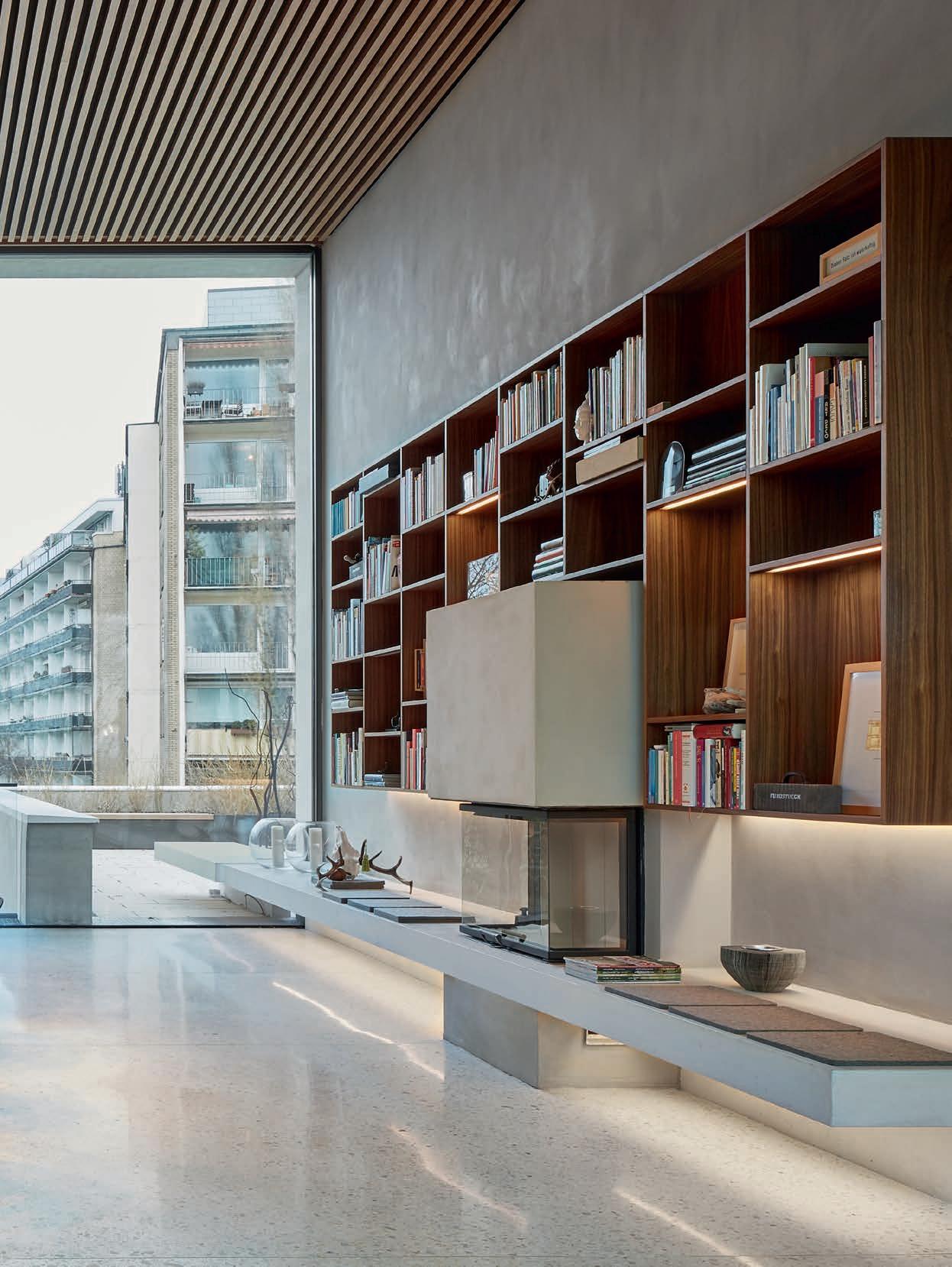 When it came to the layout of the rooms on the upper floors, the priority was to create optimum space for the owner’s own living concepts. So the focal point of the second floor is a living room over two floors with a large “single window” that affords views over the Elbe river and can be used as a piece of furniture. The rear part of the building extends along the fire wall to the neighbouring building and includes a complete guest apartment with two bedrooms, a kitchenette and a shared bathroom. The sleeping area of the main house is also on this floor. The five metre high living area with a kitchen and dining area is on the top floor. A spacious roof terrace seamlessly extends the interior space to the outside. The clever nesting of functional areas ensures the efficient use of limited space and still allows for spatial quality in the lounge areas. This is also supported by the choice of materials and the quality of the design: concrete for the façade, an individual sand coloured terrazzo mix for the floors and hallways, a natural fine plaster for the walls and ceilings as well as walnut wood for the different fixtures and doors.