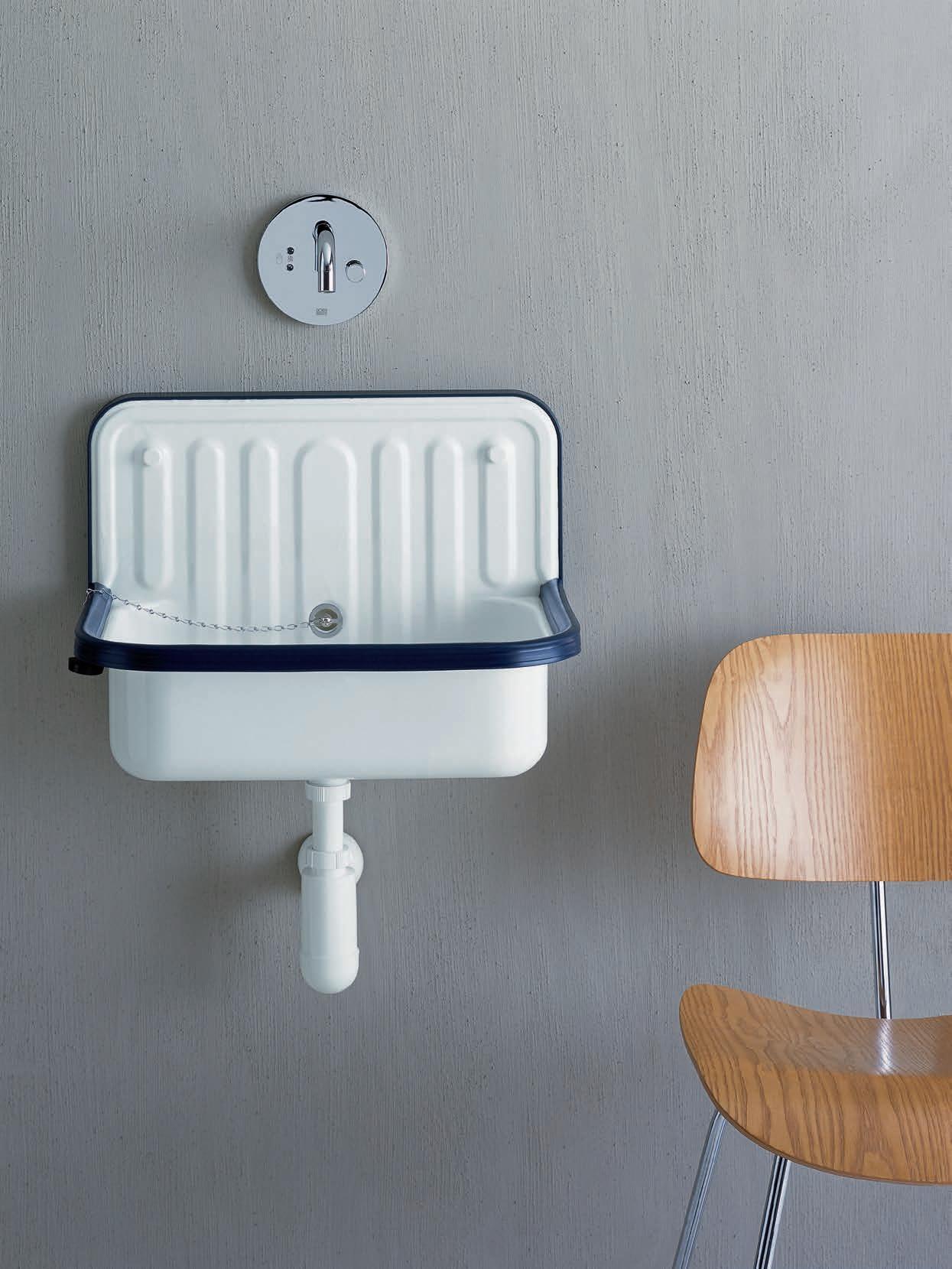 Der Waschplatz Steel19 bringt den Pragmatismus des klassischen Ausgussbeckens ins heimische Bad. Charmante, zeitgenössische Formen und eine besonders kontrastreiche Materialkomposition machen ihn zum Paradebeispiel eines neuen, wohnlichen Purismus. Die charakteristische Einheit aus emaillierter Rückwand und Becken setzt in Kombination mit dem filigranen Gestell industrielle Akzente. Eine integrierte zweite Ablagefläche aus getöntem Glas sorgt im Alltag für Funktionalität. Als Komplettlösung mit Armatur, Unterputzkörper und Siphonverkleidung vereint Steel19 geringen Montageaufwand mit großer, visueller Wirkung.