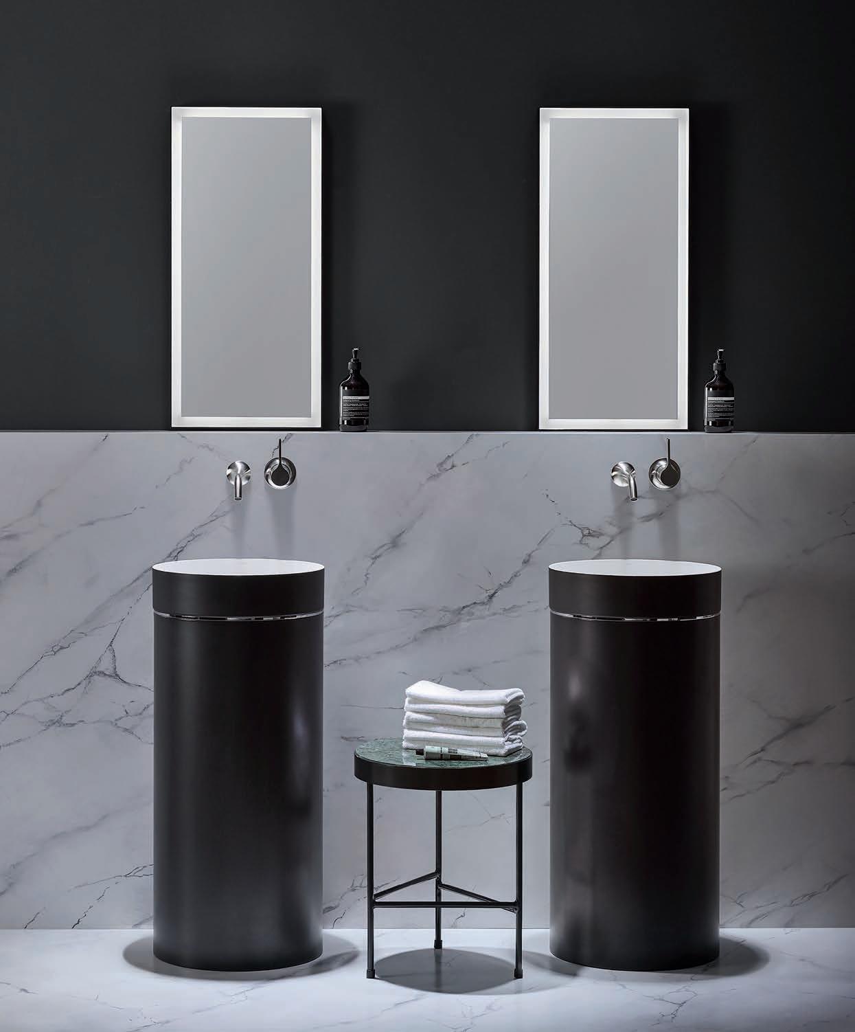 This journal is devoted to the added value of the synergetic cooperation and wholeness that the ancient Aristotle talked about. The picturesque landscape images taken by the Australian photographer Brooke Holm tell of the interplay between people and nature – thus providing a direct connection to the current AQUA and TERRA surface ranges. The whole expressiveness of a material manifests itself in the “Fluid Rocks” designed by the French born Lebanese glass artist Flavie Audi – that combines energies and unites opposites in Audi’s objects, such as Alape’s glazes. The “Cellules” designed by the Israeli artist Absalon redefine architectural structures in such a radical way, creating unexpected synergies between interiors and residents; for example, the complementary combination of individual elements here plays a special role in small bathrooms. In the true sense of the Greek word synergía , which literally means “interaction”, the synergy concept also forms a bridge to the “Palmaille” house in Hamburg, where Alape’s products that are integrated into Walter Gebhardt’s exclusive architecture exert their full impact.