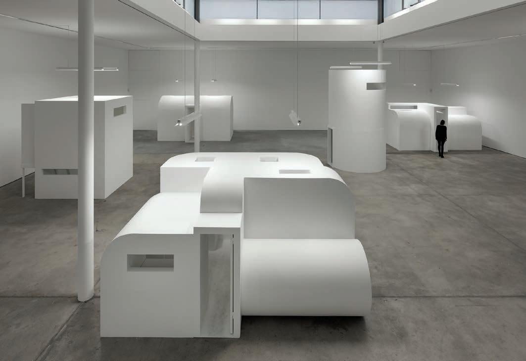 Holz, Karton, weiße Dispersionsfarbe, 6 Neonröhren, 40 Elemente/ Wood, cardboard, white paint,6 neon lights, 40 elements 140 x 928 x 1028 cm; courtesy Collection du Fonds régional d’art contemporain Languedoc-Roussillon