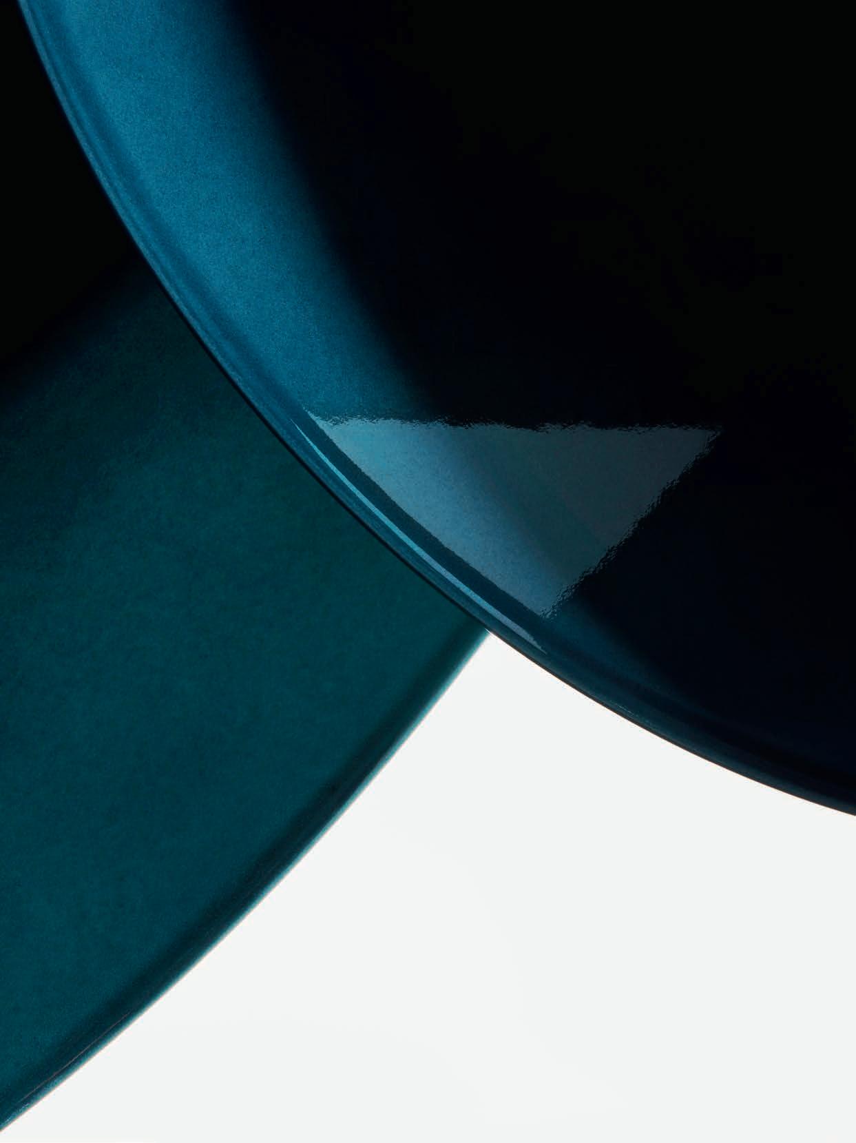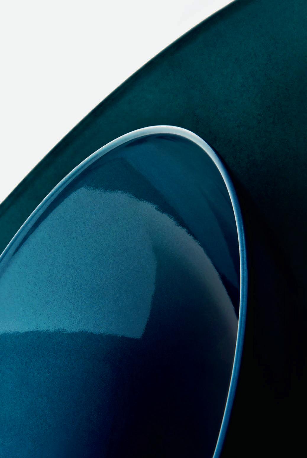 This is because the symbiotic interaction with the glass shells applied by hand give it the characteristic properties. One that protects it and a second and third that give it its colour and texture. While the flexible steel defines the shape of the product, the glass makes it durable and reliably retains the shape of even the most delicate geometries. As a pore free coating it is resistant to scratches, corrosion and to the adhesion of dirt particles and micro organisms. As a decorative layer, it also allows for a variety of surface effects. The creative possibilities formally offered by the steel are multiplied by the individual recipes of the top glaze.