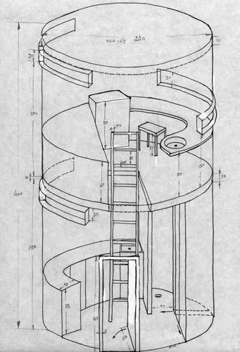 did not claim as an independent artist to create solutions for many people or make everyday life easier for anyone. He wanted to intensify his own life by breaking habits. He also made meticulous calculations – for example, the number of clothes hangers that he would have or the distance from his potential visitors (he could only ever have one visitor who would stand or sit exactly 40 cm away from him.) However, like the Zen doctrines, the design of his cells eludes the rules of any logical rationalism.