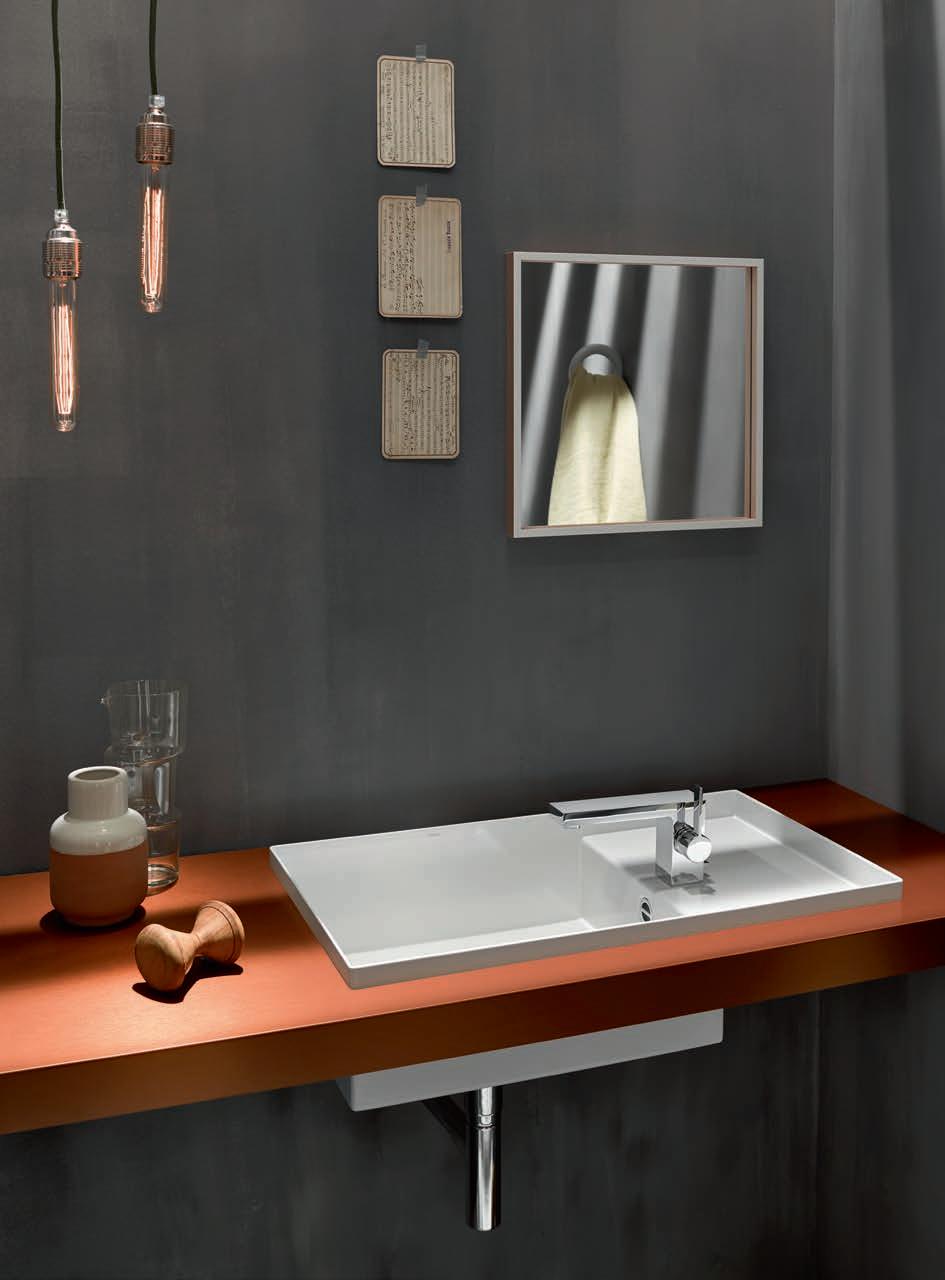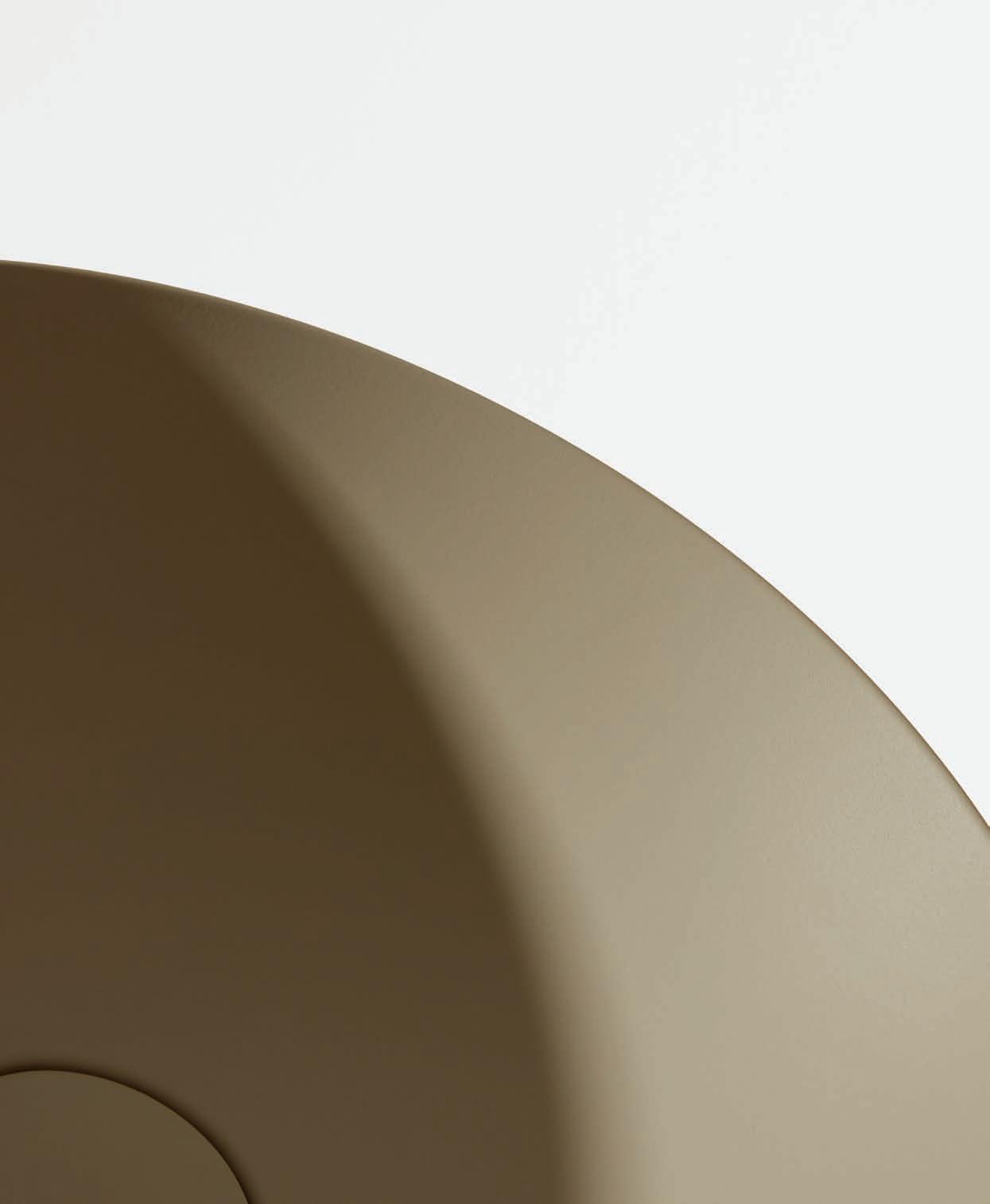 The new surface ranges of the Shaping Surfaces collection focus on references from nature. With multi sensory material compositions inspired by natural elements, they link into our most original habitat – and bring a touch of originality to private bathrooms. While the expressive AQUA refracts light with its enamelling, thus creating a variable effect like a water surface, TERRA focuses on the earthy effect of the finest mineral particles. Both surfaces were specially designed for dish basins whose shape corresponds perfectly with their materiality.