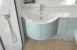 Sleek and curvaceous basin design together with a mixture of unit colours in Olive and Pompadour and matching Pompadour Elegance Plus shower tray and Elegance wall panels.