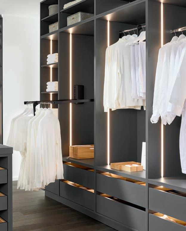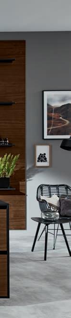 hegroovedstr ct reofthisdark stainedoakisbothavis alandtactilepleasure. Illuminated wall panels such as the FREEBOARD bring the three-dimensional play of light and shadow to the fore. The roller-shutter cabinetwithitselegantlines tsinperfectl tprovidesspaceforacoffeebar Ap ll o ttra rightne ttoitactsasadditionalworkspace,fore ampleforafoodmi er he MOTIONswivelshelfaboveholdsever thingread thatneedstobe ickl tohand