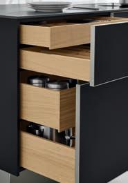 hes permattblackofthefrontiscombinedwithgentl shimmeringaluminium edges and accessories in stainless steel to form a timelessly beautiful combination. The purist aesthetics are continued inside the units and pull-outs. Spacious drawer inserts made of wood and mobile spicetra sareingredientsthatinspirecookingda afterda Anti slipmatsens reever thingsta sinitsplace nethingiscertain thebestprinciplewhenf rnishing o rkitchenworkshopisorder