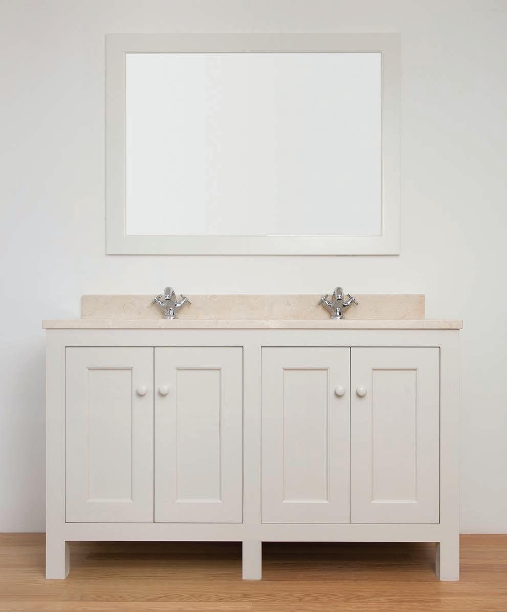 1400mm wide in Farrow & Ball Mizzle with Carrara marble top and two Sutton basins. Large plain mirror.