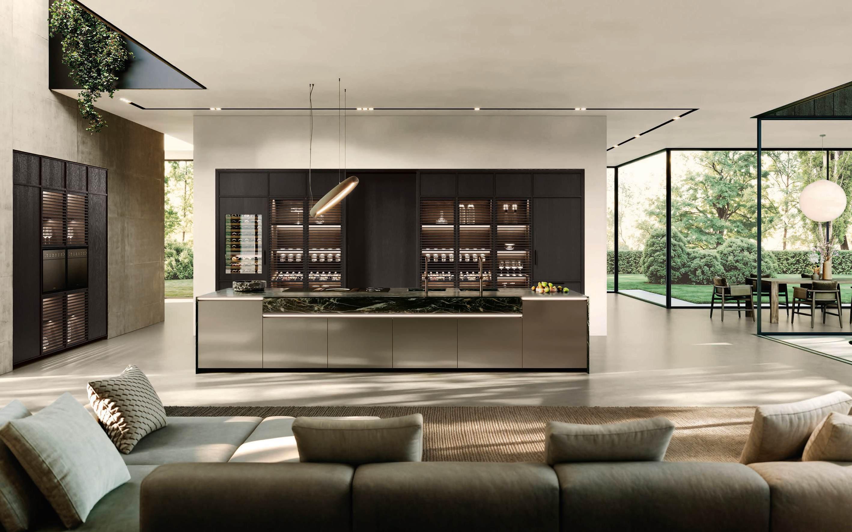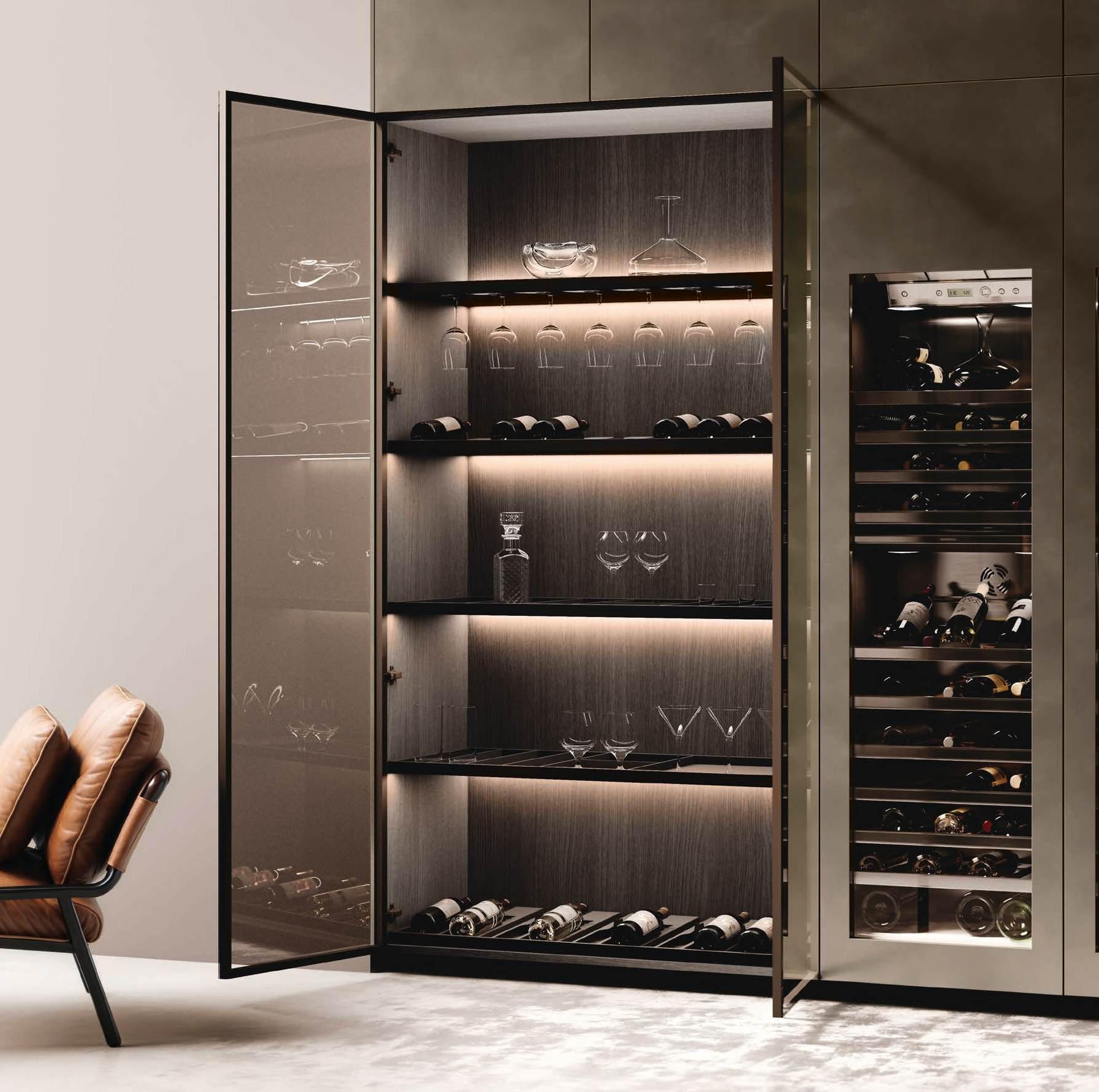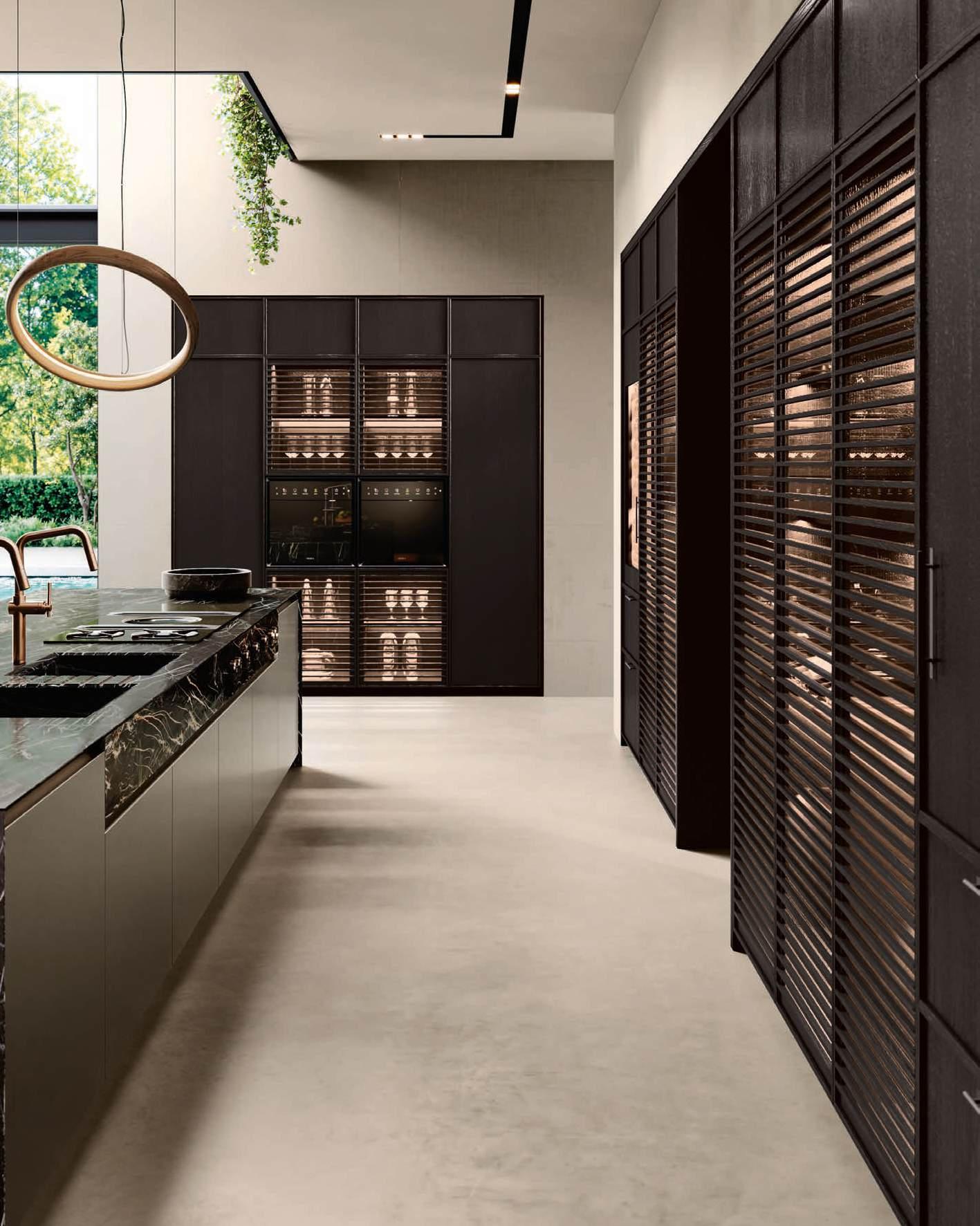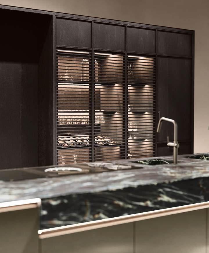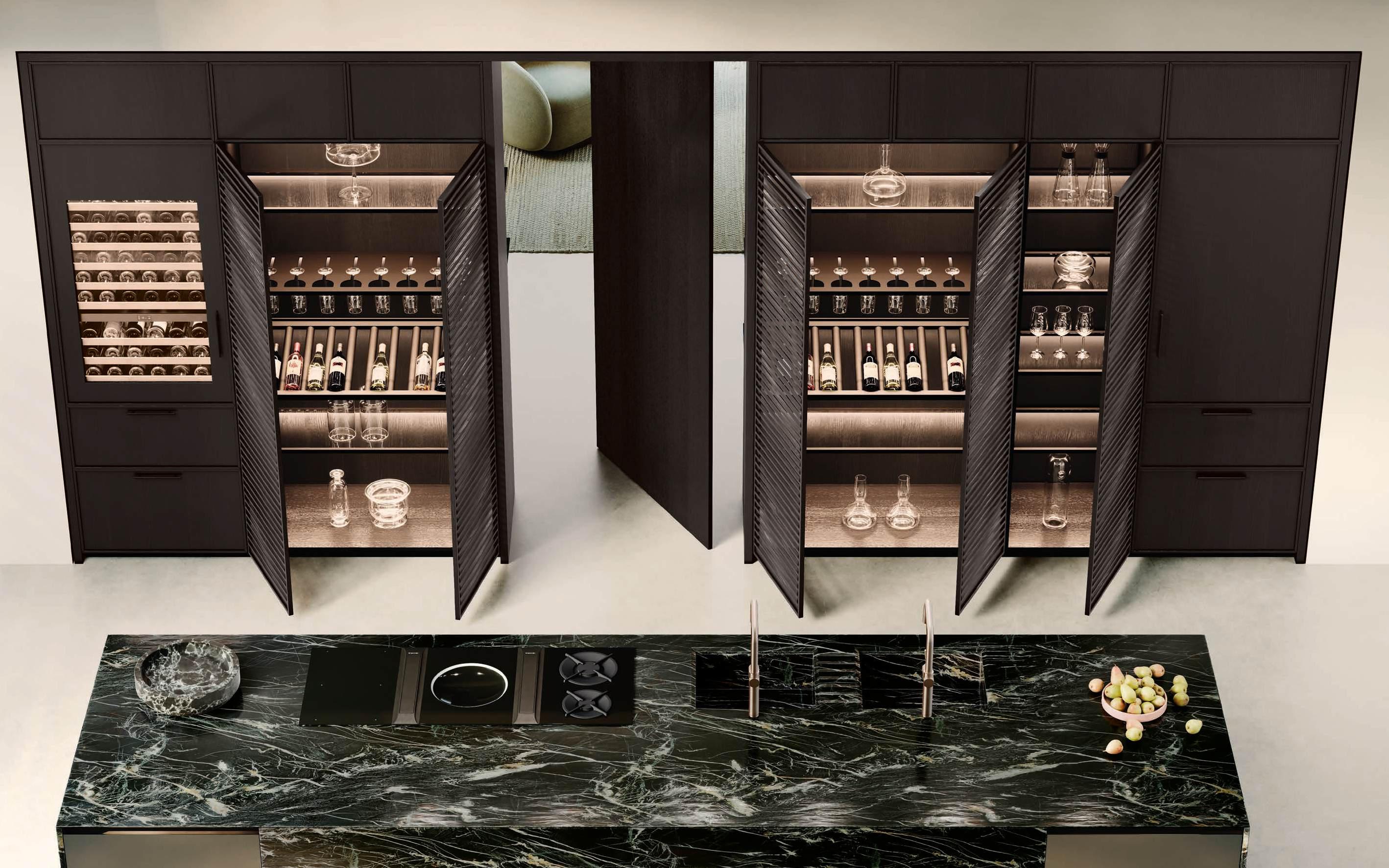 The Bluna Laccato Metal 4.0 storage columns in Piombo finish provide a central workspace with integrated sink, while the glazed side columns house the wine cellar in the centre.