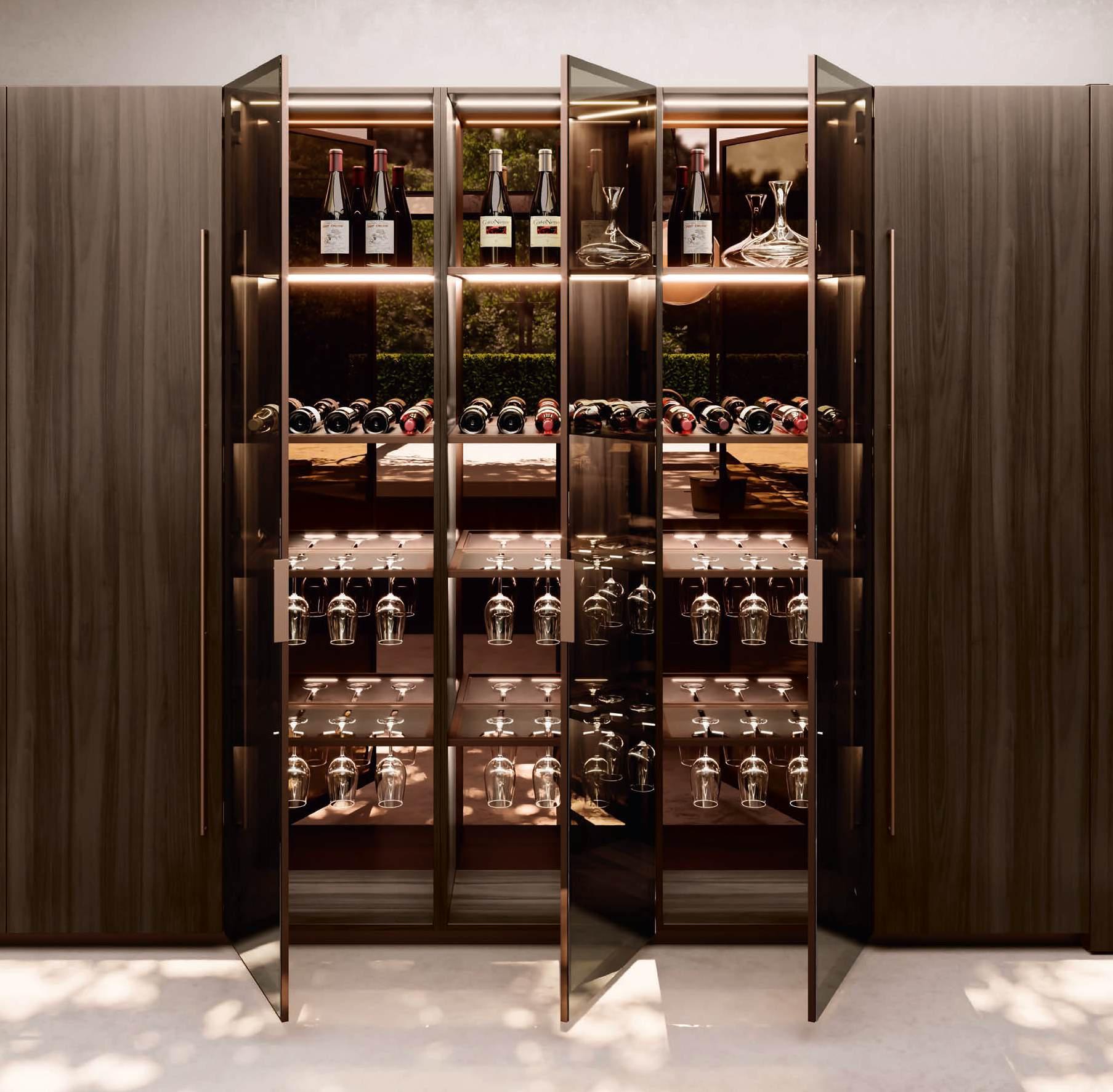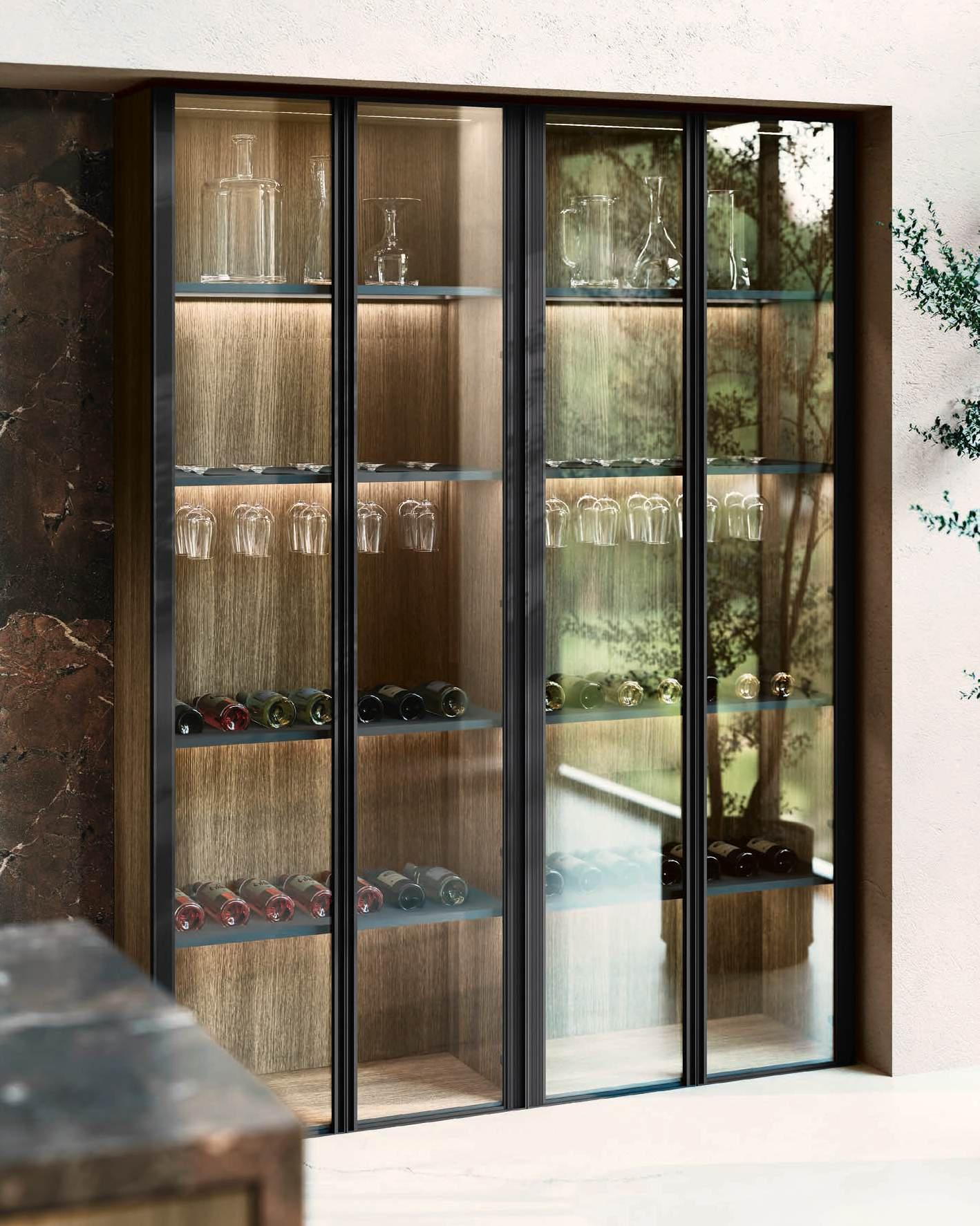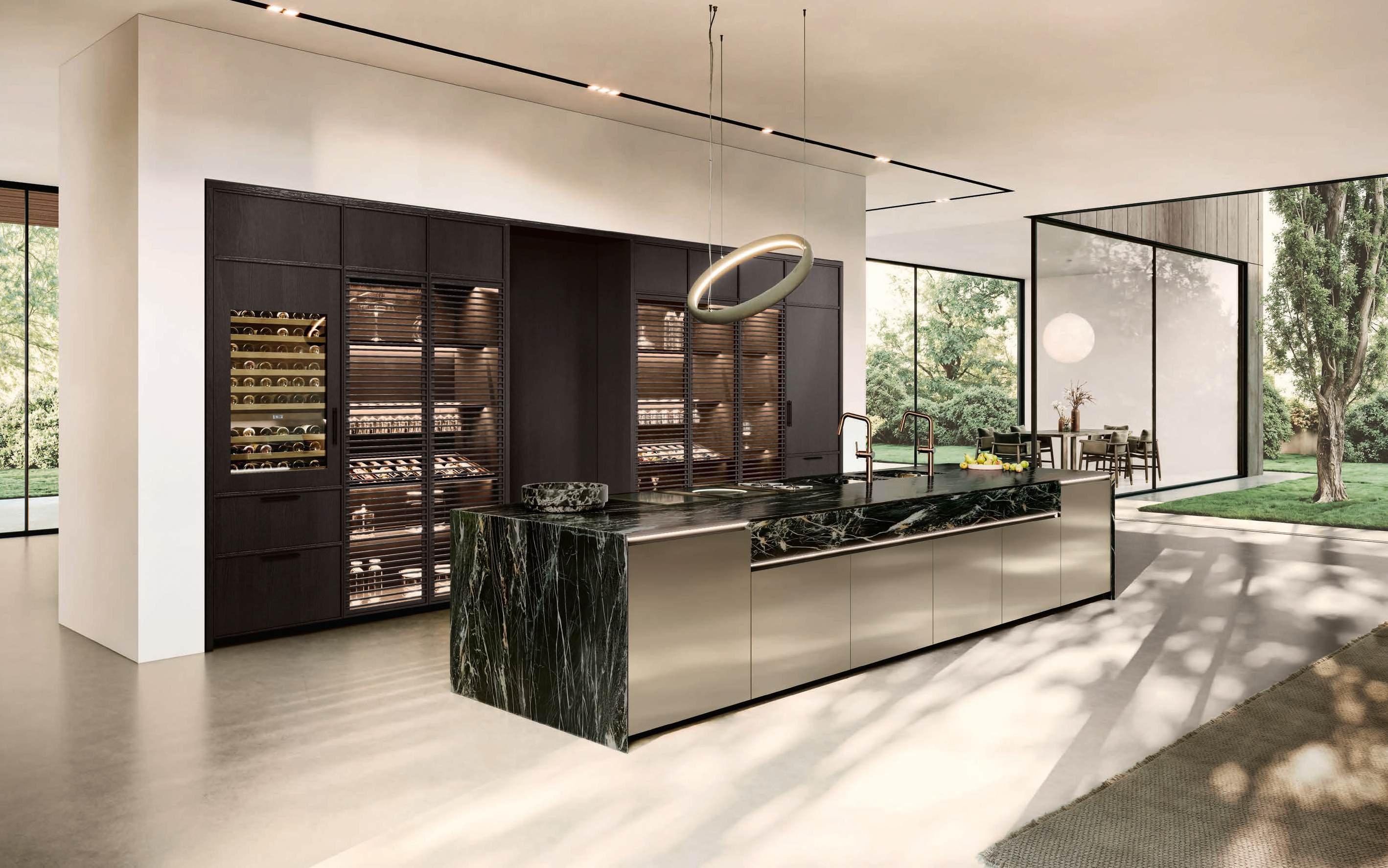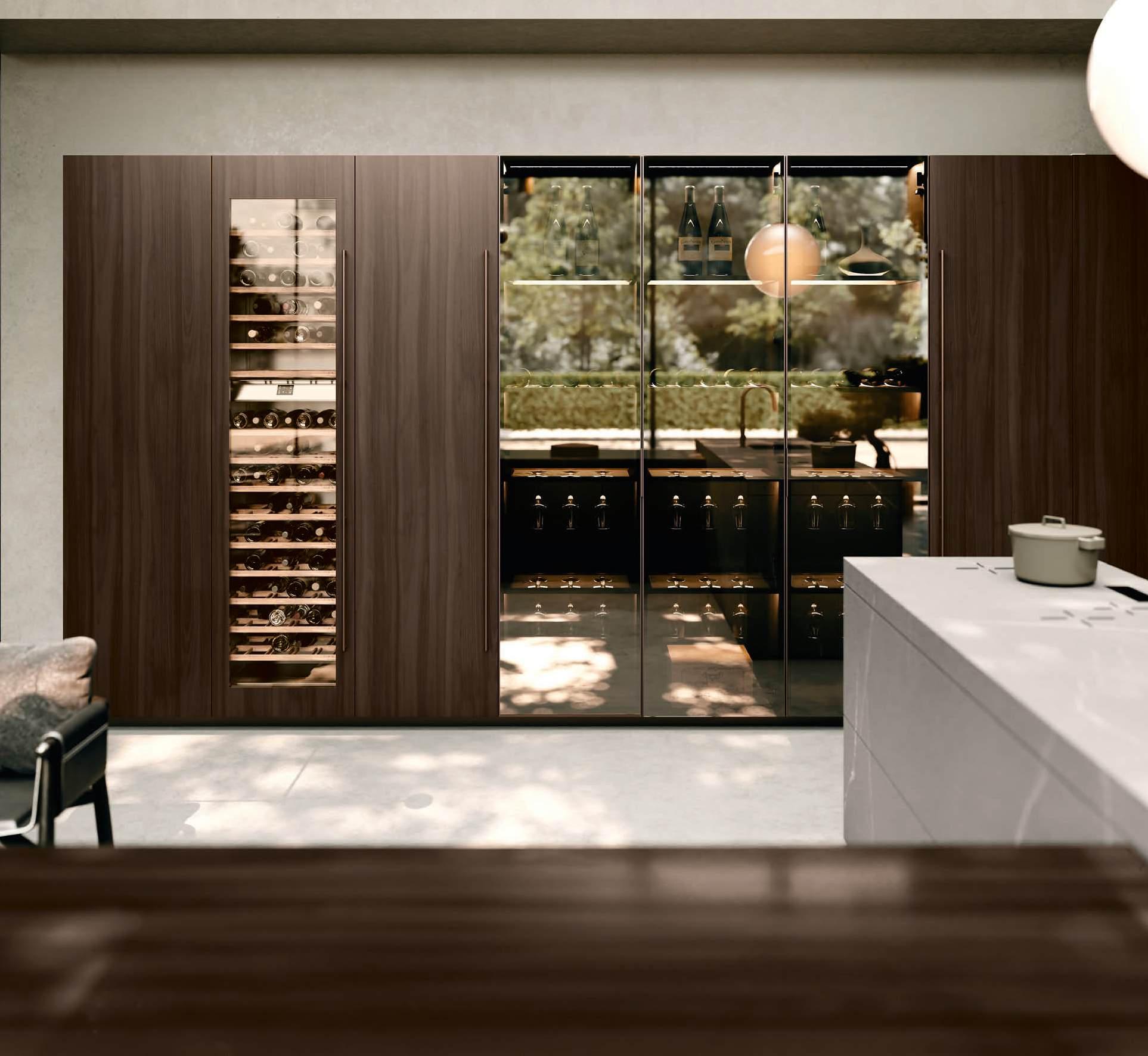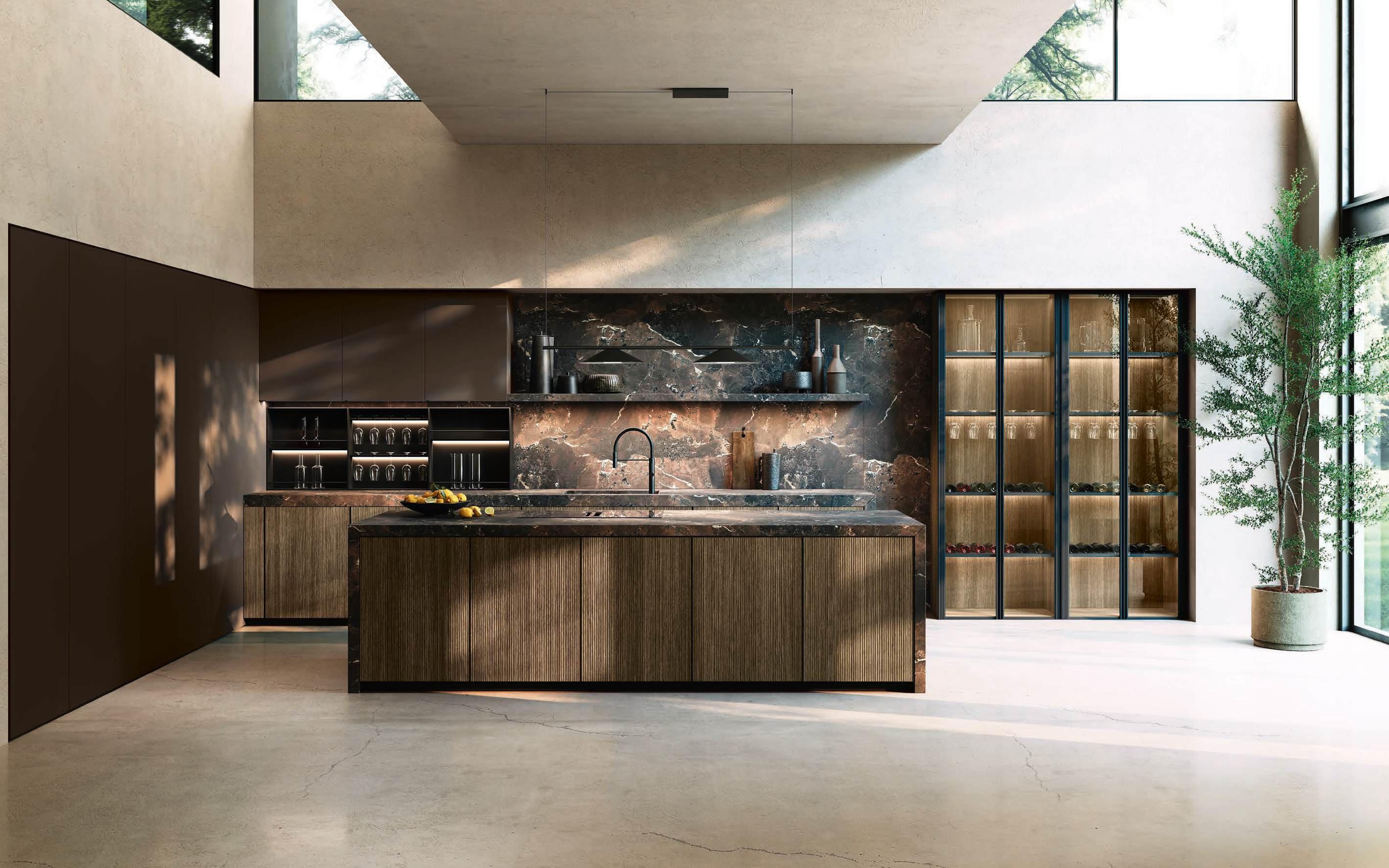 The Bluna Laccato Metal 4.0 storage columns in Piombo finish provide a central workspace with integrated sink, while the glazed side columns house the wine cellar in the centre.