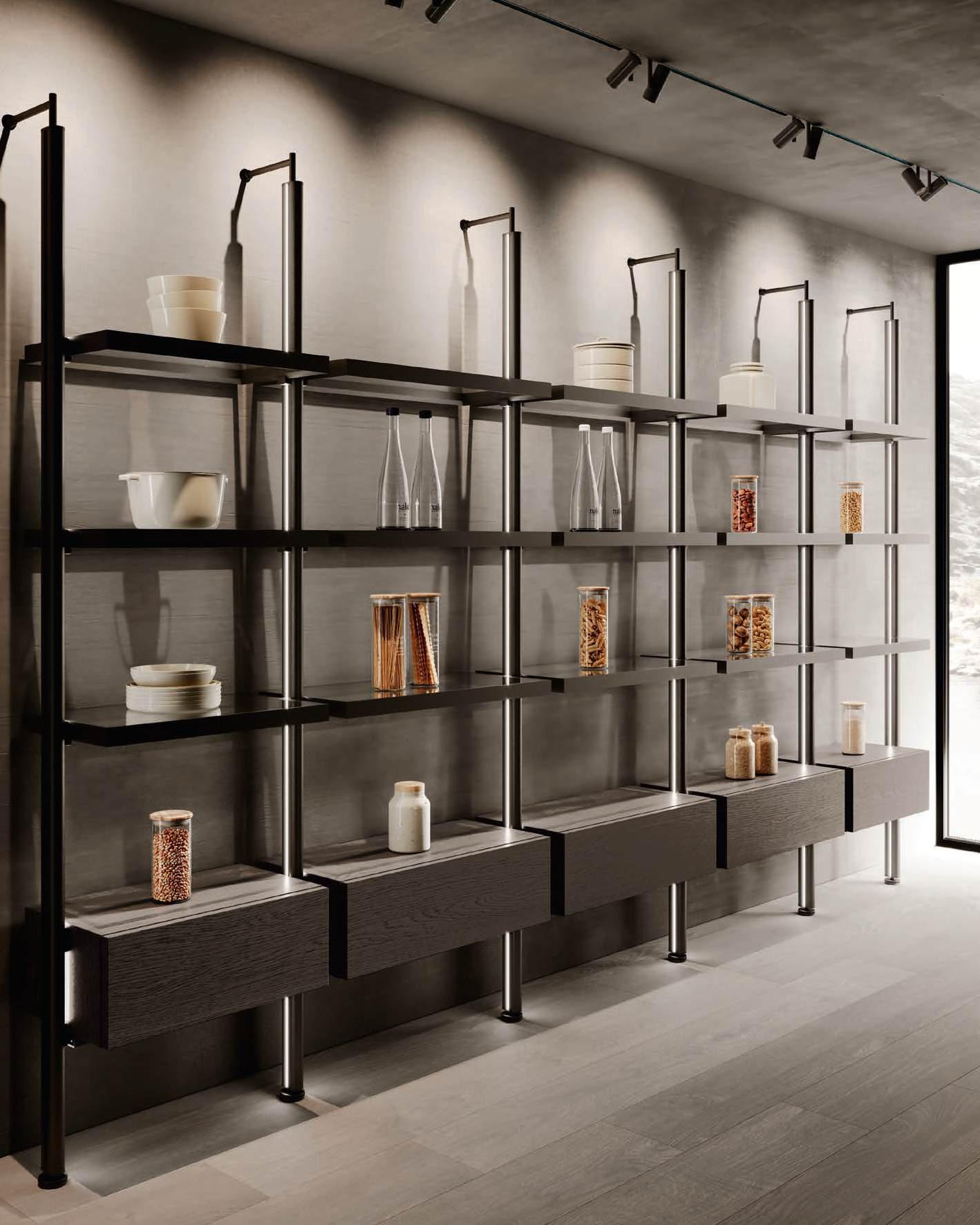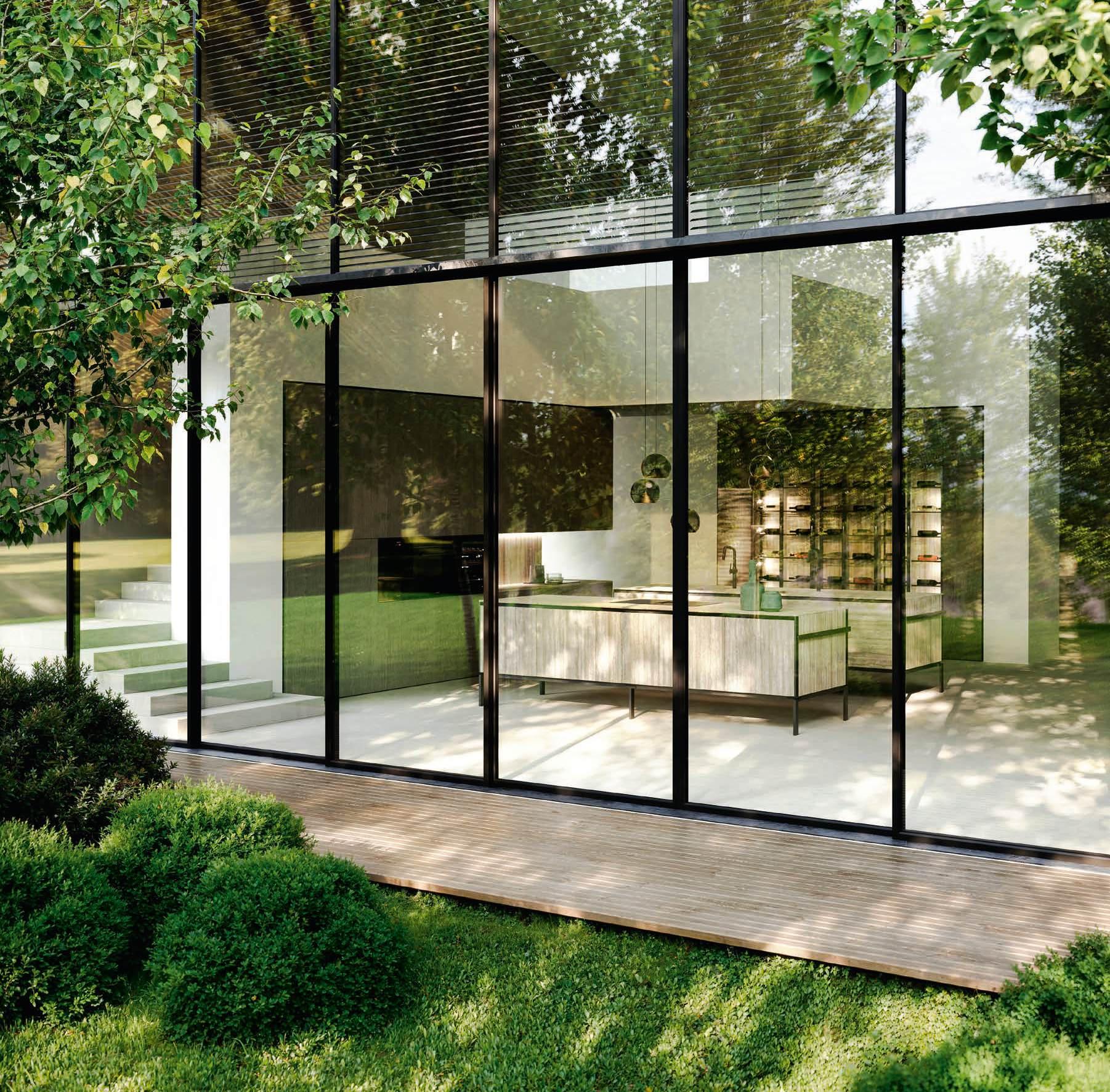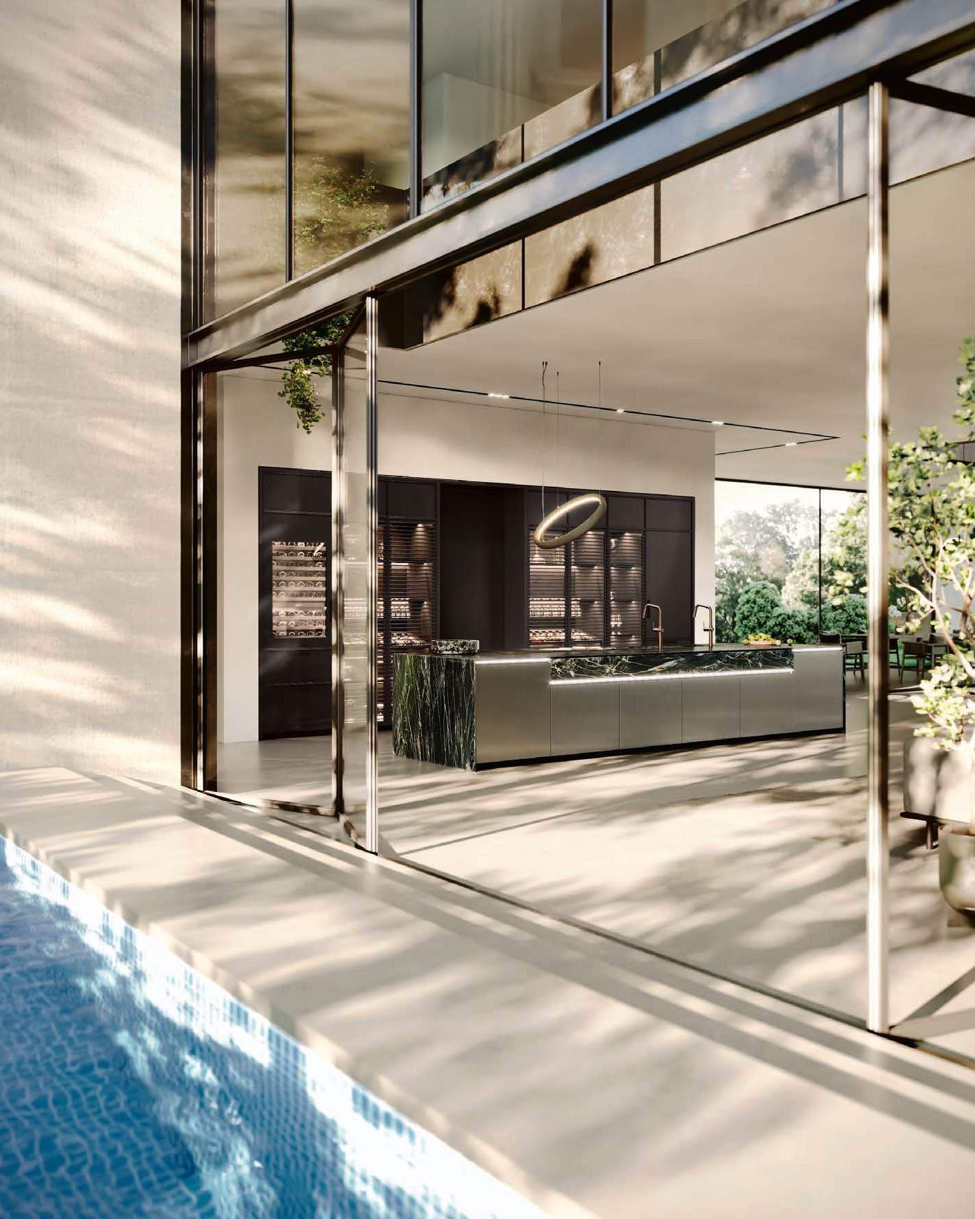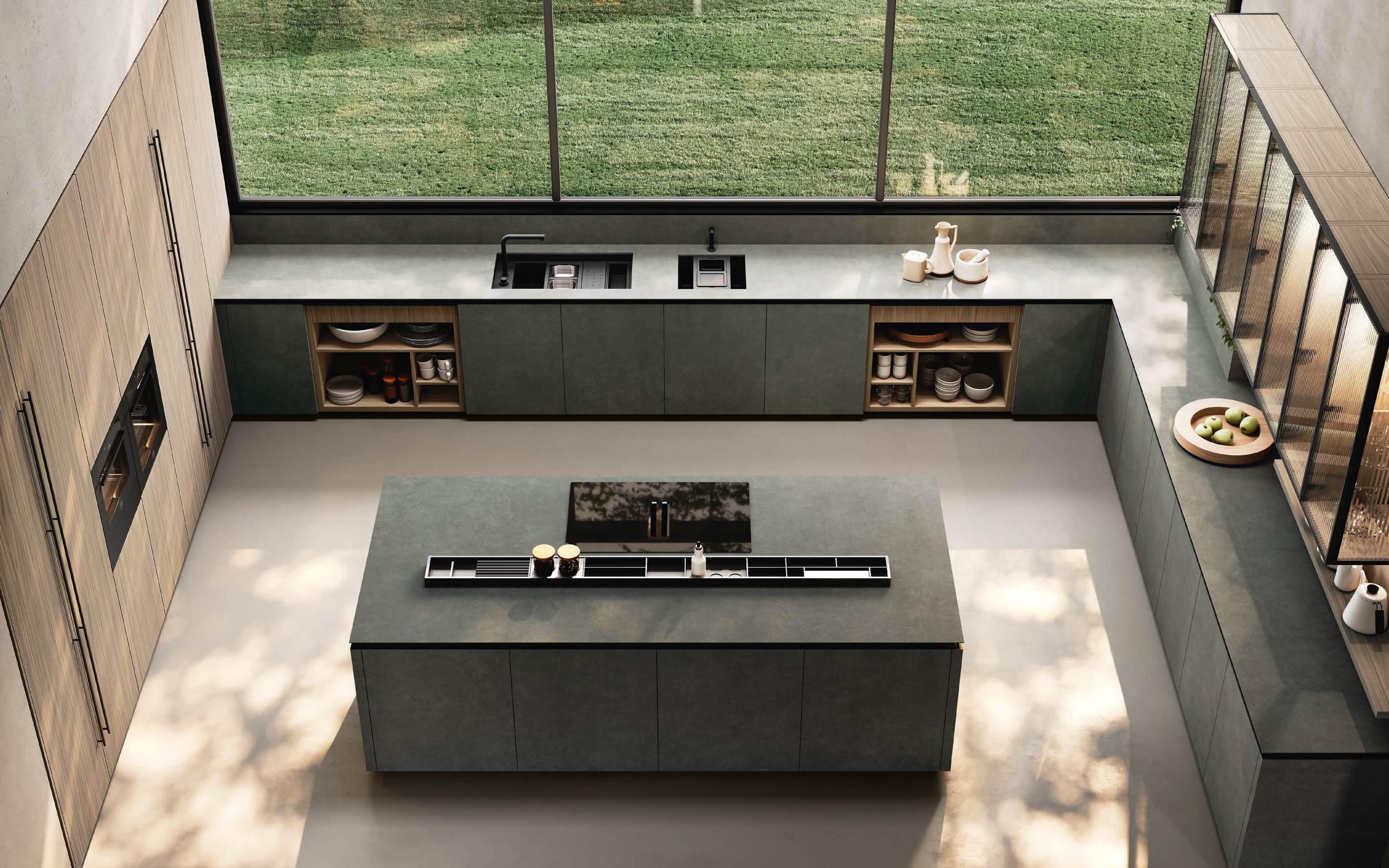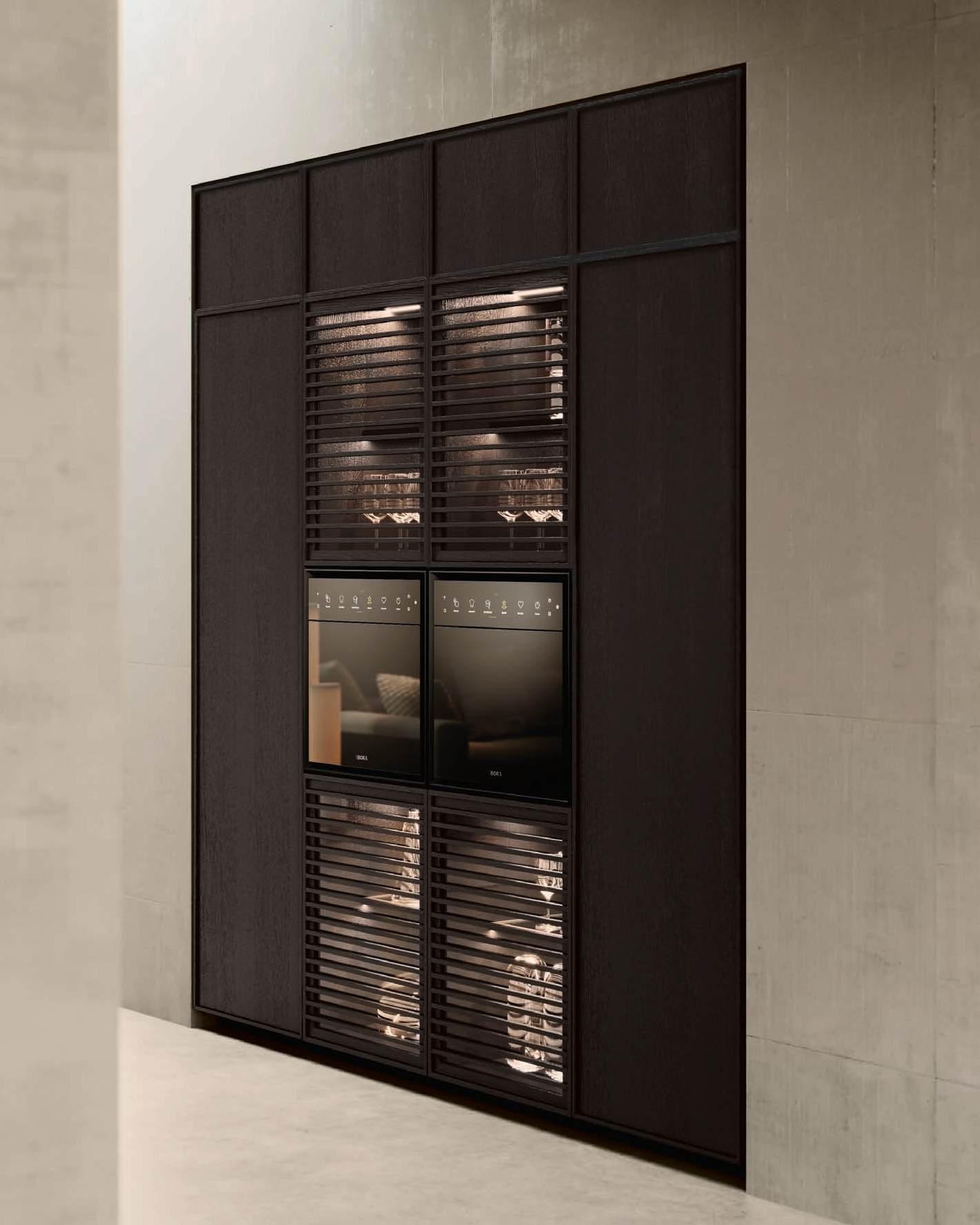 The Bluna Laccato Metal 4.0 storage columns in Piombo finish provide a central workspace with integrated sink, while the glazed side columns house the wine cellar in the centre.