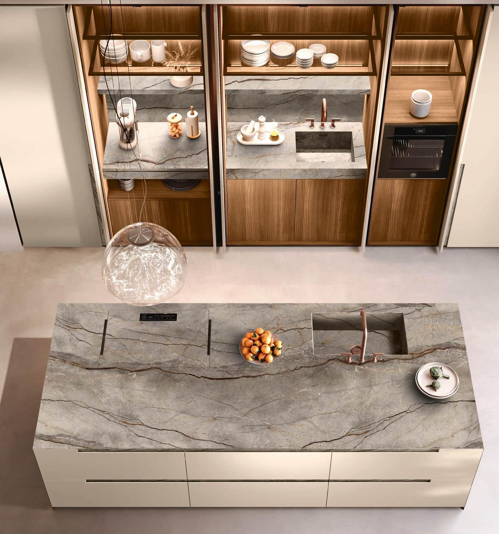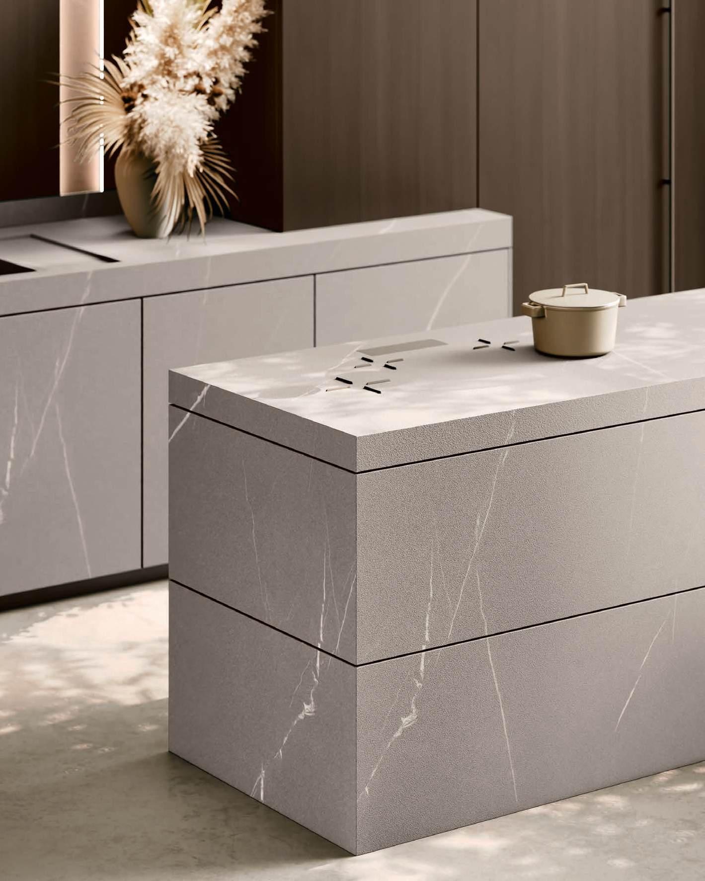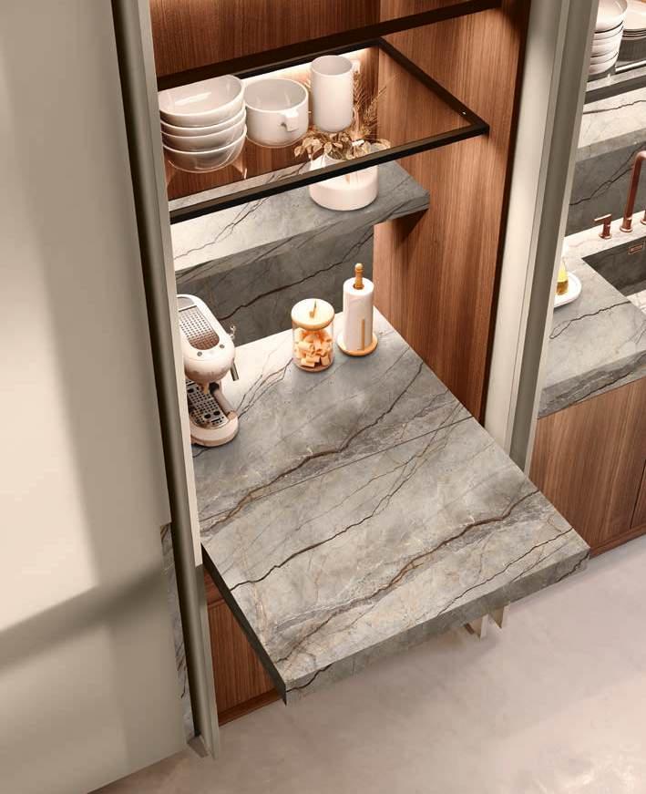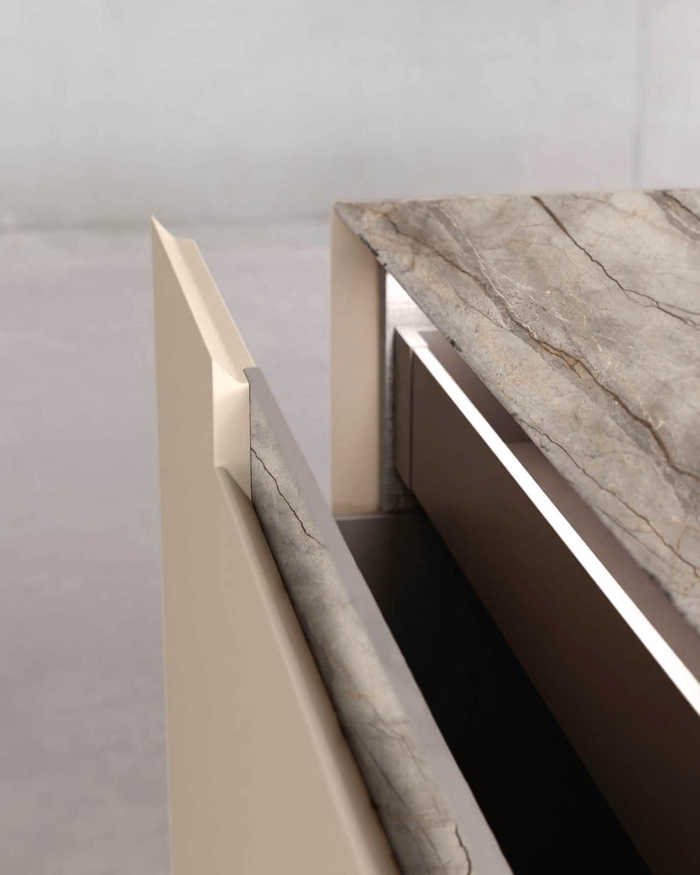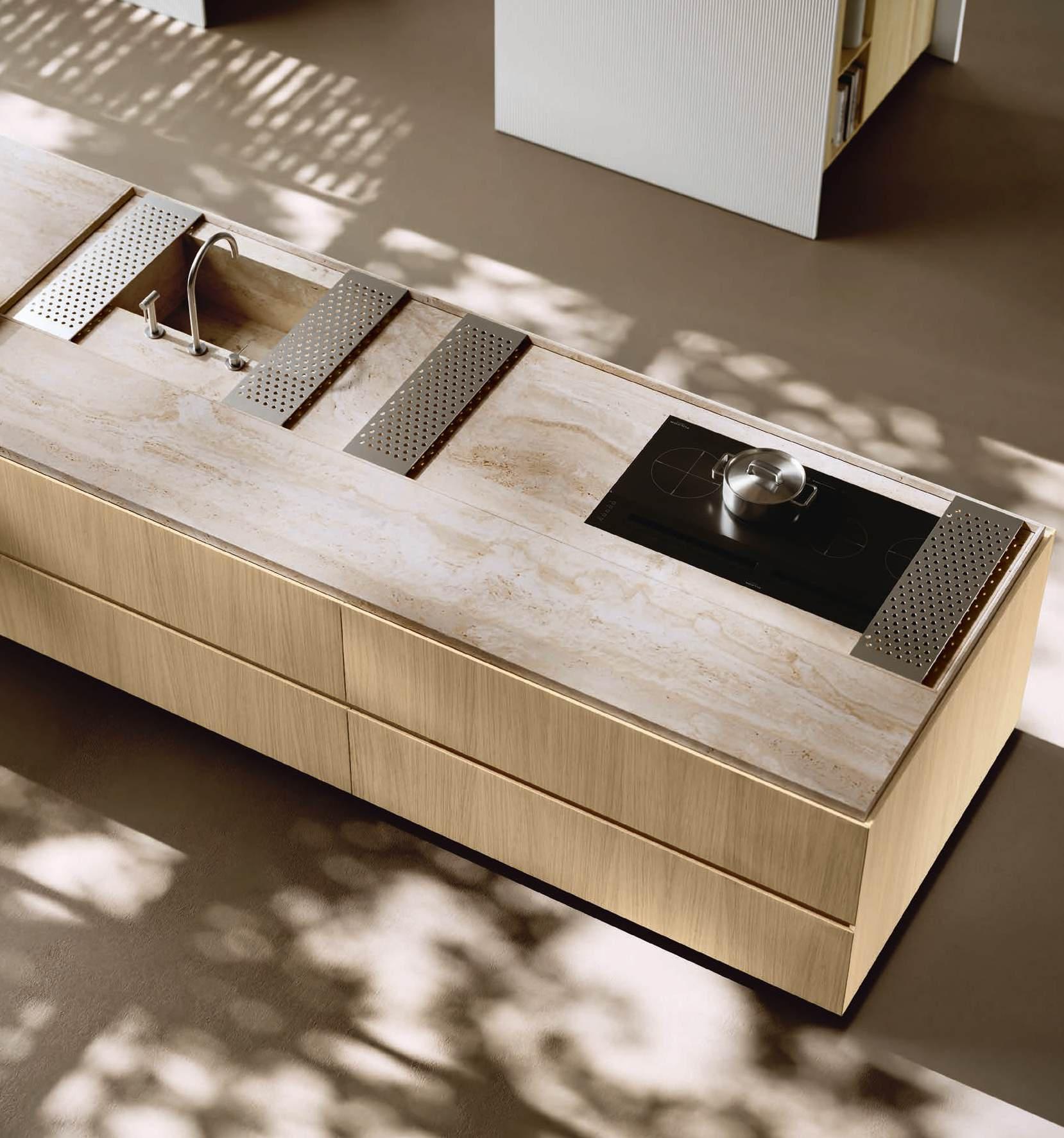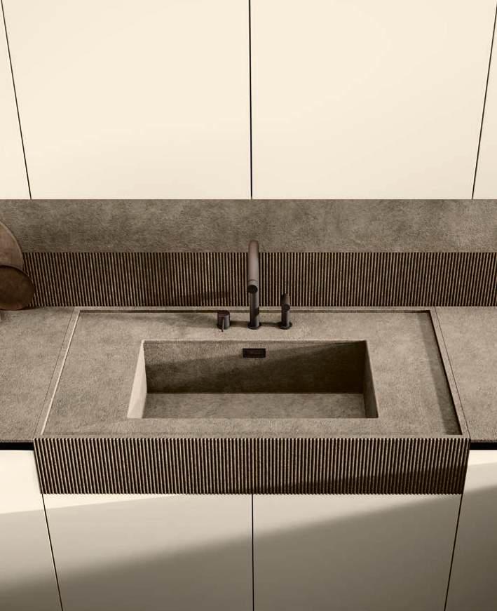 The Bluna doors, milled at the top to create the Wey profile, allow for easy and effortless opening, while the Duna profile worktop in Gres Travertino Bianco Bocciardato offers sophisticated aesthetics and unparalleled durability.