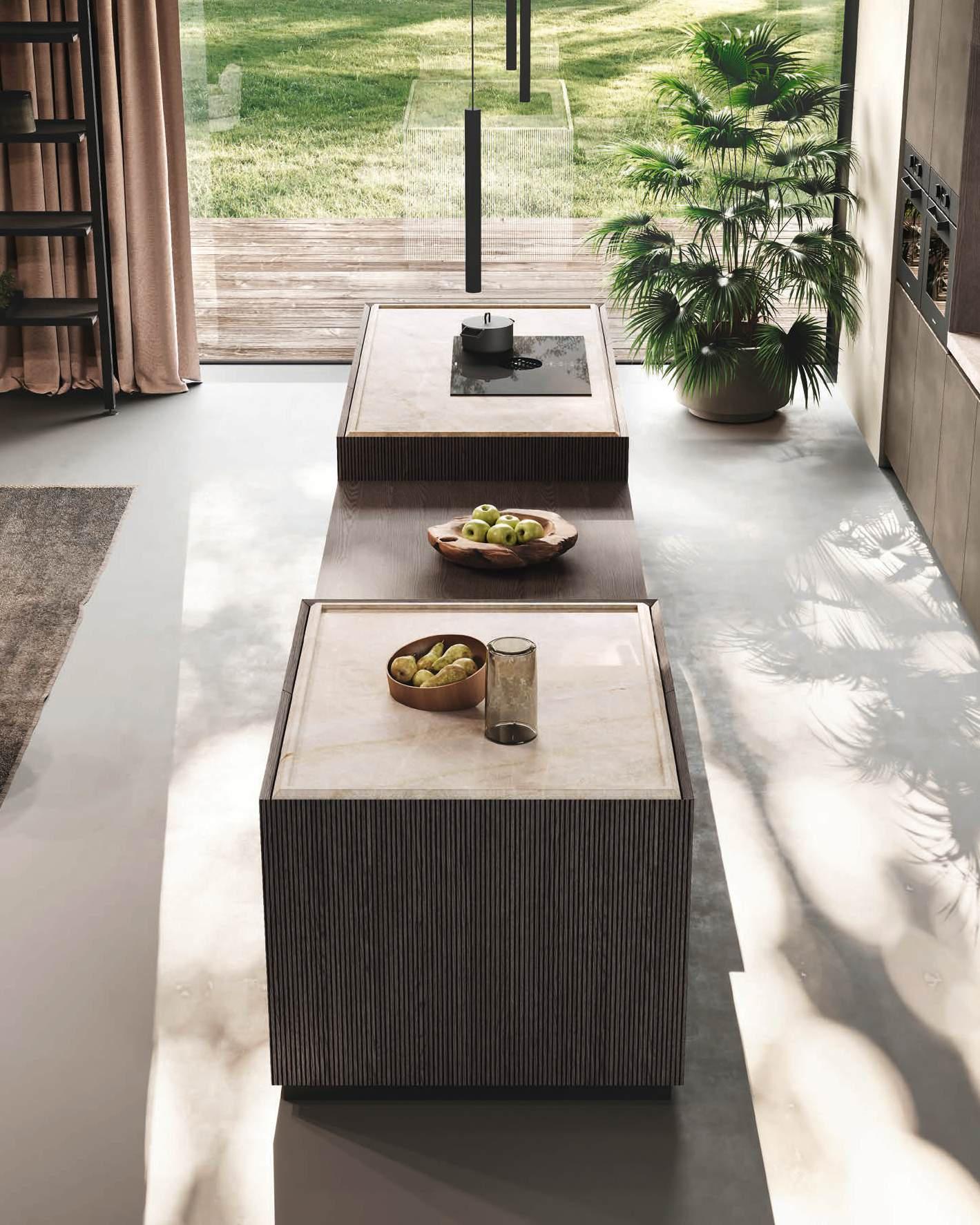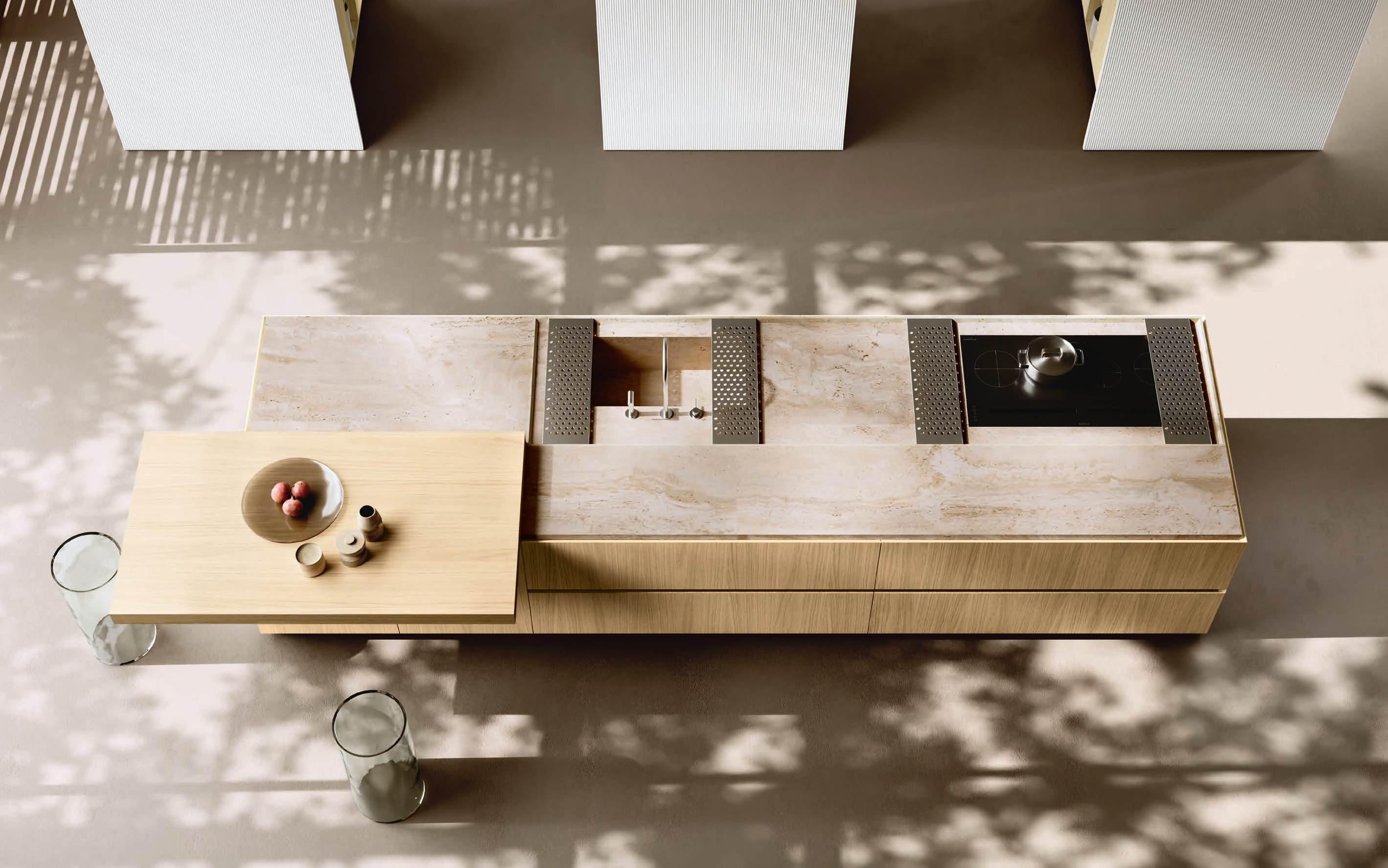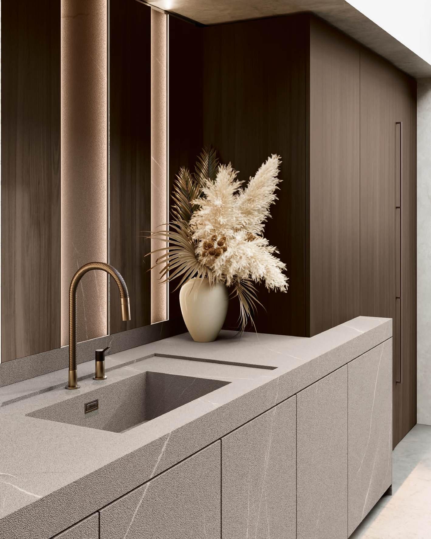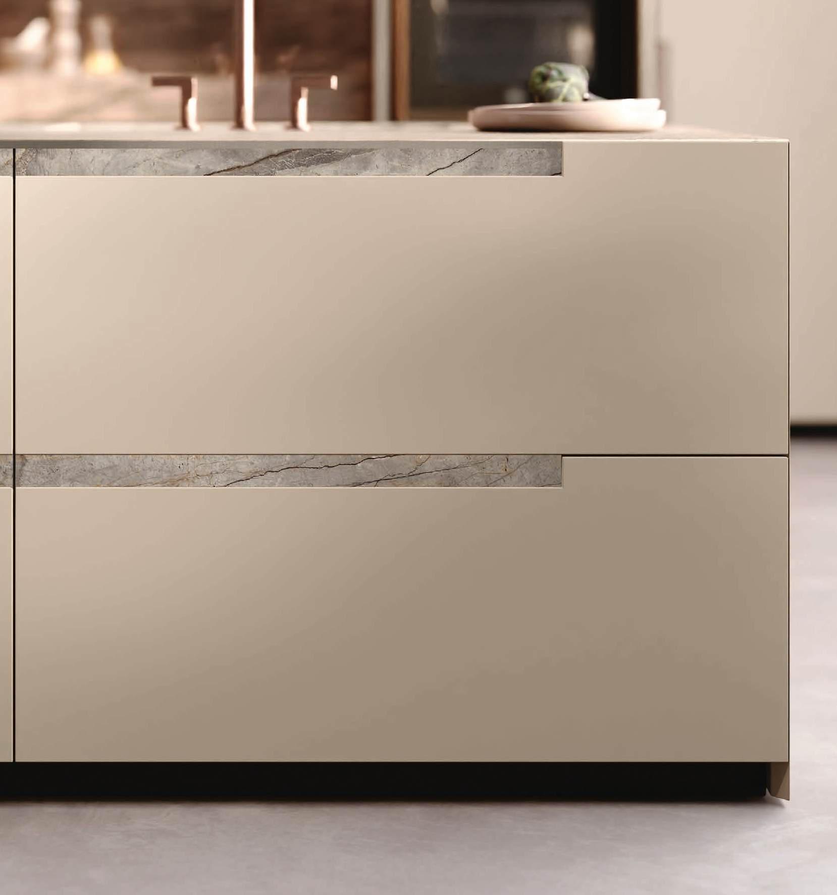 The Bluna doors, milled at the top to create the Wey profile, allow for easy and effortless opening, while the Duna profile worktop in Gres Travertino Bianco Bocciardato offers sophisticated aesthetics and unparalleled durability.