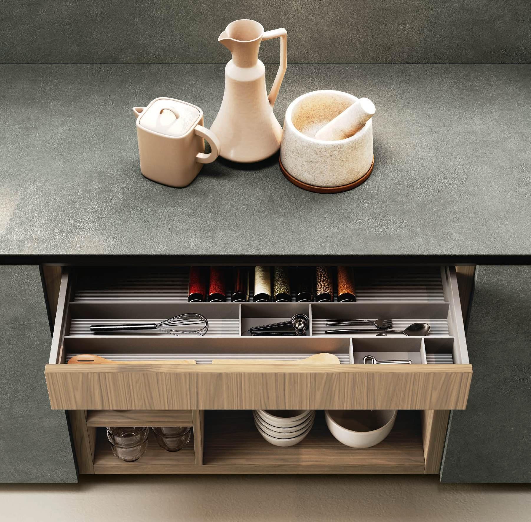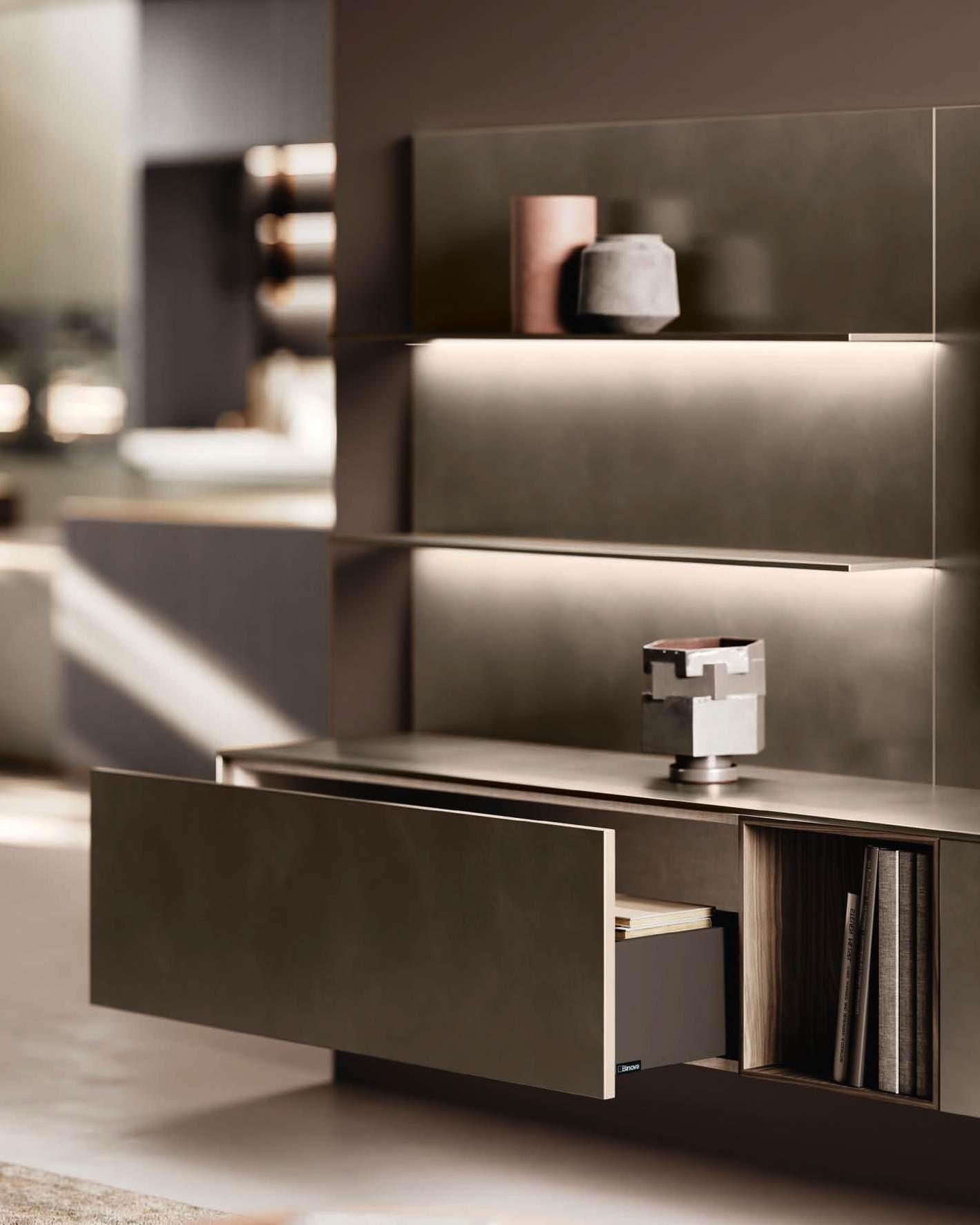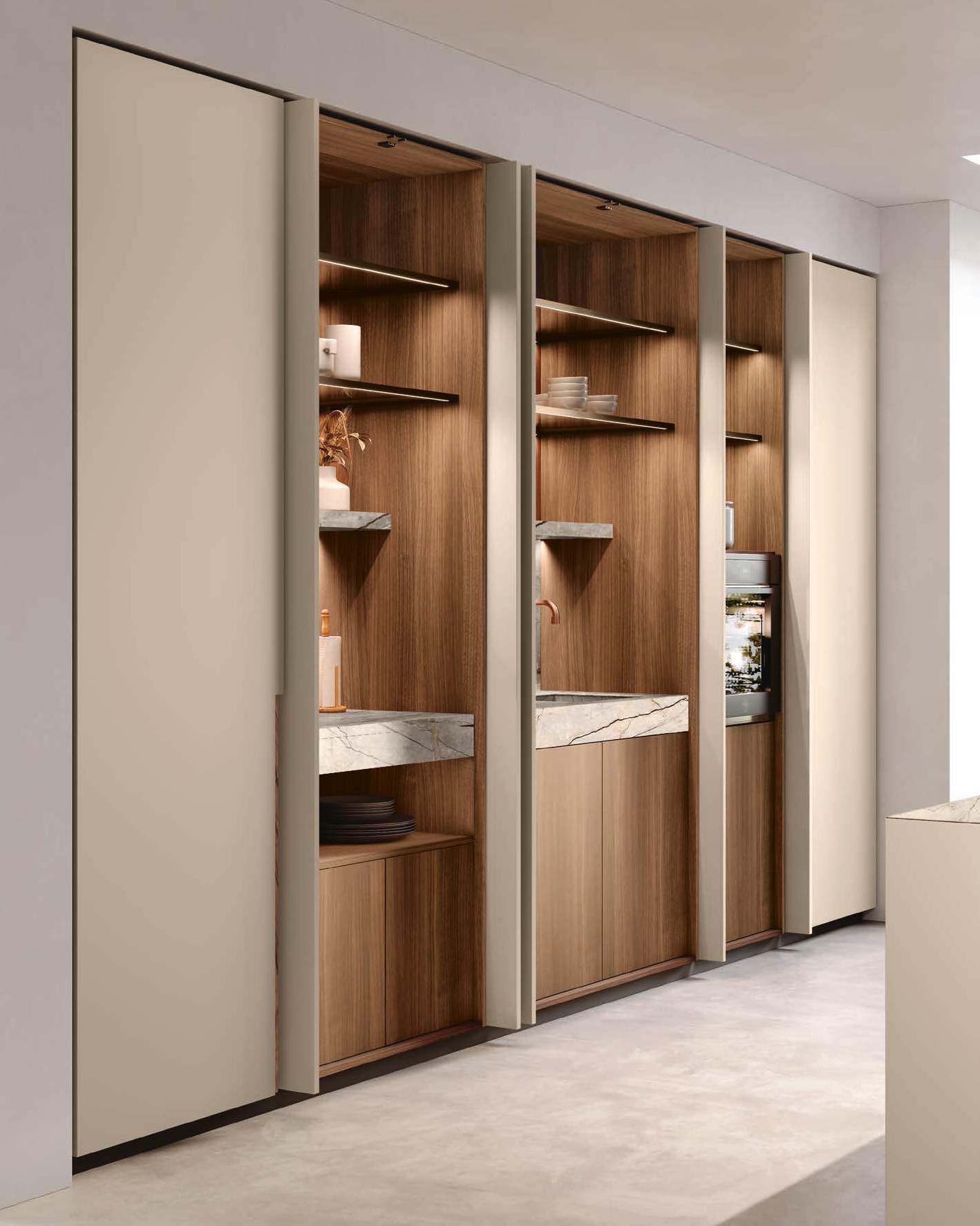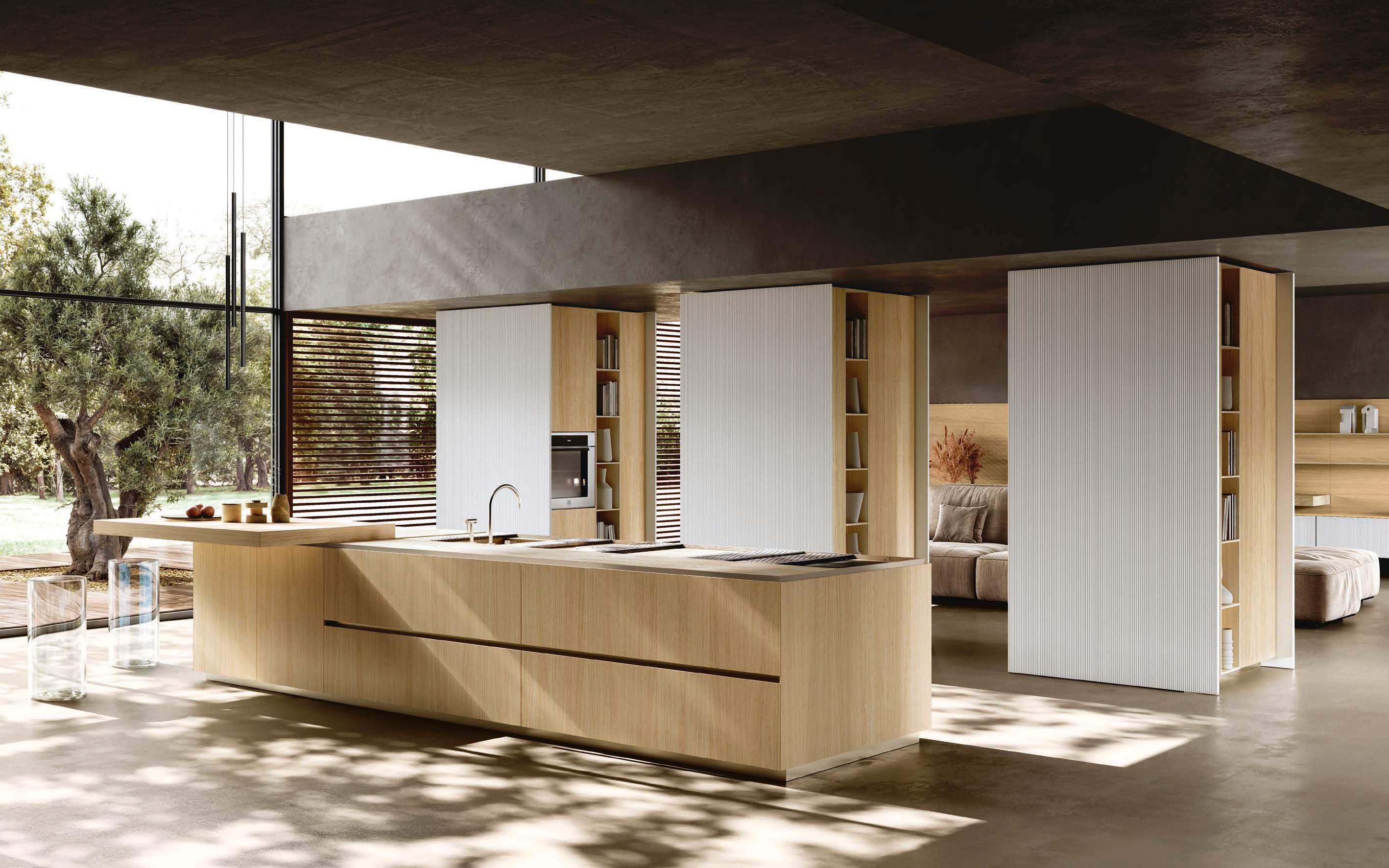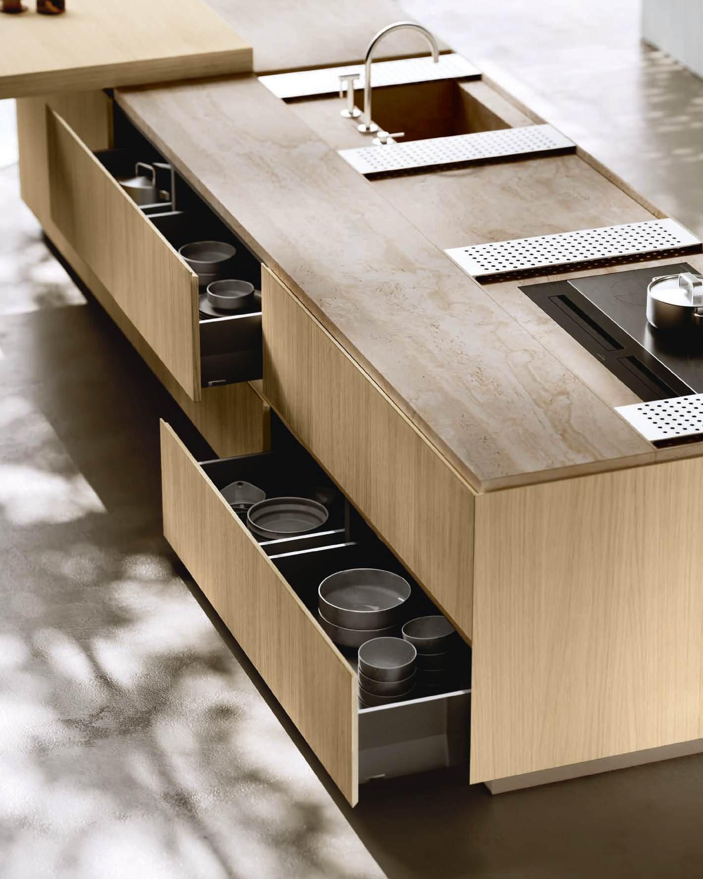 The Bluna doors, milled at the top to create the Wey profile, allow for easy and effortless opening, while the Duna profile worktop in Gres Travertino Bianco Bocciardato offers sophisticated aesthetics and unparalleled durability.