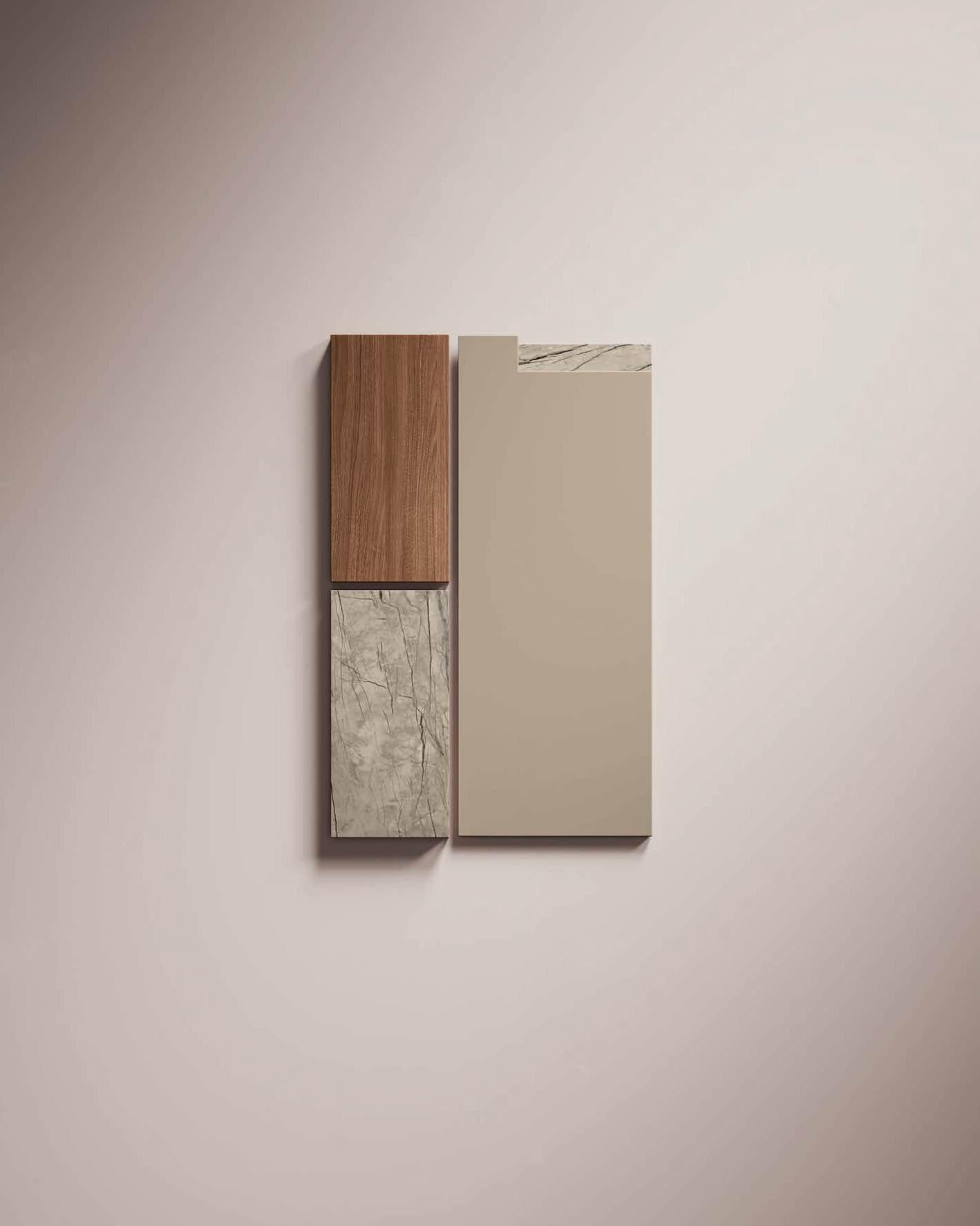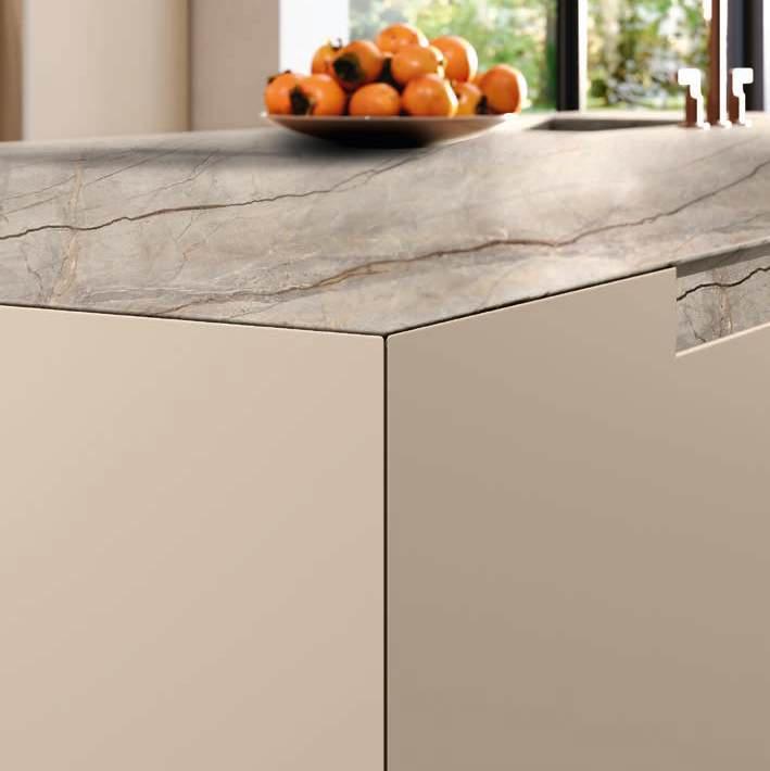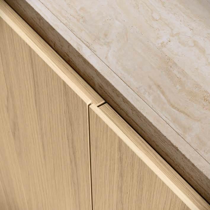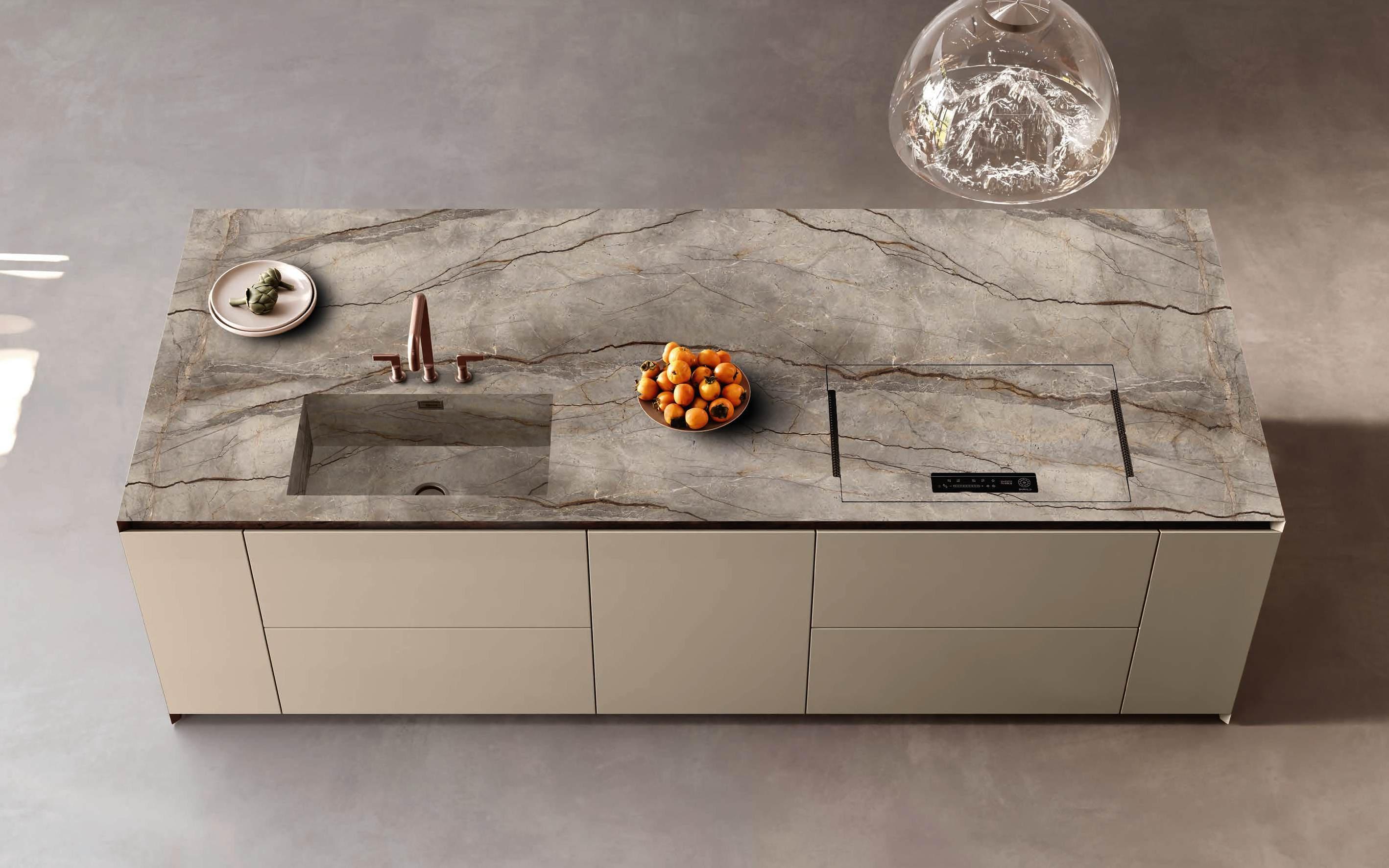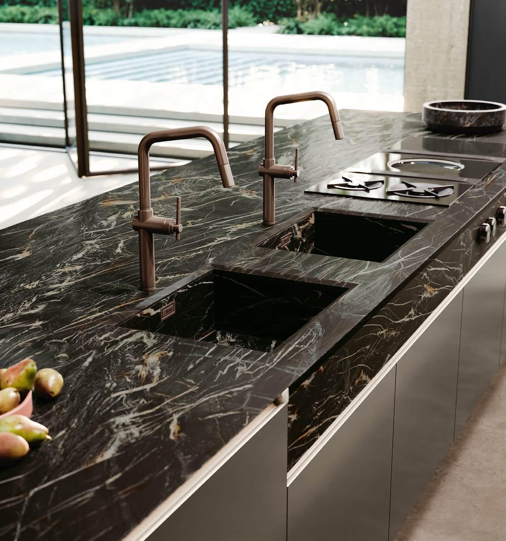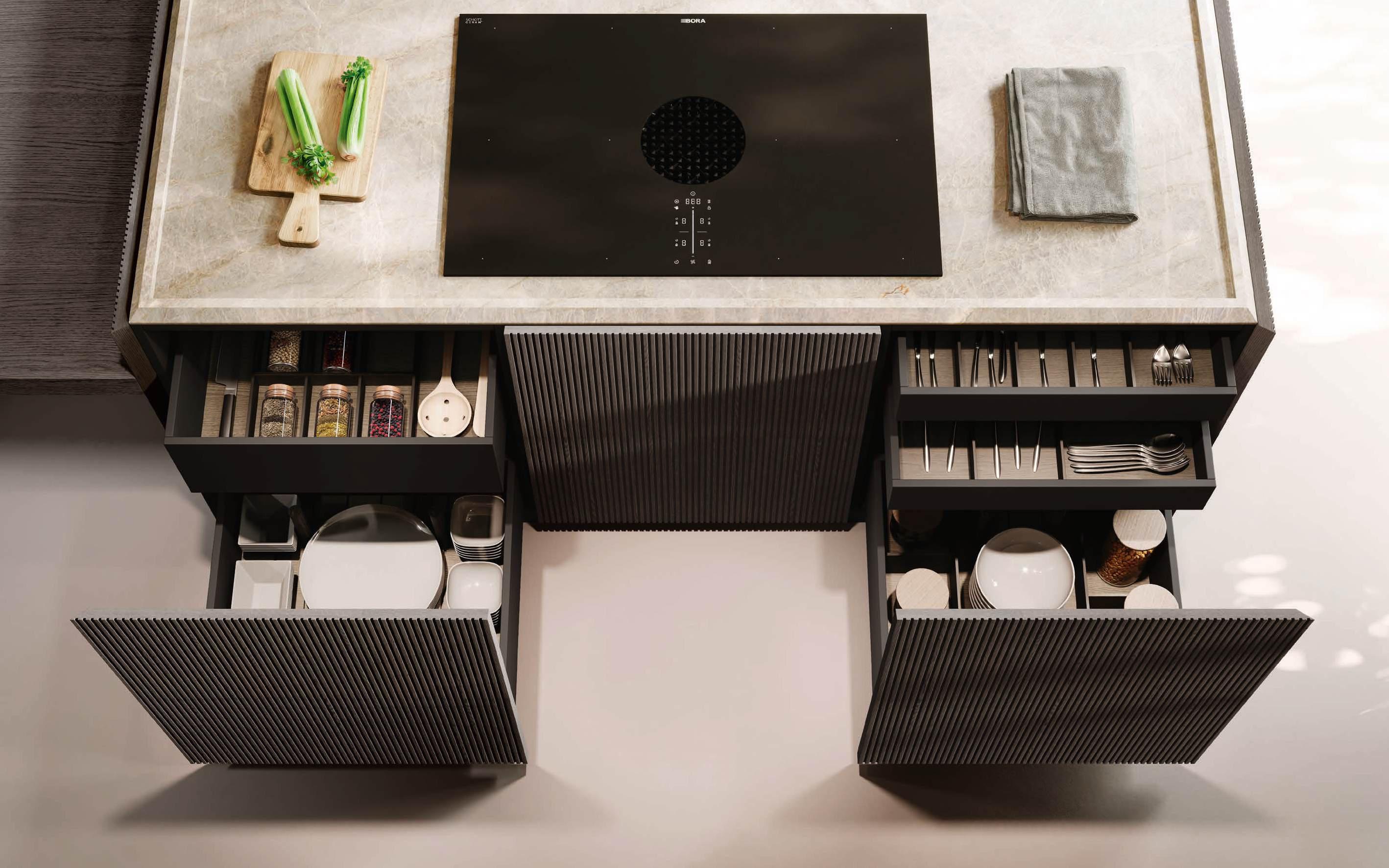 The Bluna doors, milled at the top to create the Wey profile, allow for easy and effortless opening, while the Duna profile worktop in Gres Travertino Bianco Bocciardato offers sophisticated aesthetics and unparalleled durability.