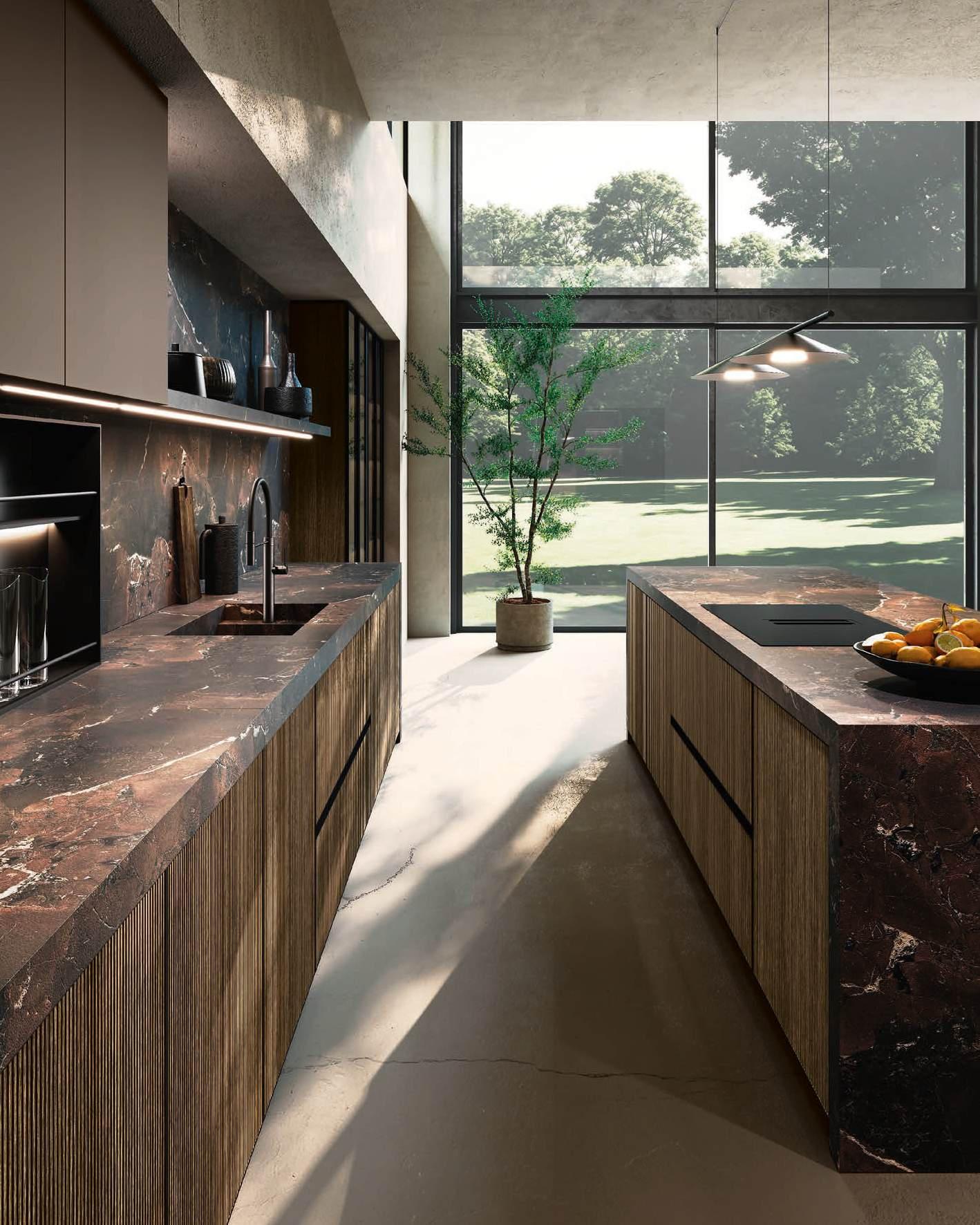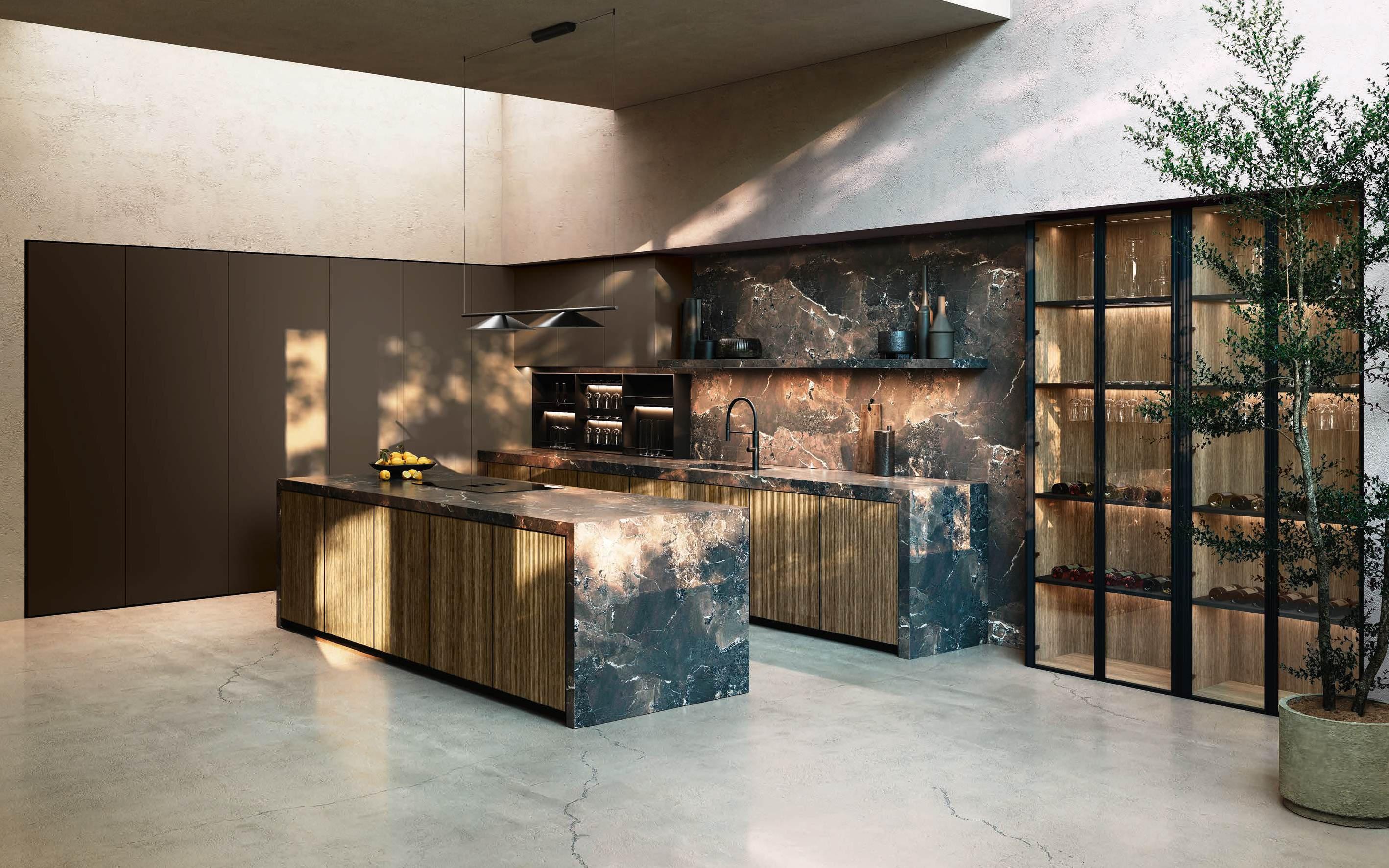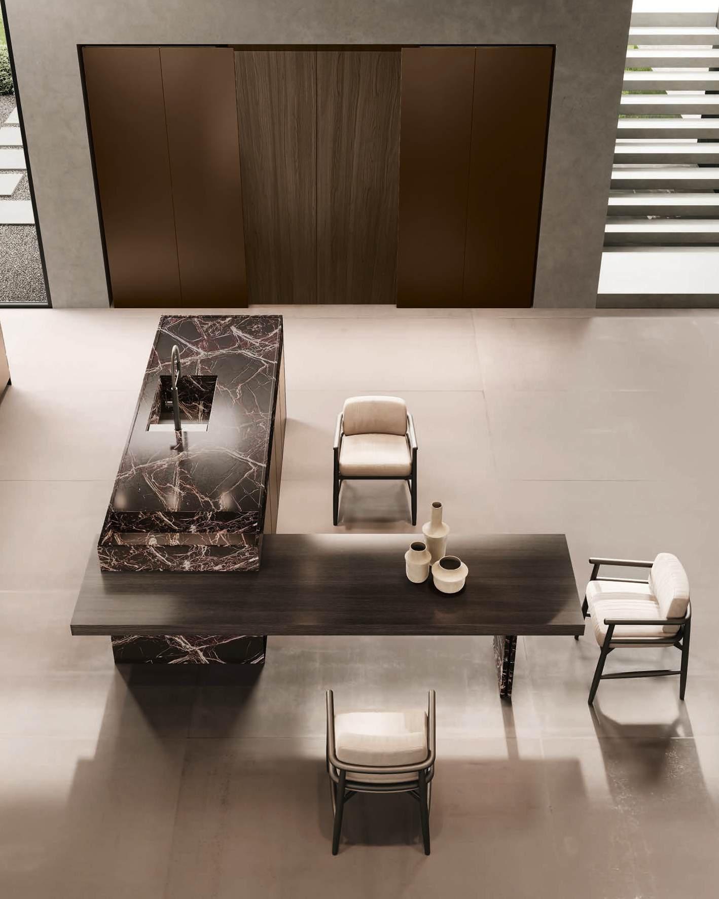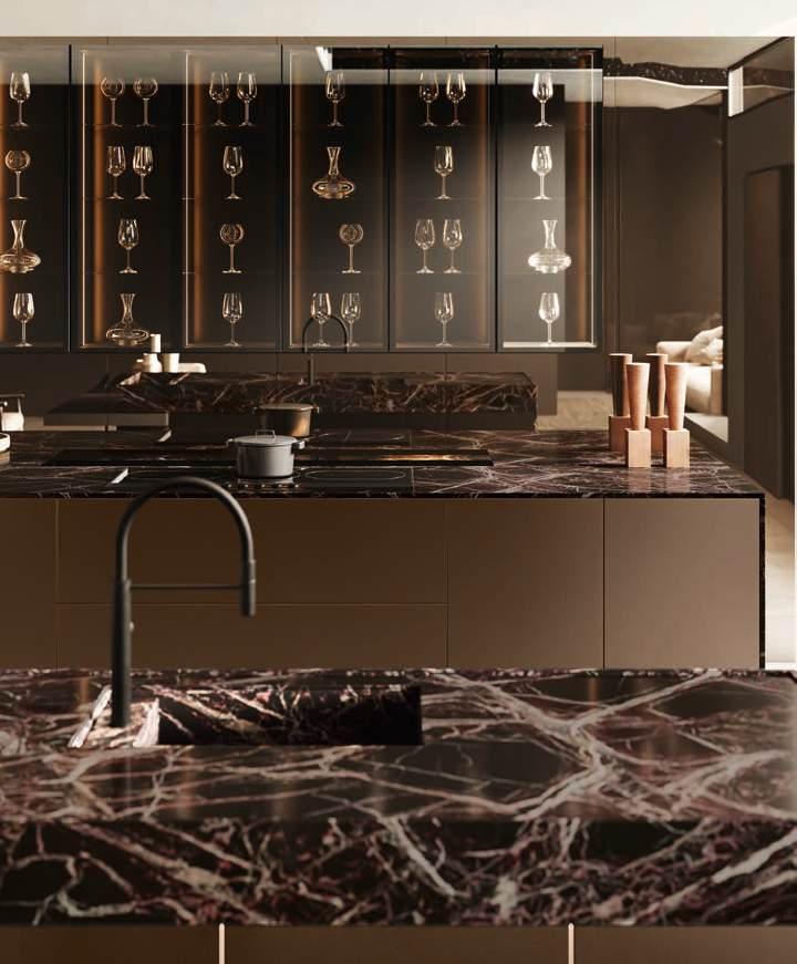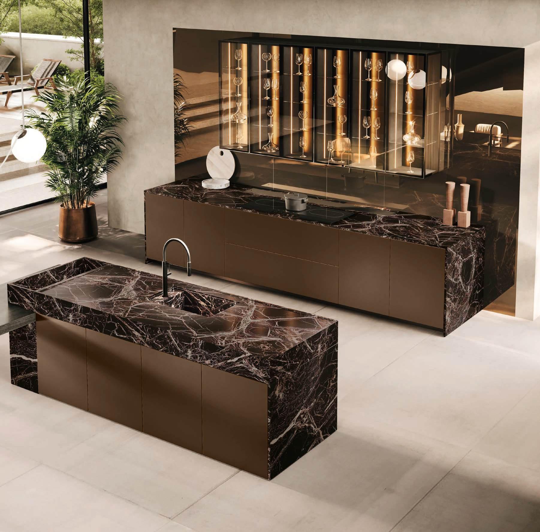 Bluna Tech Alluminio Brunito offers a culinary experience of comfort and quality, enhanced by two stations unified through a masterful pairing of contrasting textures and precious materials. The magnetic allure of both the island and the linear wallmounted kitchen derives from both the stone cladding and the special treatment of the fronts. On one side, the natural stone countertop, brushed Rosso Levanto, captivates with its elegance and innovative details, such as the terminal basin, perfect for housing aromatic plants or bottles of champagne. On the other, the technical sophistication of the Bluna Tech Alluminio Brunito doors imparts a distinctive personality and character to the project. Chic and unexpected details, such as the Petra glass-fronted wall units, further enrich the composition. The Bluna Tech Alluminio Brunito columns stand alongside the recessed Bluna Legno Rovere Corteccia doors, concealing multiple spaces within—spaces as varied as the emotions, performance, and functions that define the kitchen environment.