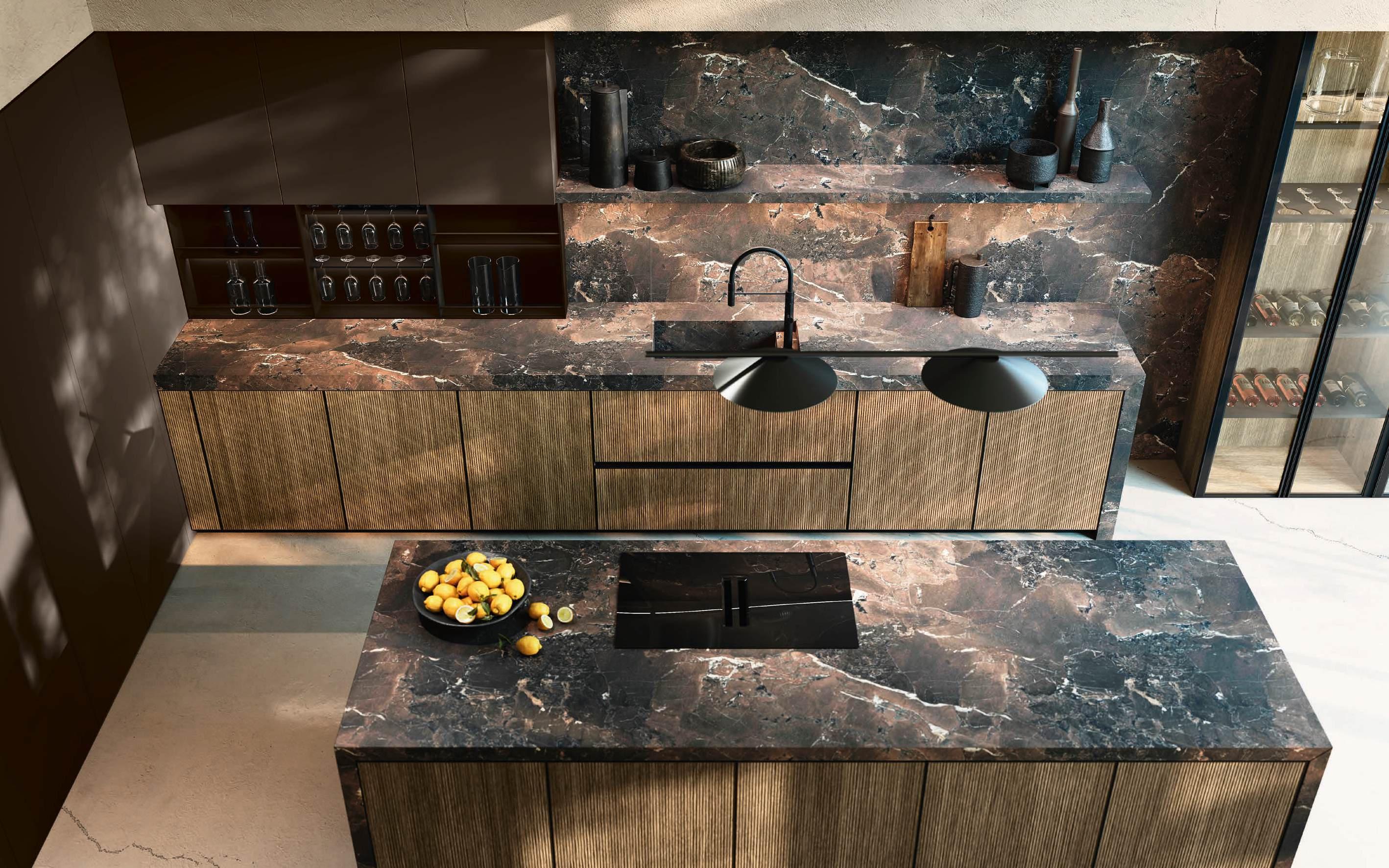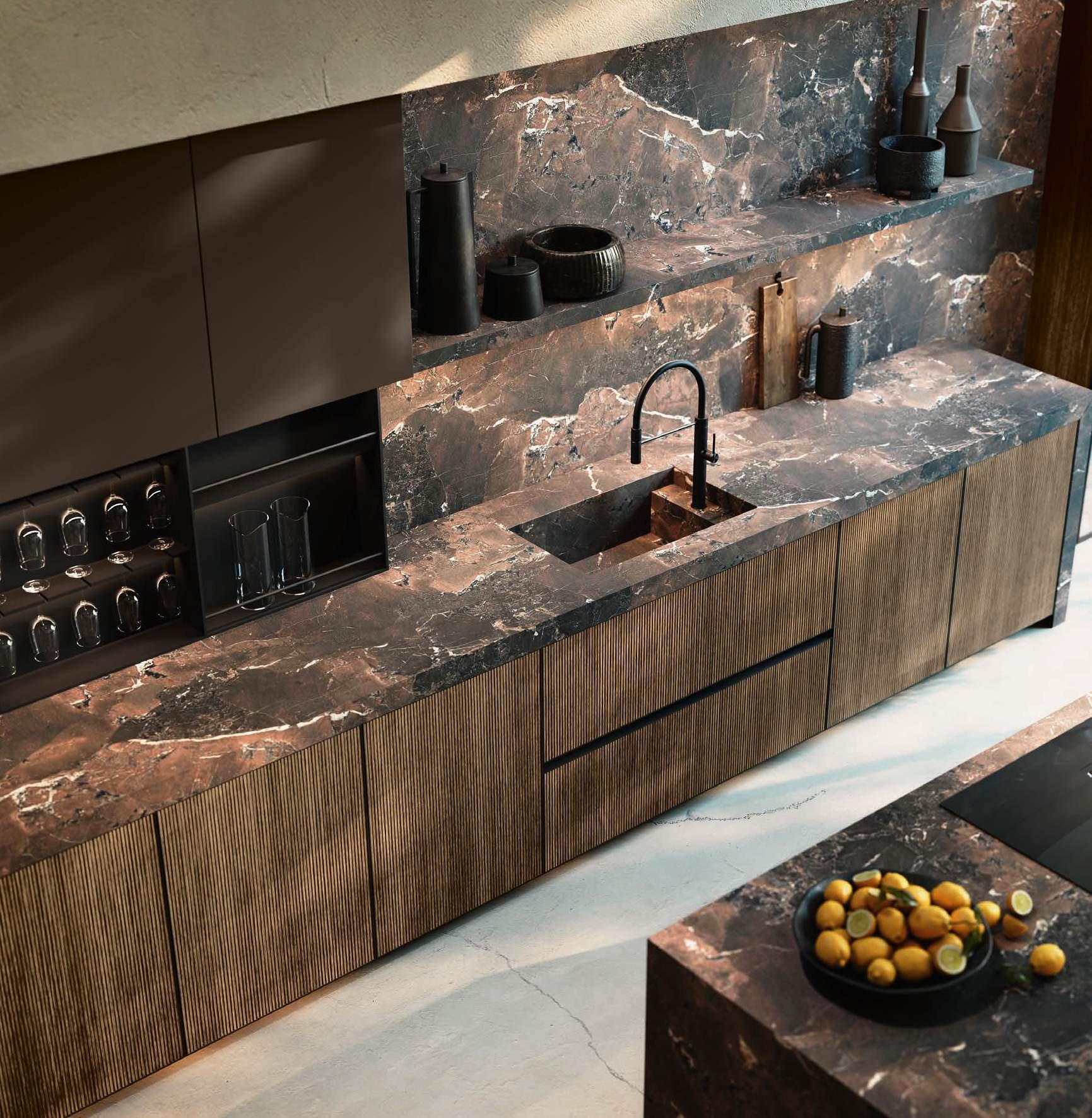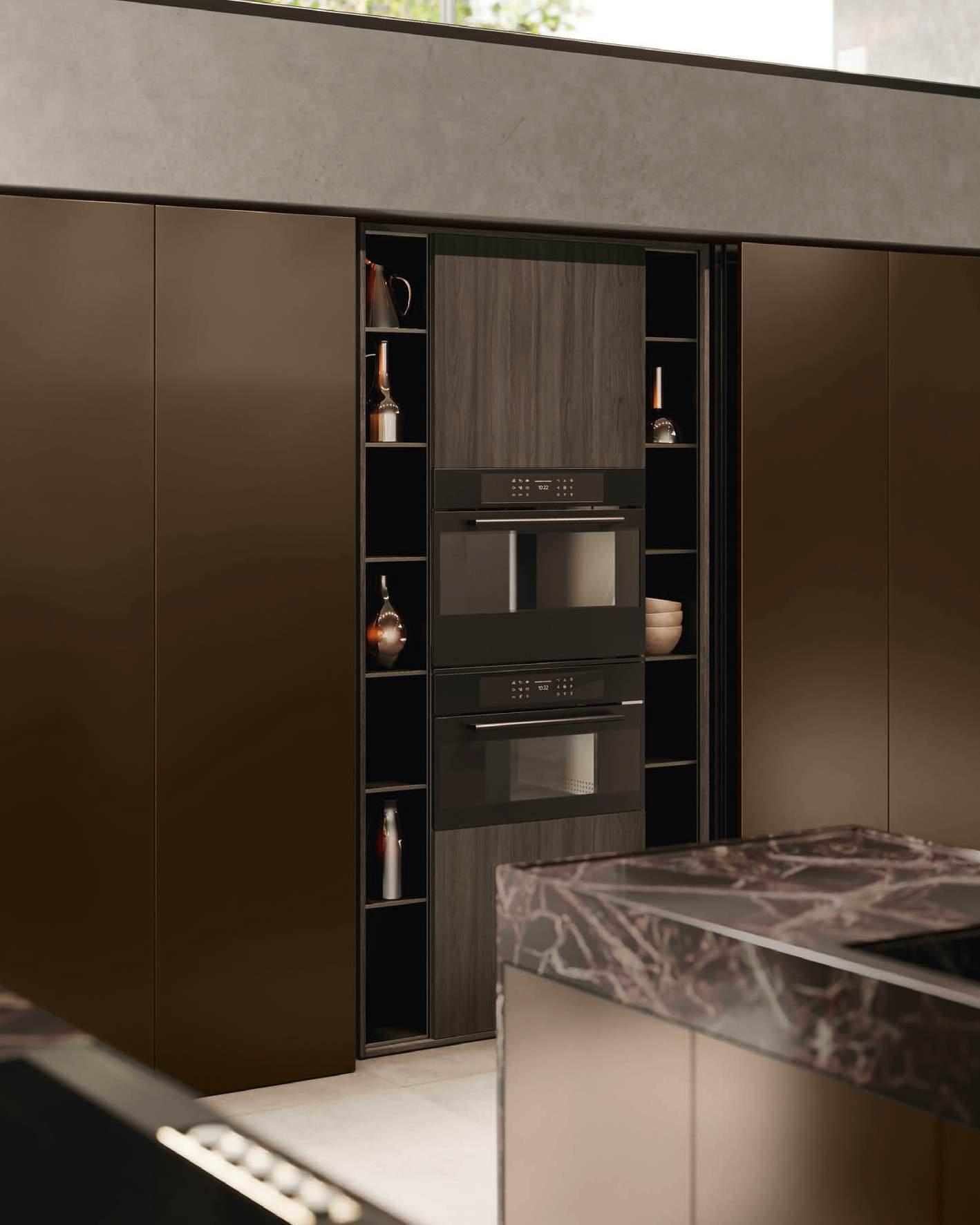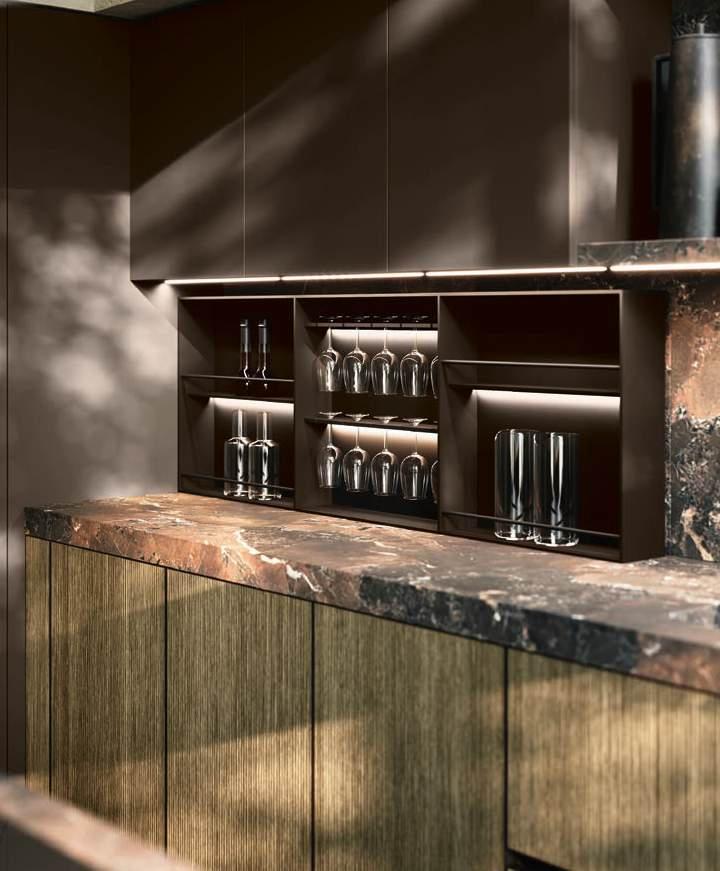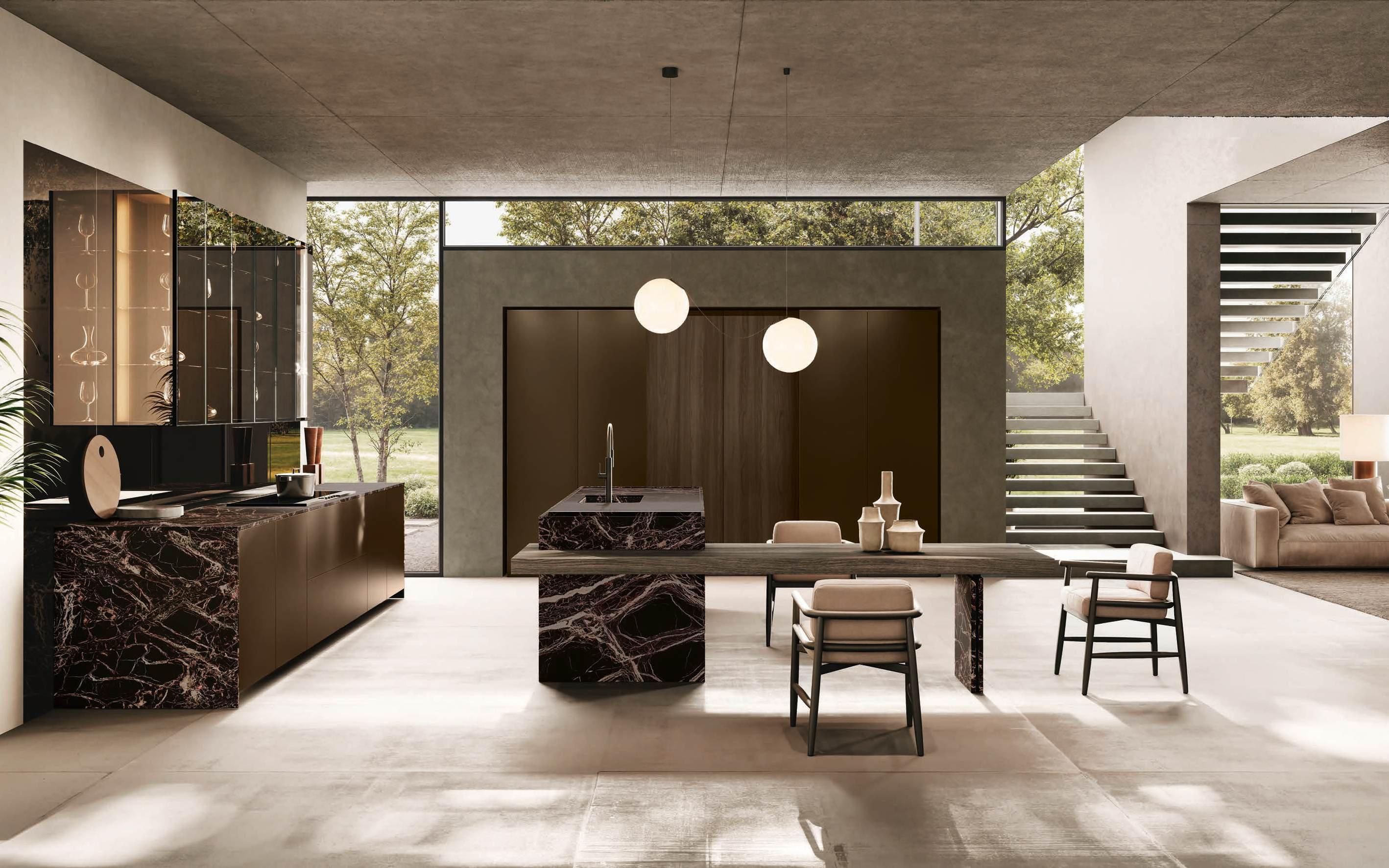 Bluna Tech Alluminio Brunito offers a culinary experience of comfort and quality, enhanced by two stations unified through a masterful pairing of contrasting textures and precious materials. The magnetic allure of both the island and the linear wallmounted kitchen derives from both the stone cladding and the special treatment of the fronts. On one side, the natural stone countertop, brushed Rosso Levanto, captivates with its elegance and innovative details, such as the terminal basin, perfect for housing aromatic plants or bottles of champagne. On the other, the technical sophistication of the Bluna Tech Alluminio Brunito doors imparts a distinctive personality and character to the project. Chic and unexpected details, such as the Petra glass-fronted wall units, further enrich the composition. The Bluna Tech Alluminio Brunito columns stand alongside the recessed Bluna Legno Rovere Corteccia doors, concealing multiple spaces within—spaces as varied as the emotions, performance, and functions that define the kitchen environment.