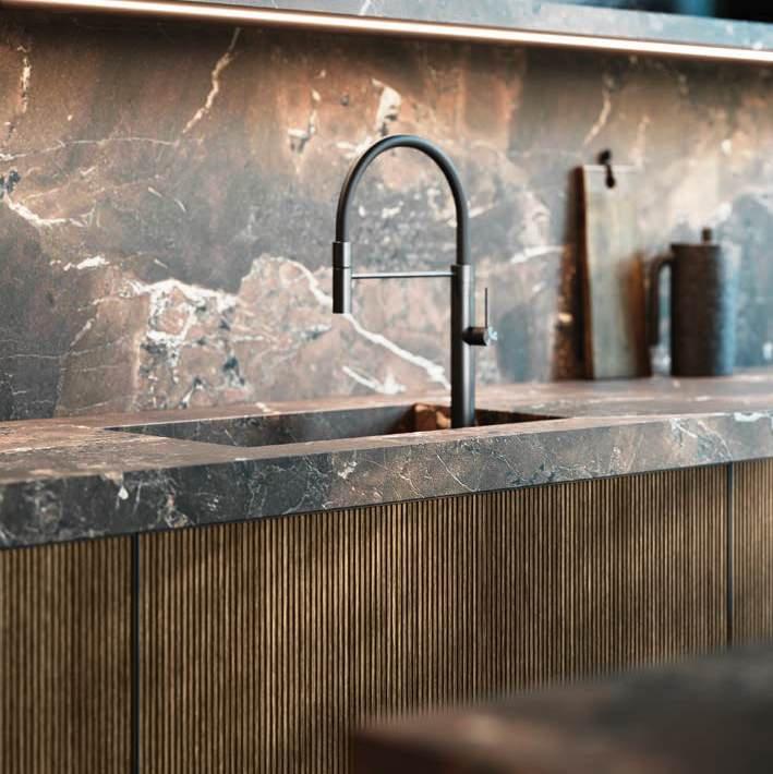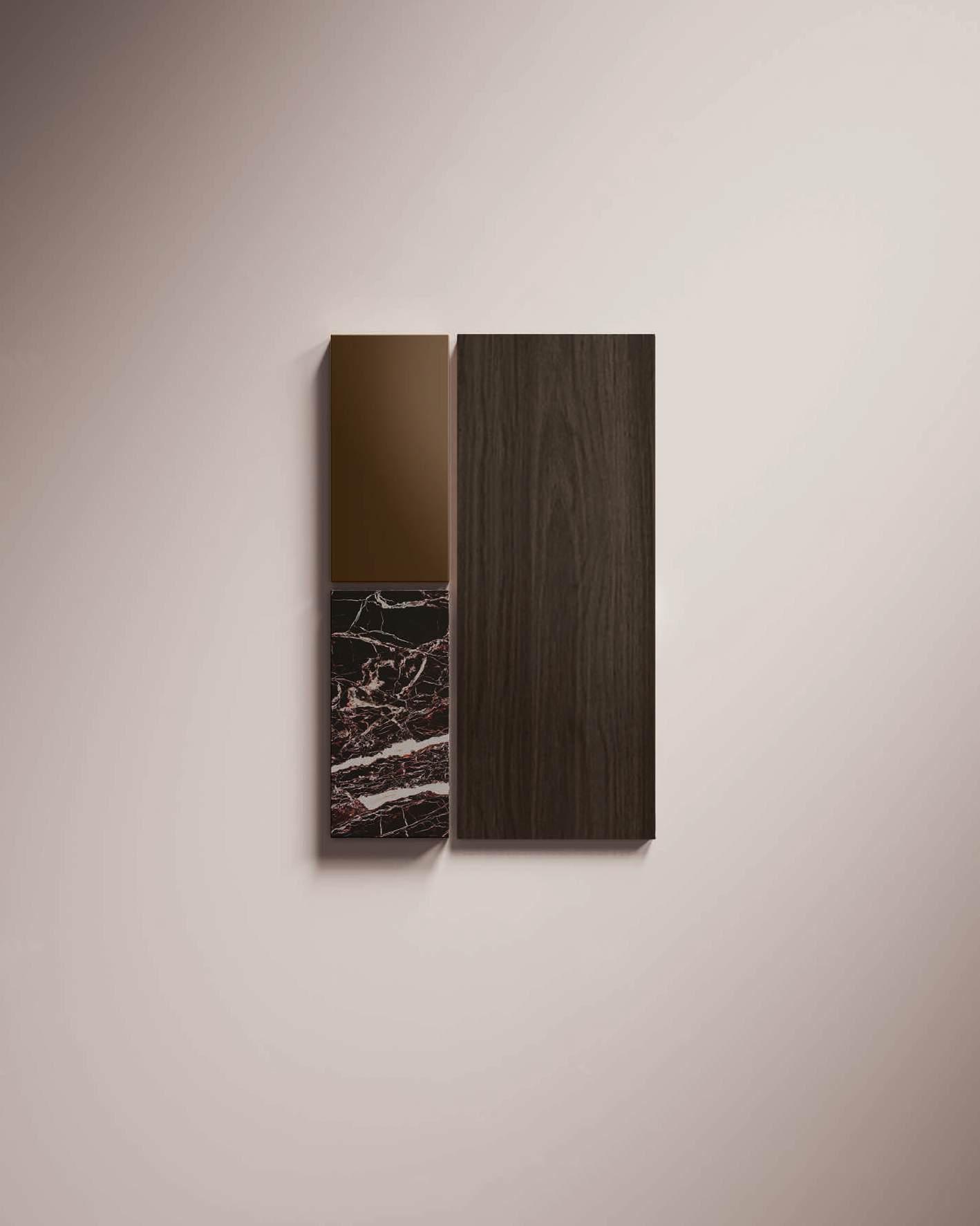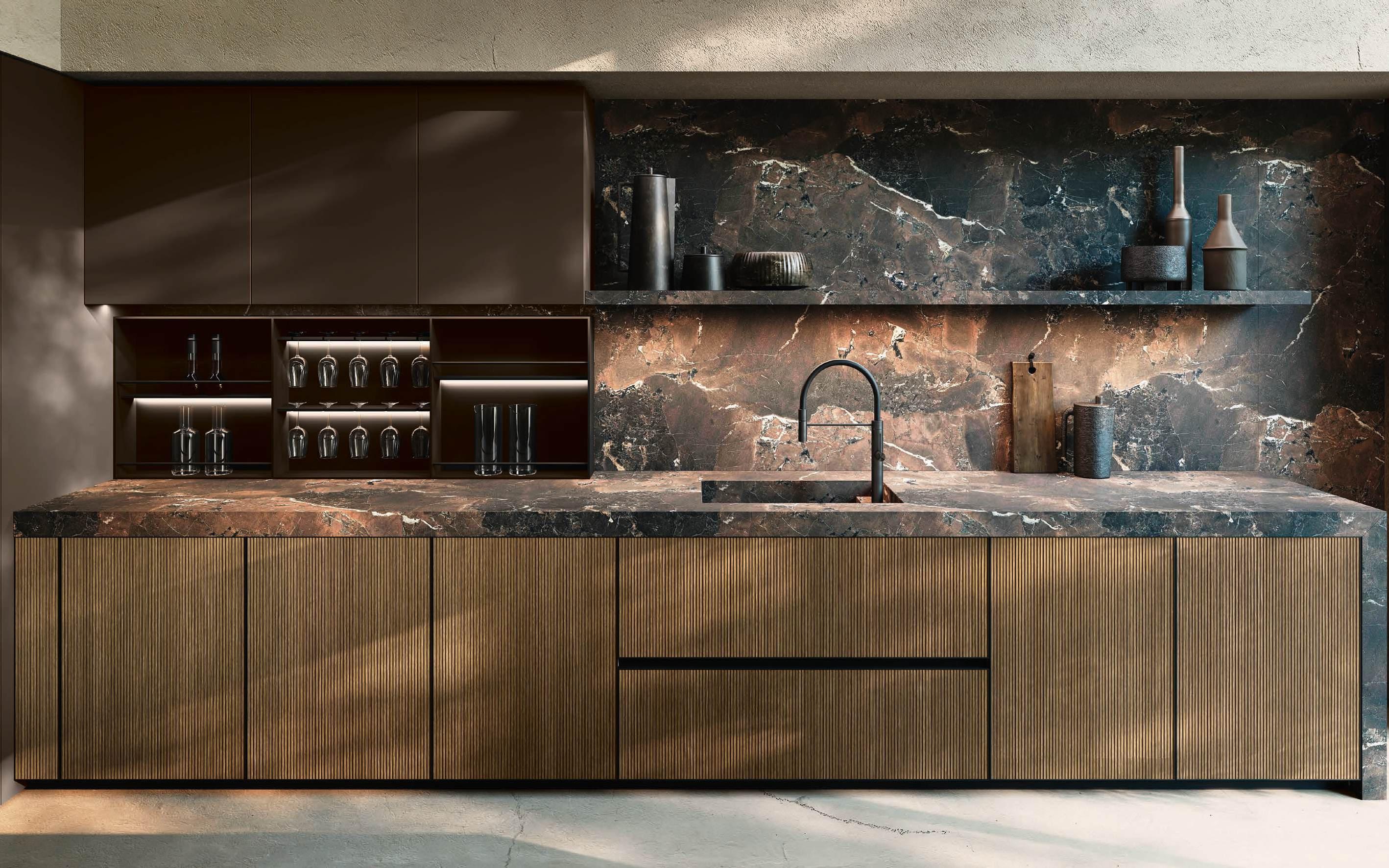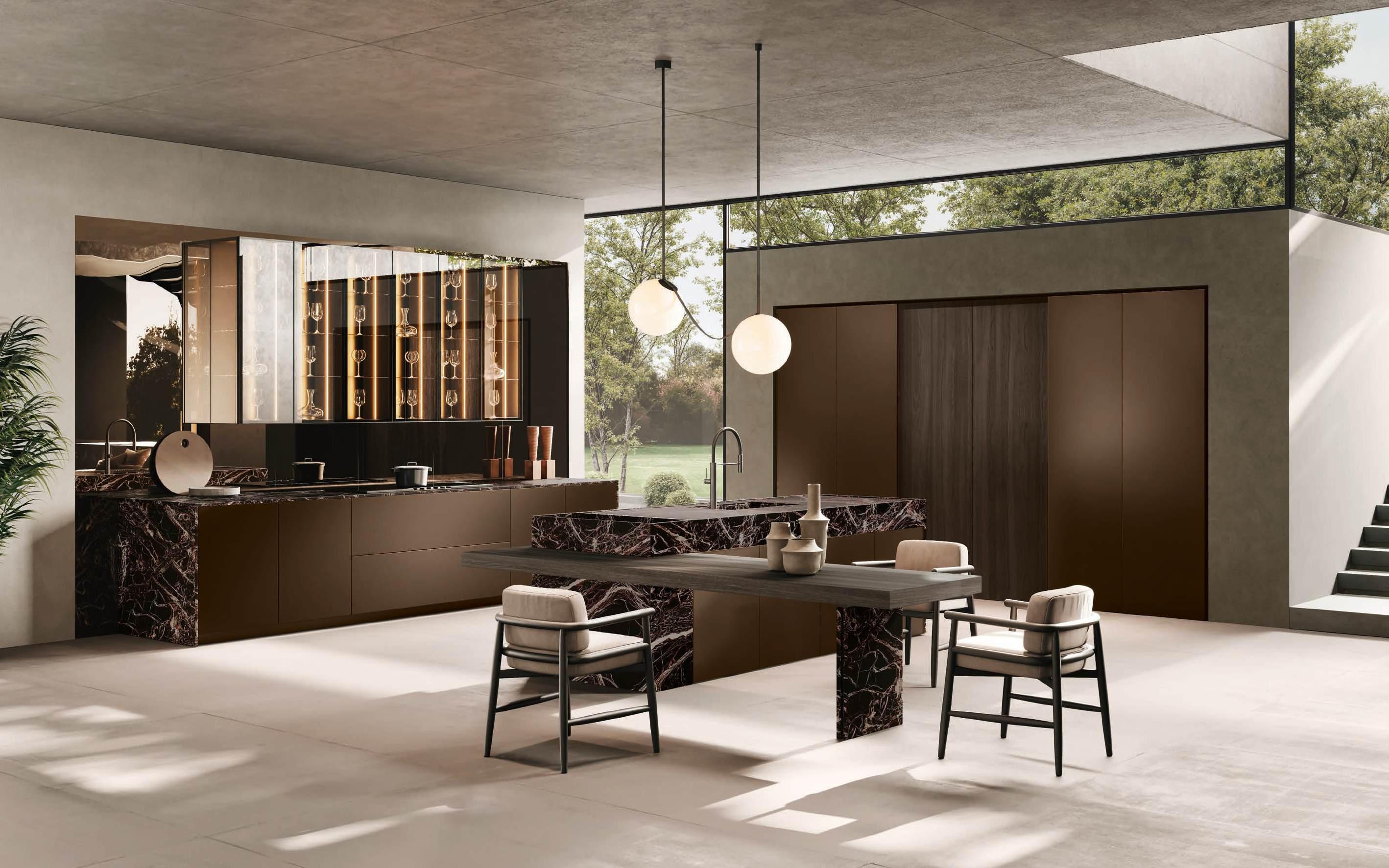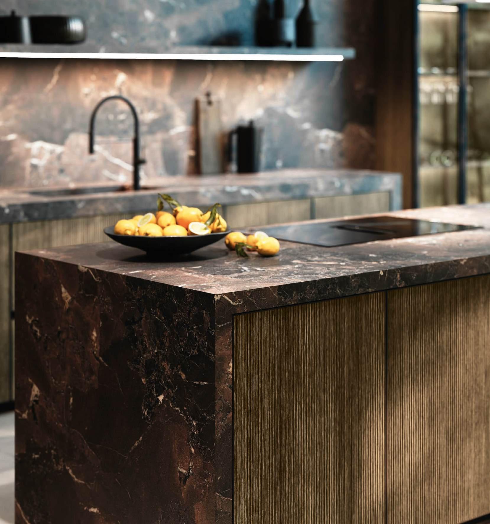 Bluna Tech Alluminio Brunito offers a culinary experience of comfort and quality, enhanced by two stations unified through a masterful pairing of contrasting textures and precious materials. The magnetic allure of both the island and the linear wallmounted kitchen derives from both the stone cladding and the special treatment of the fronts. On one side, the natural stone countertop, brushed Rosso Levanto, captivates with its elegance and innovative details, such as the terminal basin, perfect for housing aromatic plants or bottles of champagne. On the other, the technical sophistication of the Bluna Tech Alluminio Brunito doors imparts a distinctive personality and character to the project. Chic and unexpected details, such as the Petra glass-fronted wall units, further enrich the composition. The Bluna Tech Alluminio Brunito columns stand alongside the recessed Bluna Legno Rovere Corteccia doors, concealing multiple spaces within—spaces as varied as the emotions, performance, and functions that define the kitchen environment.