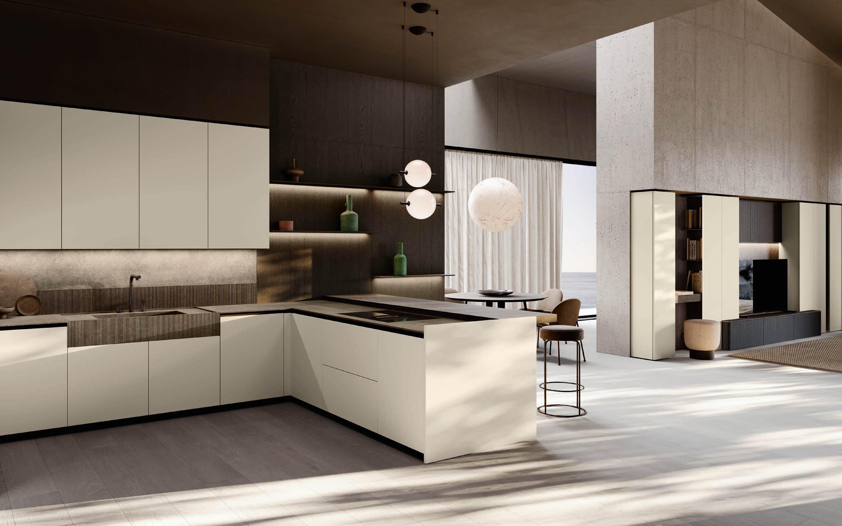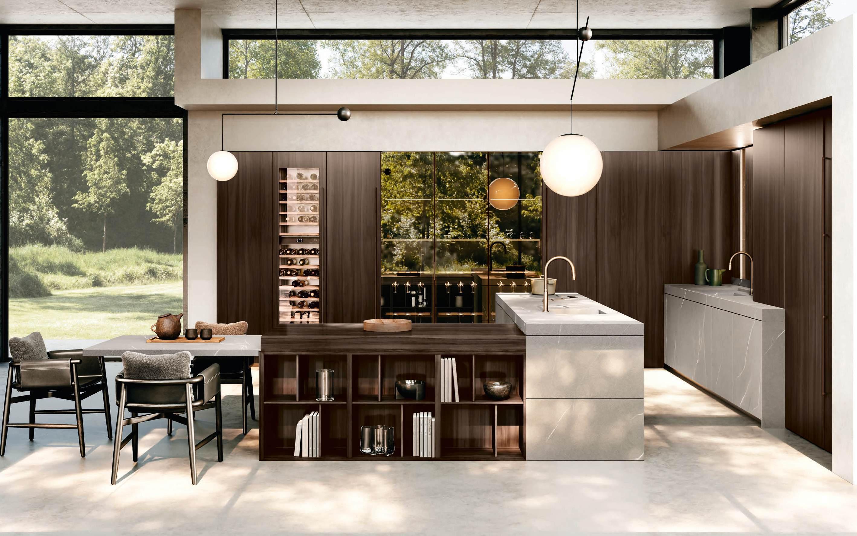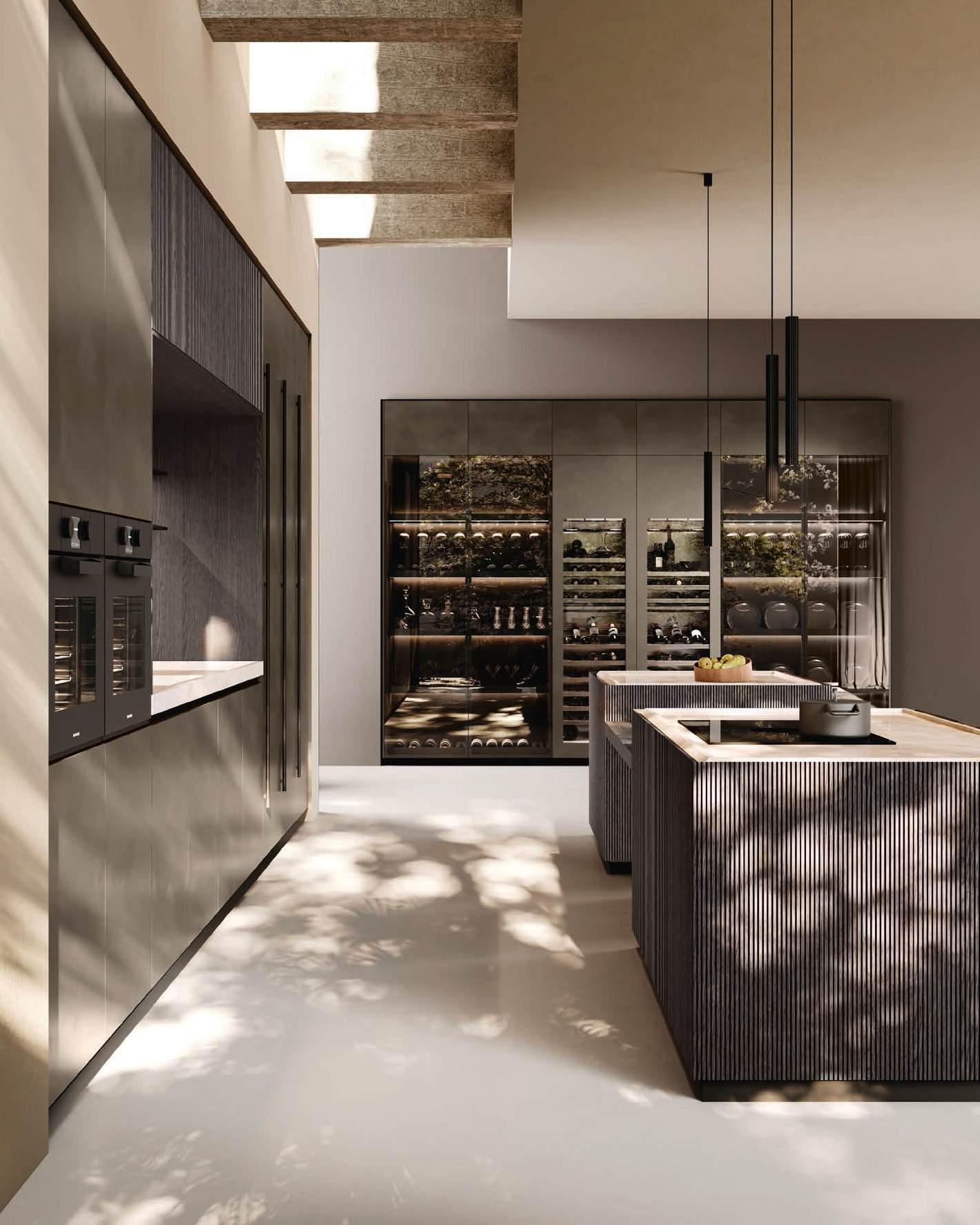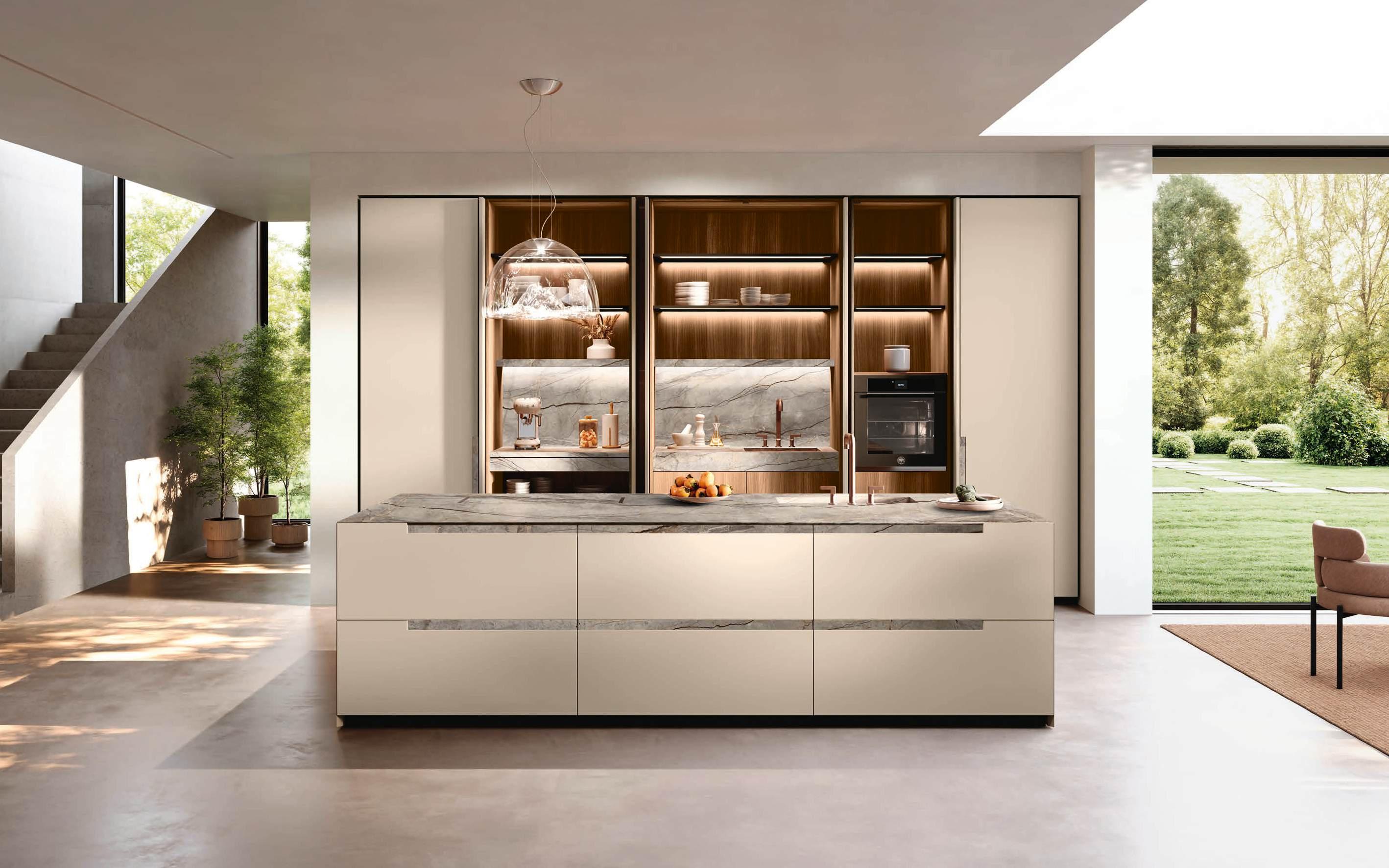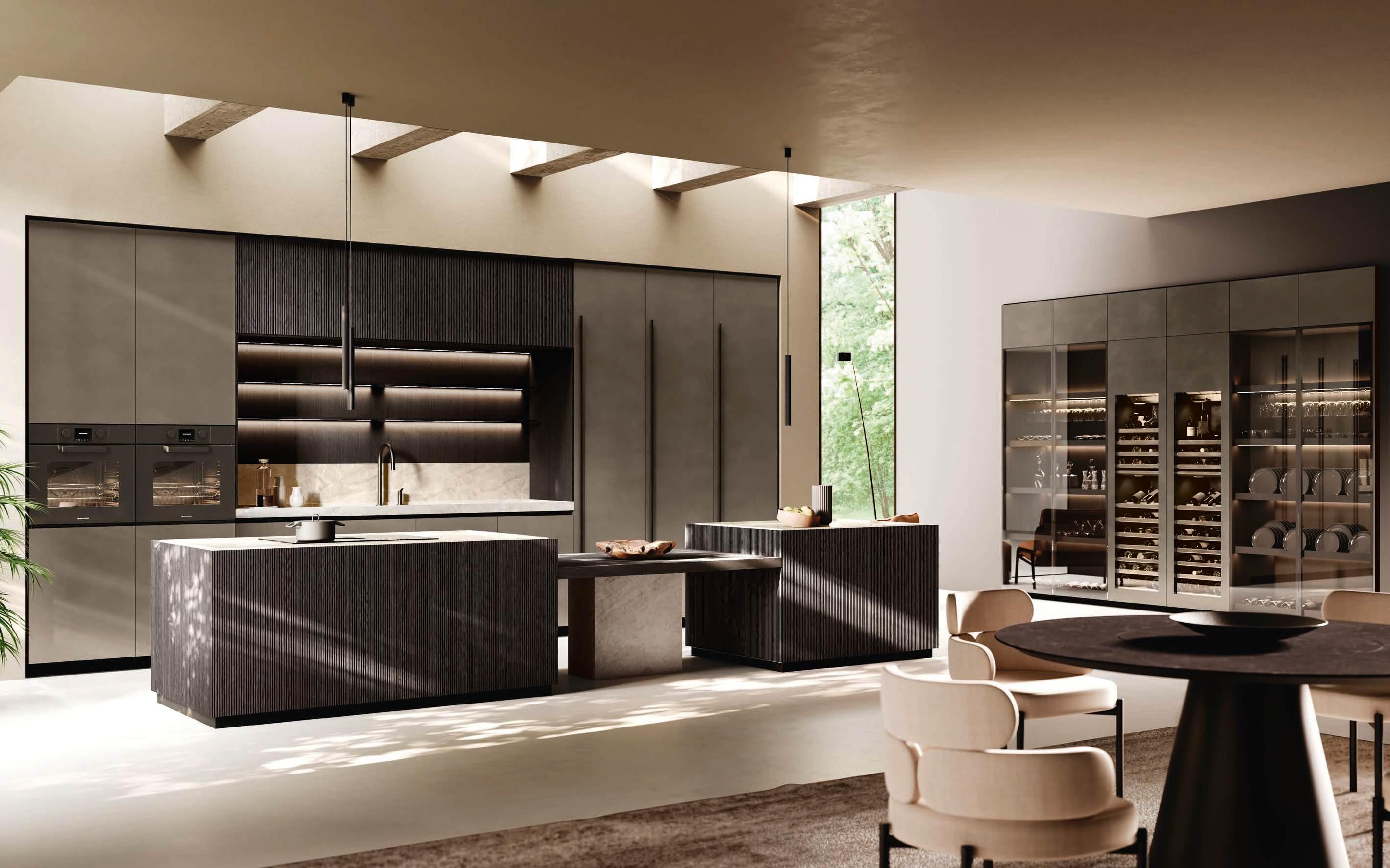 In una sinfonia di materiali e finiture, la cucina diviene un autentico percorso sensoriale, dove ogni dettaglio è una nota di armonia. L’isola Bluna, teatro del gusto e anima funzionale dell’area kitchen, è contraddistinta dal raffinato incontro tra i fondali neri del top e della fascia monoblocco in pietra naturale con l’eleganza metallica delle ante in Dakhìa Beige. E per rendere l’esperienza visiva davvero unica e avvolgente, la postazione dove la preparazione dei cibi è un’arte si illumina grazie al profilo LED integrato nell’innovativa gola emme. Fanno da sfondo all’isola il colonnato Hily con caratterizzante cornice in legno e le vetrine Zen che, nella ritmica alternanza di stecche in legno che celano al loro interno il vetro fumé, invitano alla scoperta di spazi e funzioni legati alle molteplici esigenze del vivere contemporaneo.