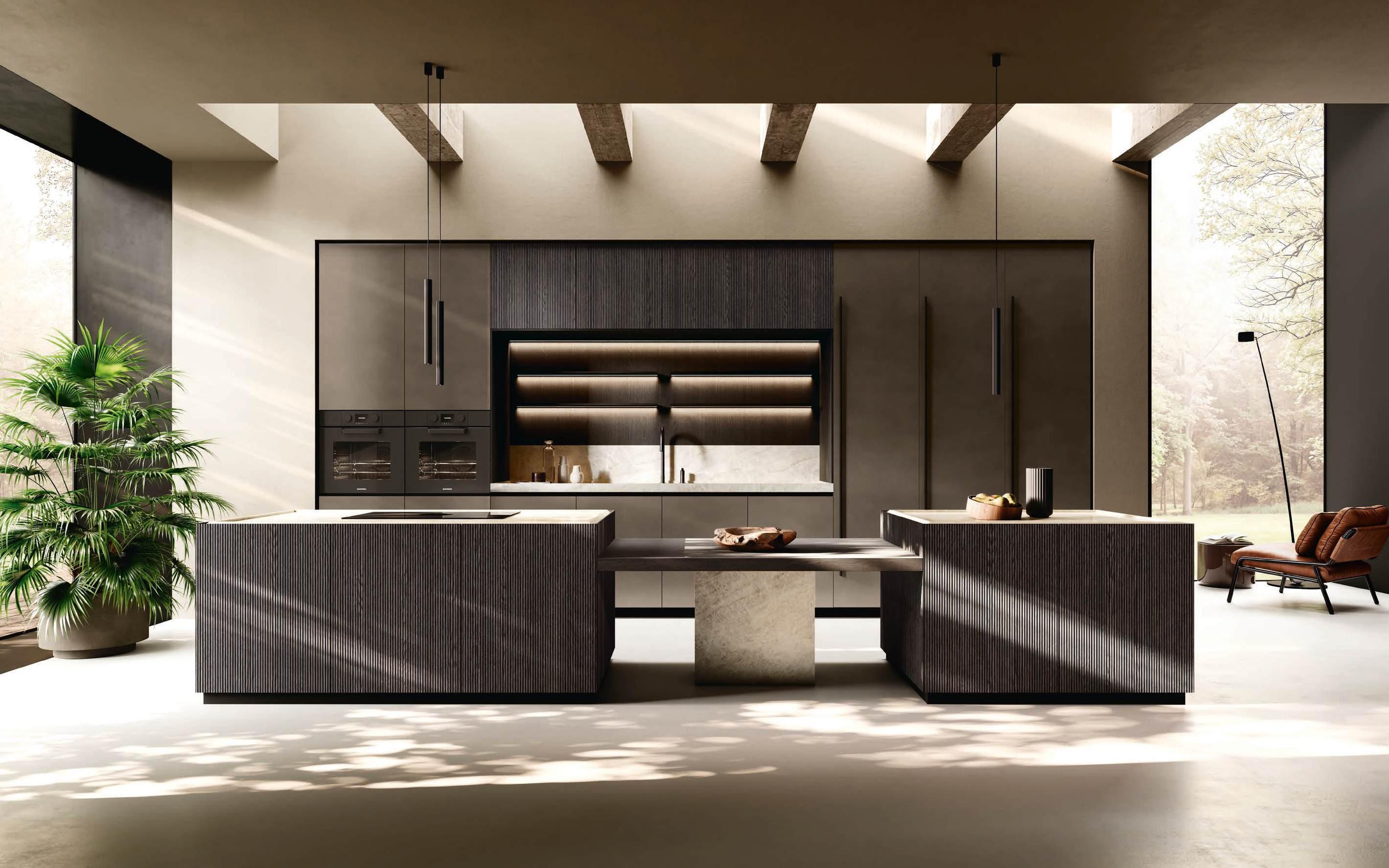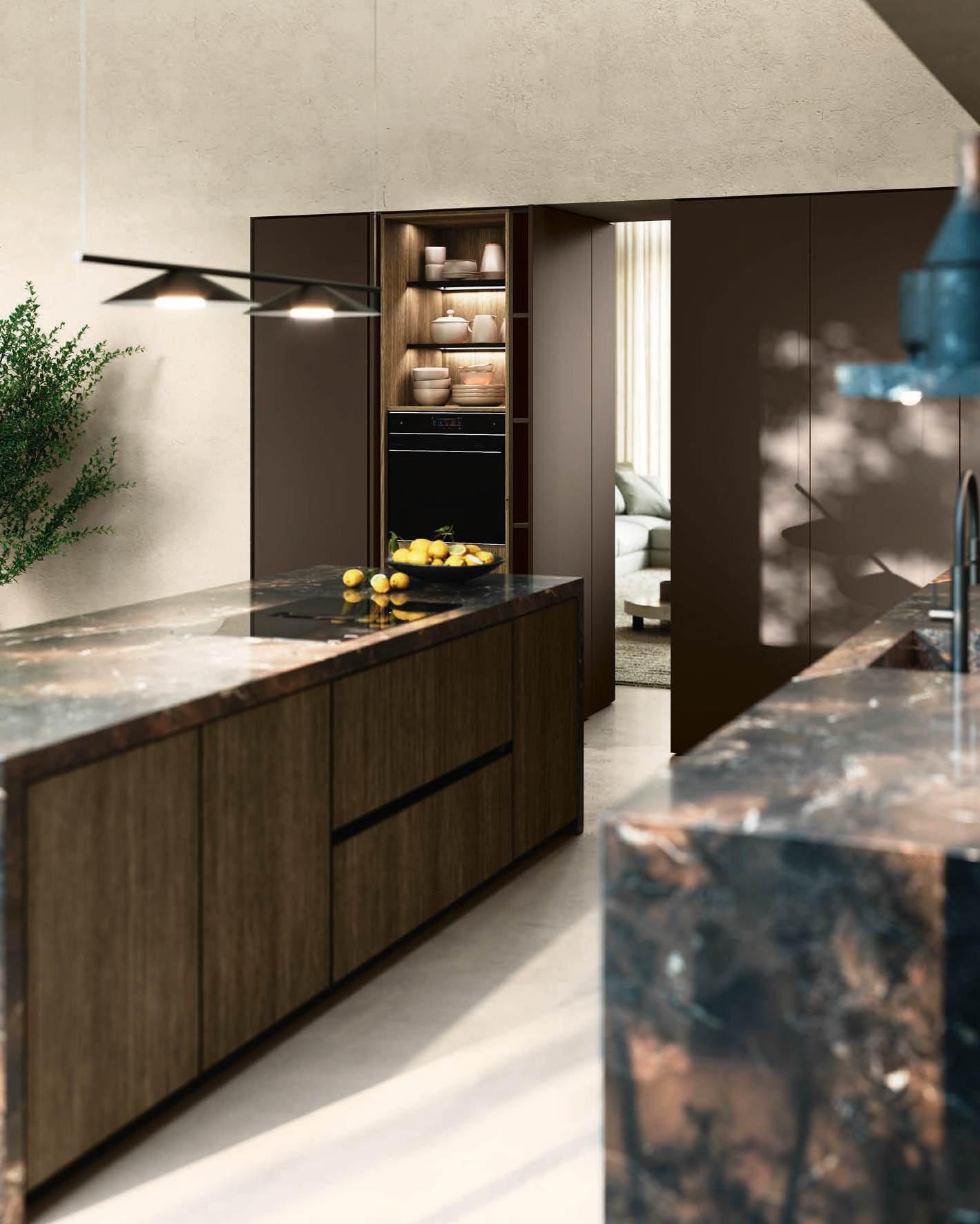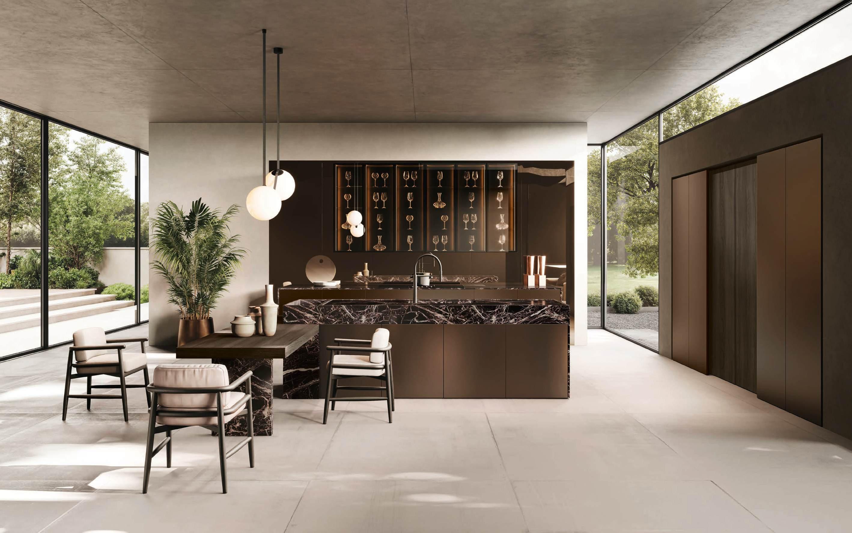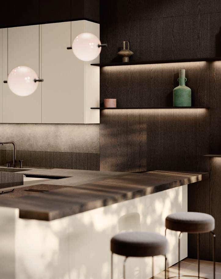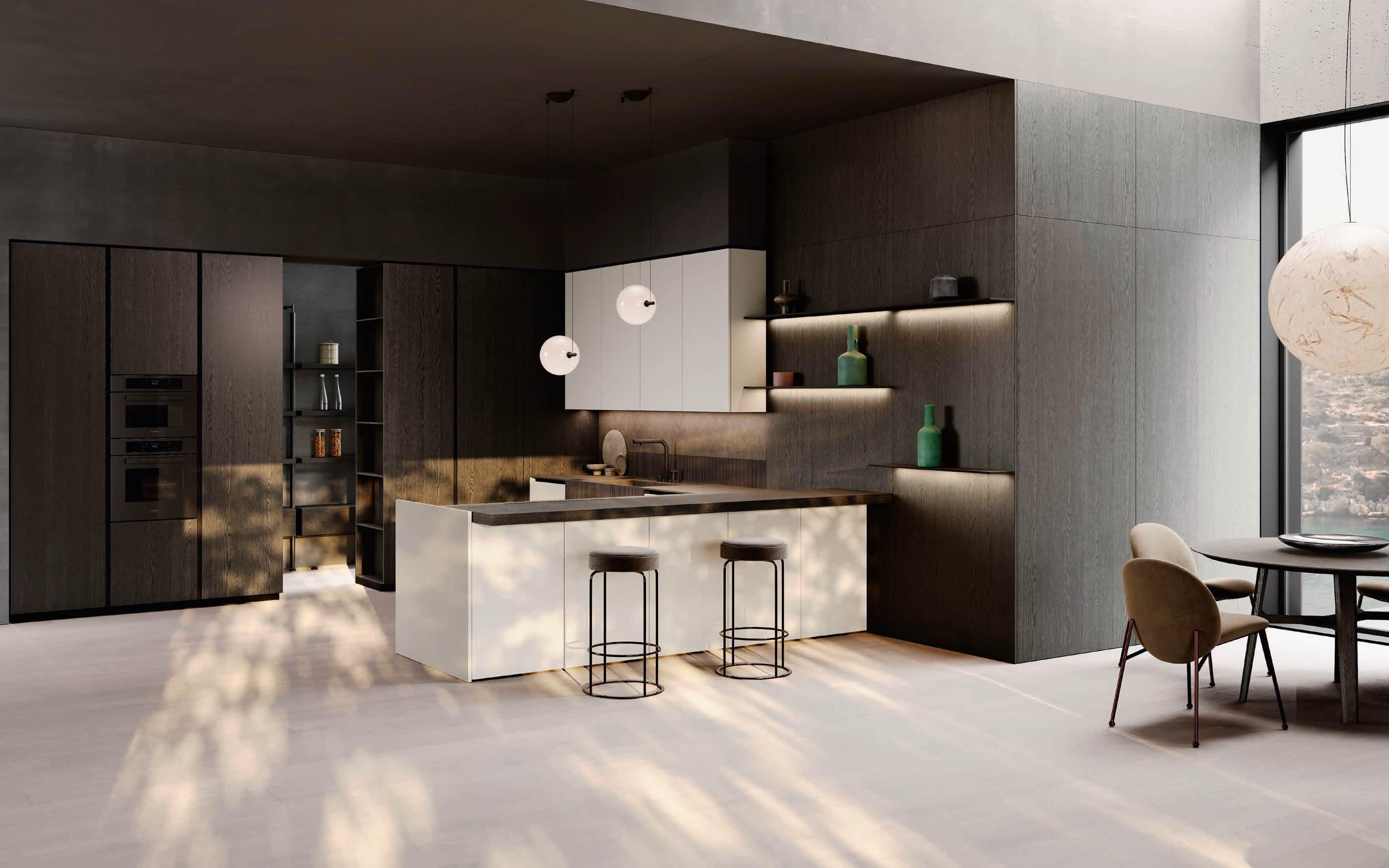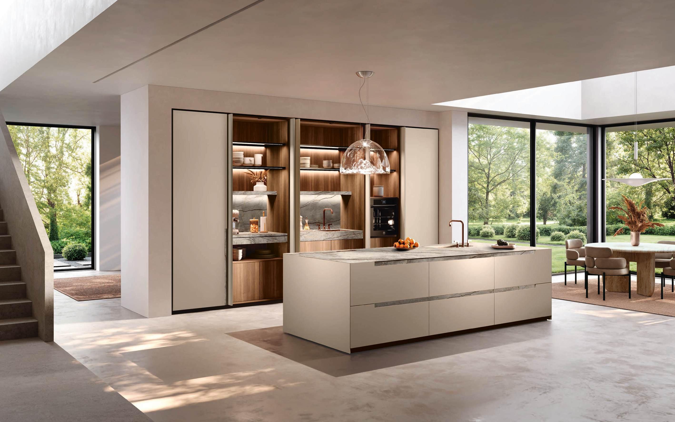 In una sinfonia di materiali e finiture, la cucina diviene un autentico percorso sensoriale, dove ogni dettaglio è una nota di armonia. L’isola Bluna, teatro del gusto e anima funzionale dell’area kitchen, è contraddistinta dal raffinato incontro tra i fondali neri del top e della fascia monoblocco in pietra naturale con l’eleganza metallica delle ante in Dakhìa Beige. E per rendere l’esperienza visiva davvero unica e avvolgente, la postazione dove la preparazione dei cibi è un’arte si illumina grazie al profilo LED integrato nell’innovativa gola emme. Fanno da sfondo all’isola il colonnato Hily con caratterizzante cornice in legno e le vetrine Zen che, nella ritmica alternanza di stecche in legno che celano al loro interno il vetro fumé, invitano alla scoperta di spazi e funzioni legati alle molteplici esigenze del vivere contemporaneo.