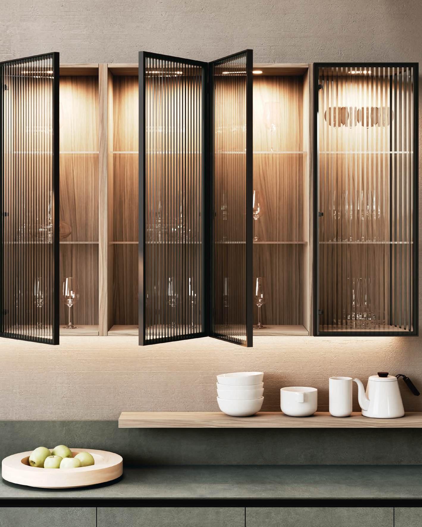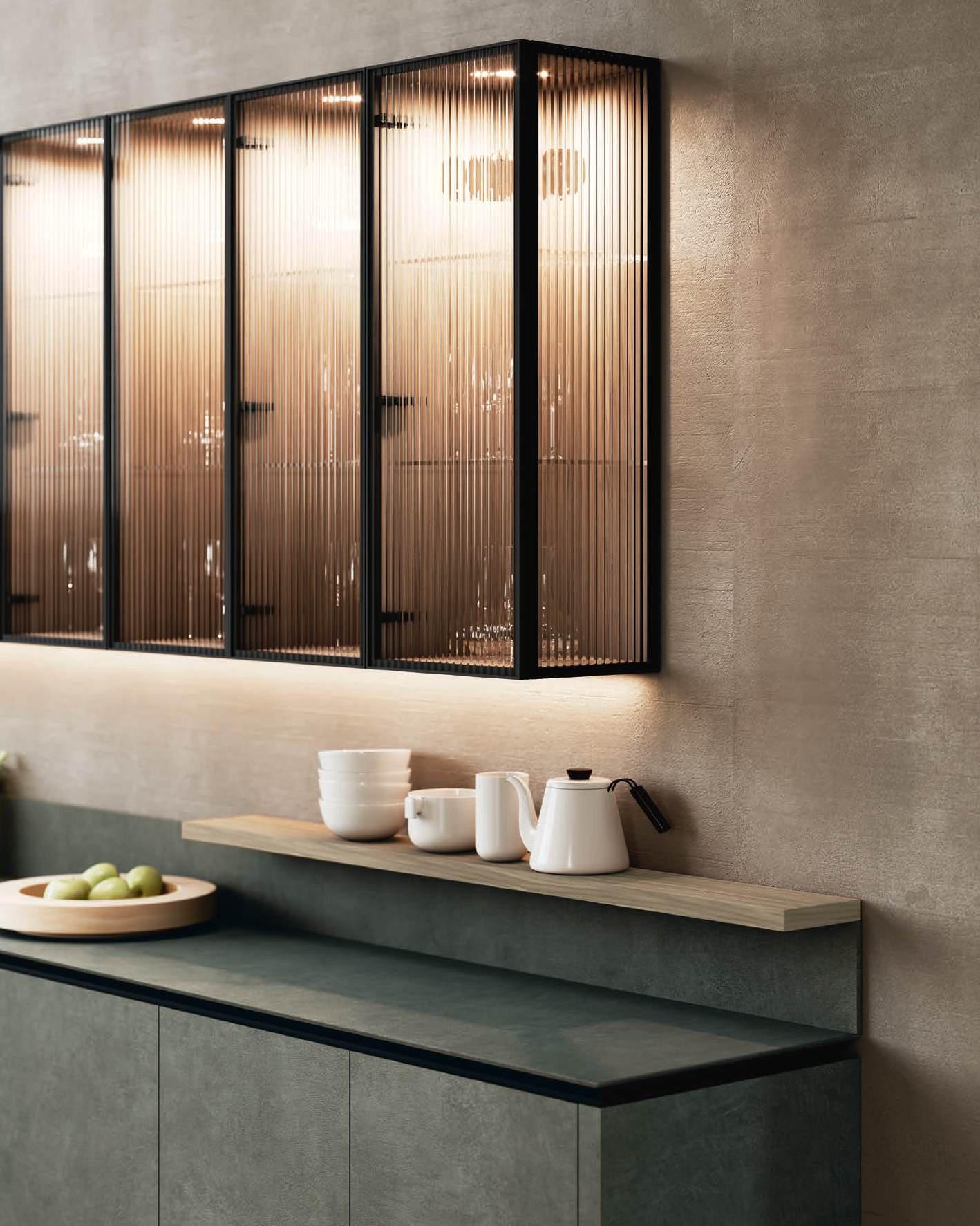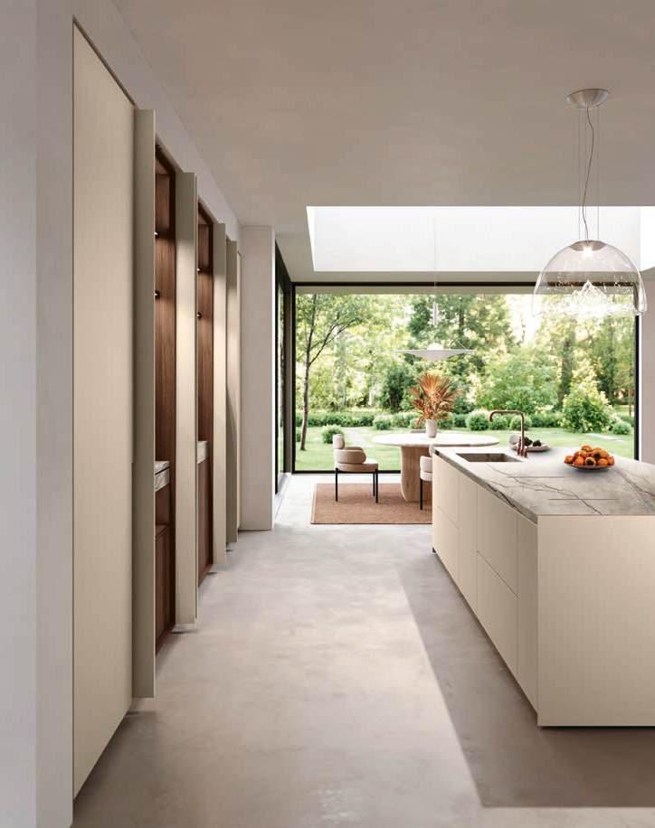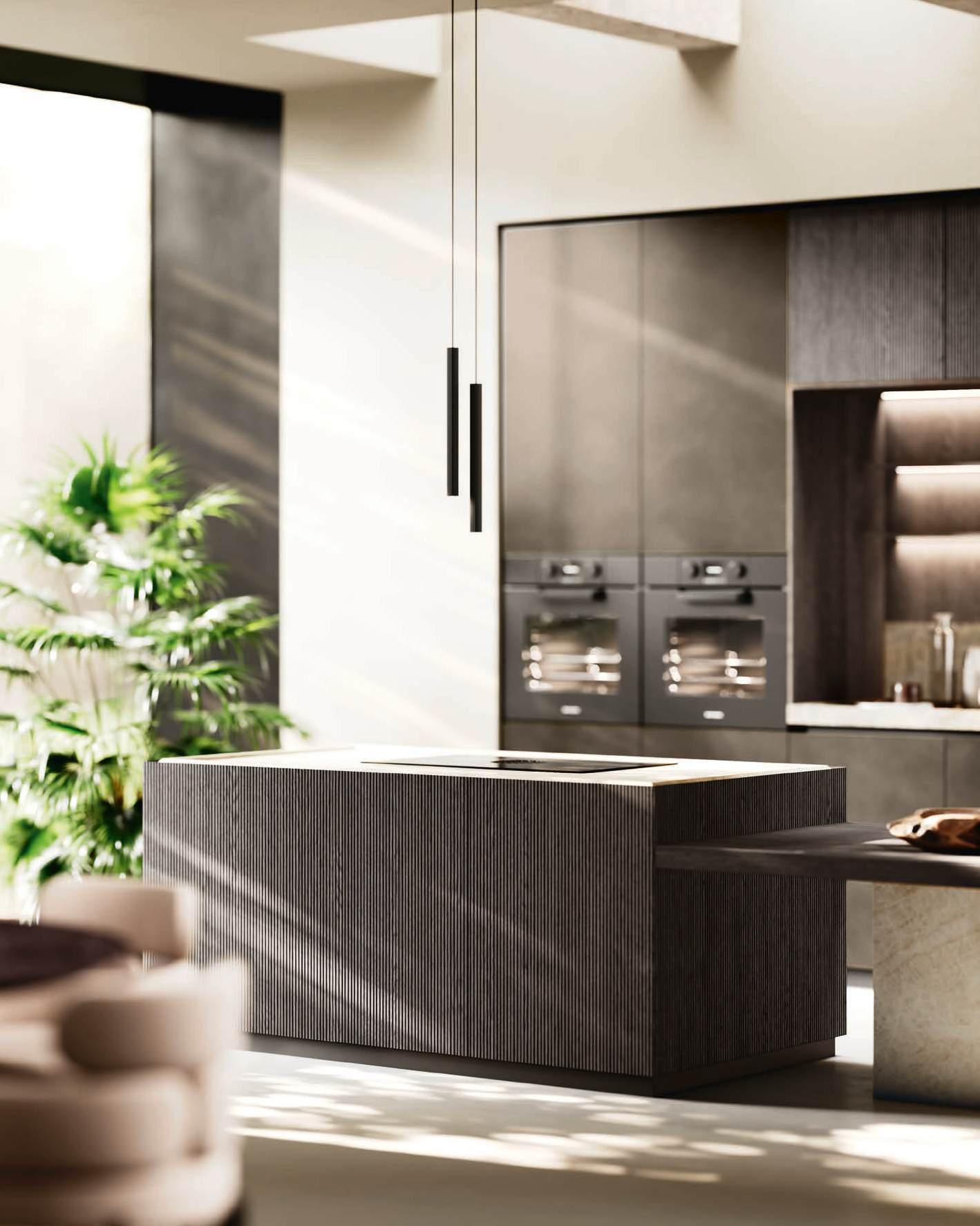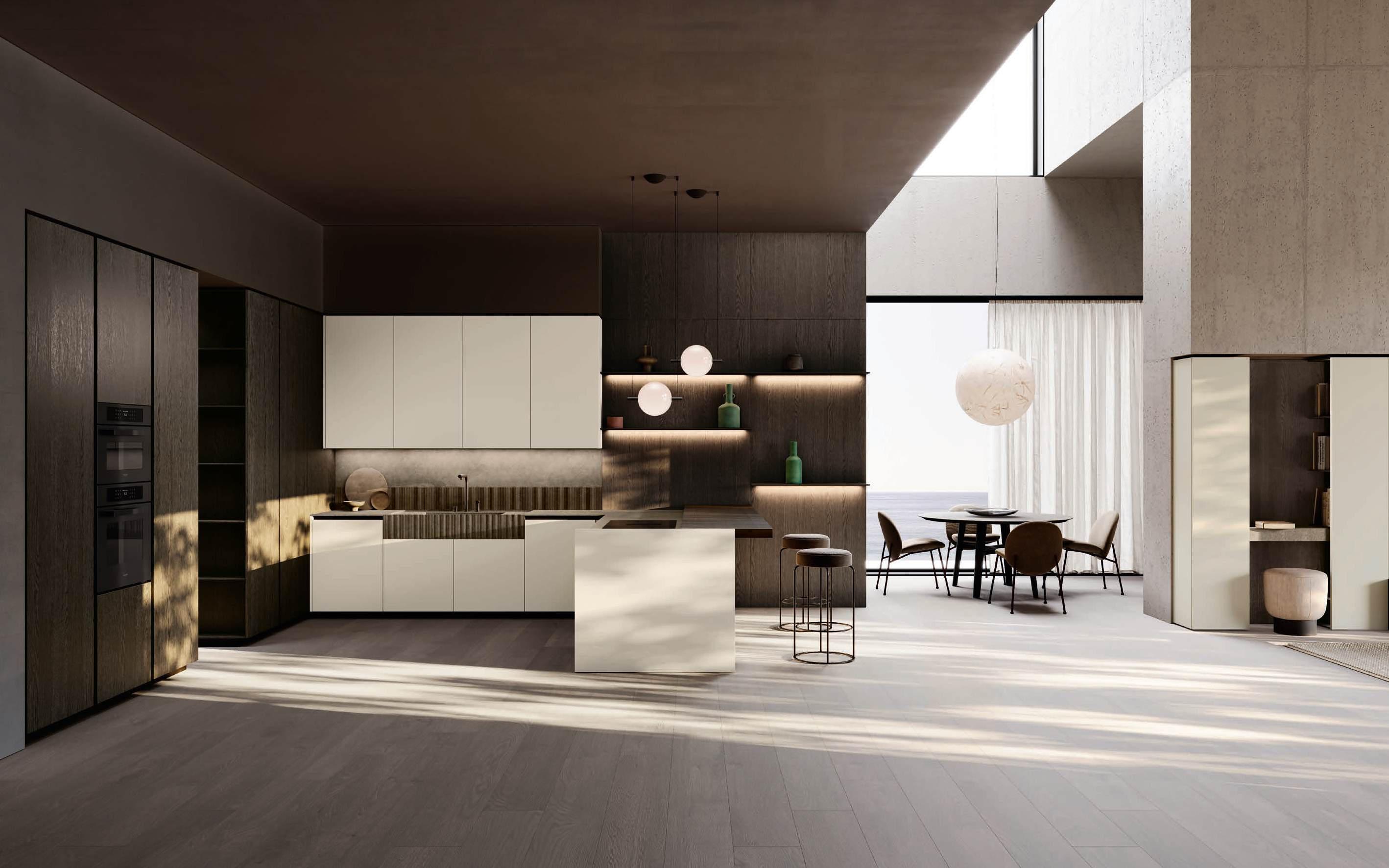 In una sinfonia di materiali e finiture, la cucina diviene un autentico percorso sensoriale, dove ogni dettaglio è una nota di armonia. L’isola Bluna, teatro del gusto e anima funzionale dell’area kitchen, è contraddistinta dal raffinato incontro tra i fondali neri del top e della fascia monoblocco in pietra naturale con l’eleganza metallica delle ante in Dakhìa Beige. E per rendere l’esperienza visiva davvero unica e avvolgente, la postazione dove la preparazione dei cibi è un’arte si illumina grazie al profilo LED integrato nell’innovativa gola emme. Fanno da sfondo all’isola il colonnato Hily con caratterizzante cornice in legno e le vetrine Zen che, nella ritmica alternanza di stecche in legno che celano al loro interno il vetro fumé, invitano alla scoperta di spazi e funzioni legati alle molteplici esigenze del vivere contemporaneo.
