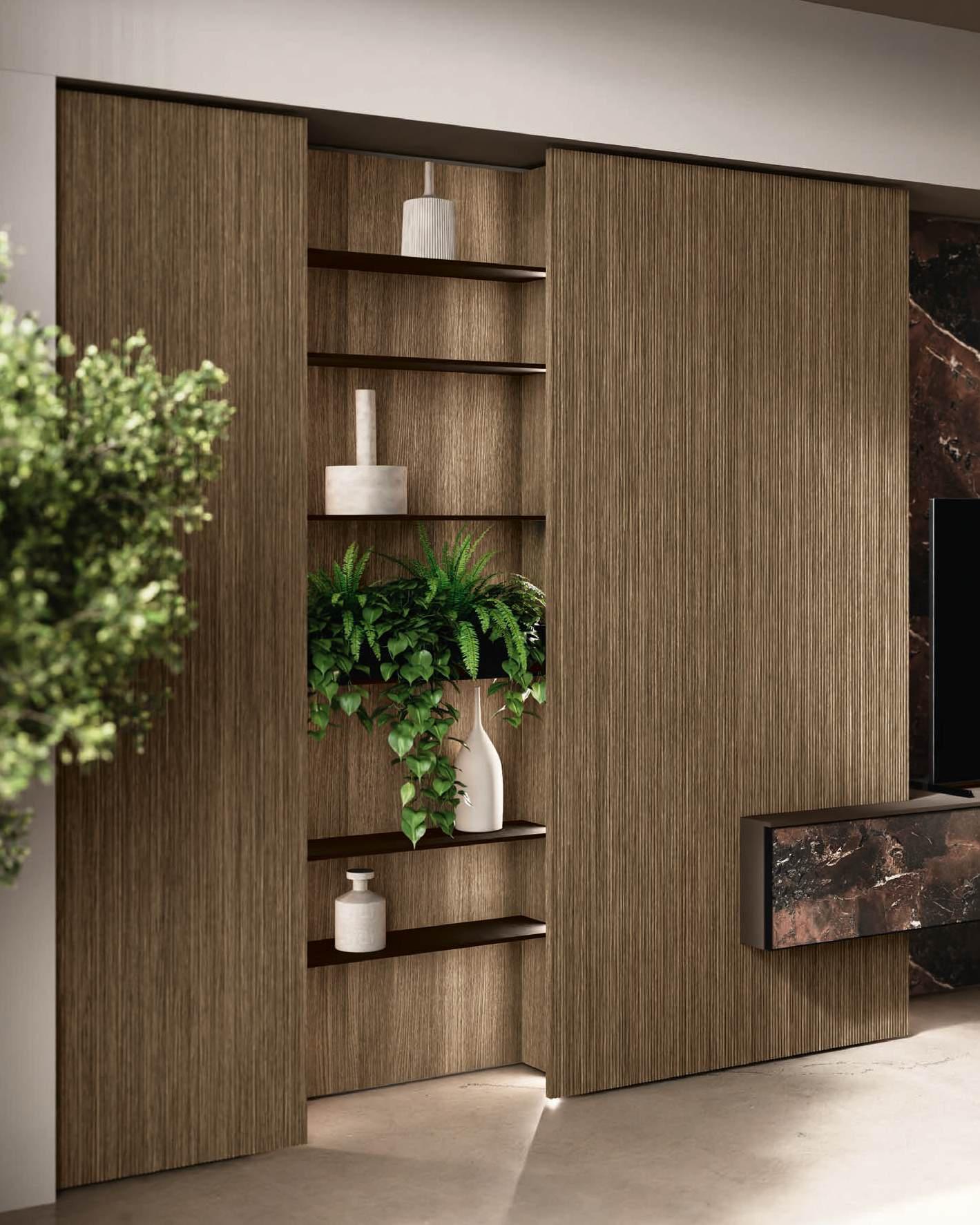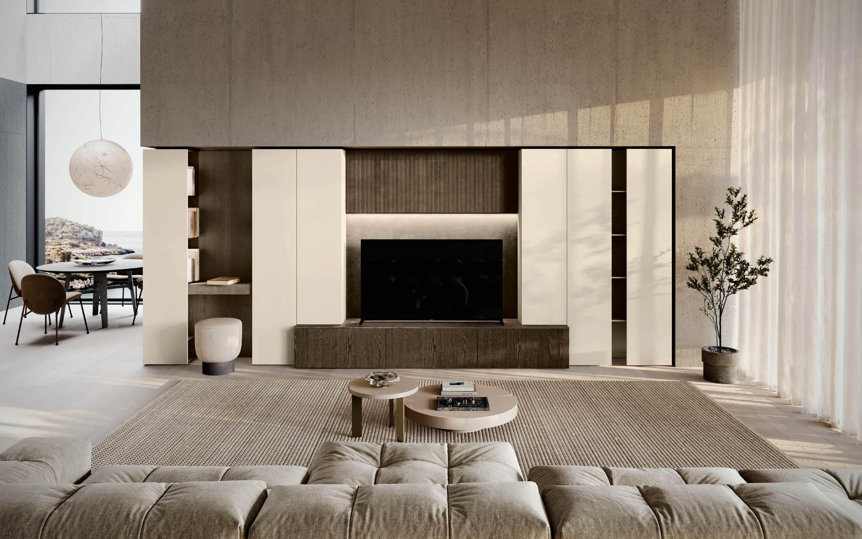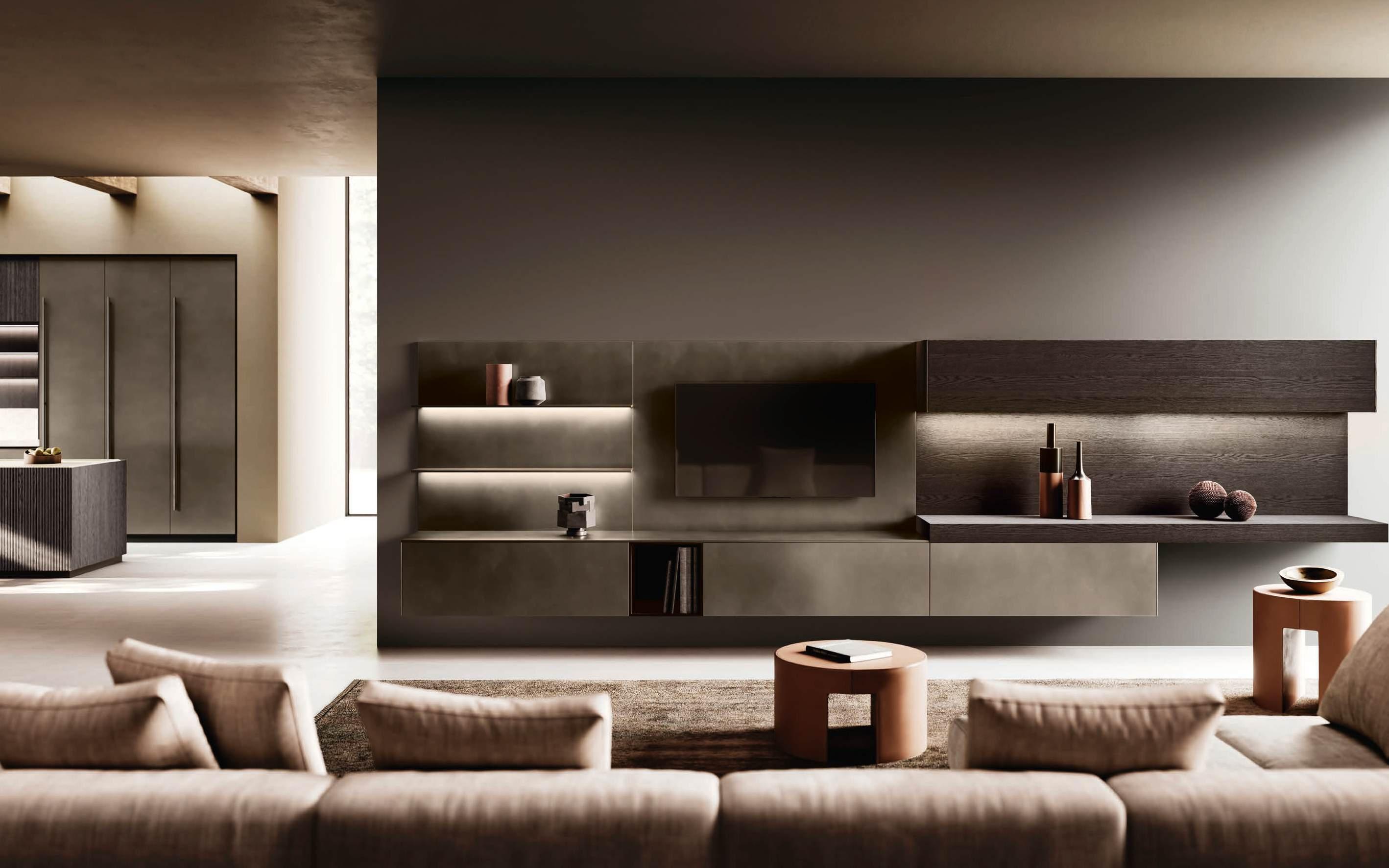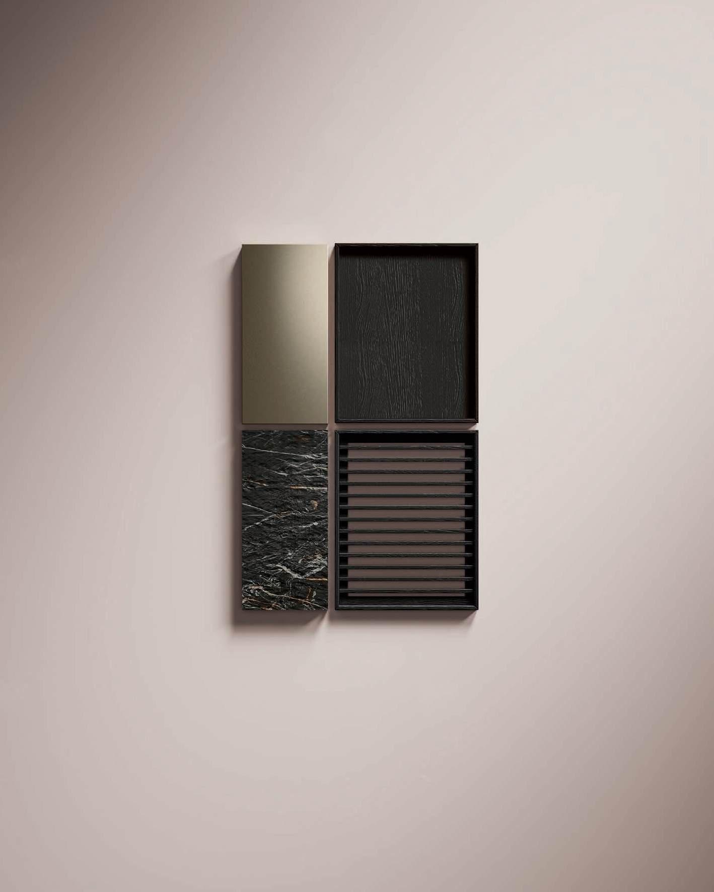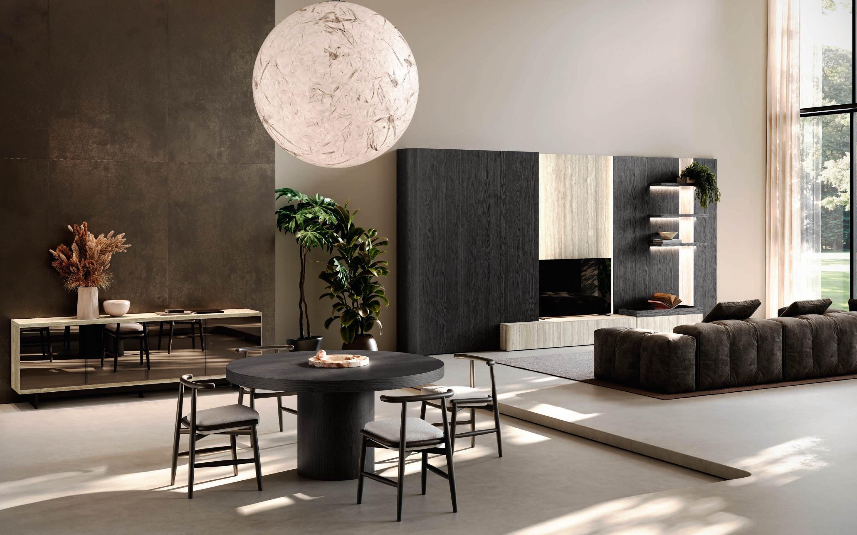 A new and striking curve in Bilaminate Legno Rovere Black guides the visitor from the entrance to the heart of the home, the two islands with Regula bases in matte black aluminum and Lab doors in Travertino Silver Bocciardato, a triumph of lightness thanks to the feet that lift them off the ground. The new Ebe display (glass) cabinet is a light note, structured around black aluminum frames and backs in the same finish as the kitchen area. In the living room, beside the sideboard with Petra doors, a living wall with bimaterial paneling, featuring three different surfaces, adds character and personality to the space in a material dialogue between Bilaminate Legno Rovere Black and porcelain Travertino Silver Bocciardato.