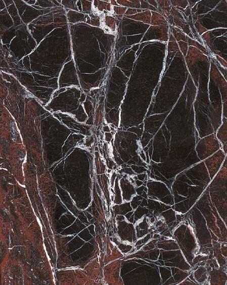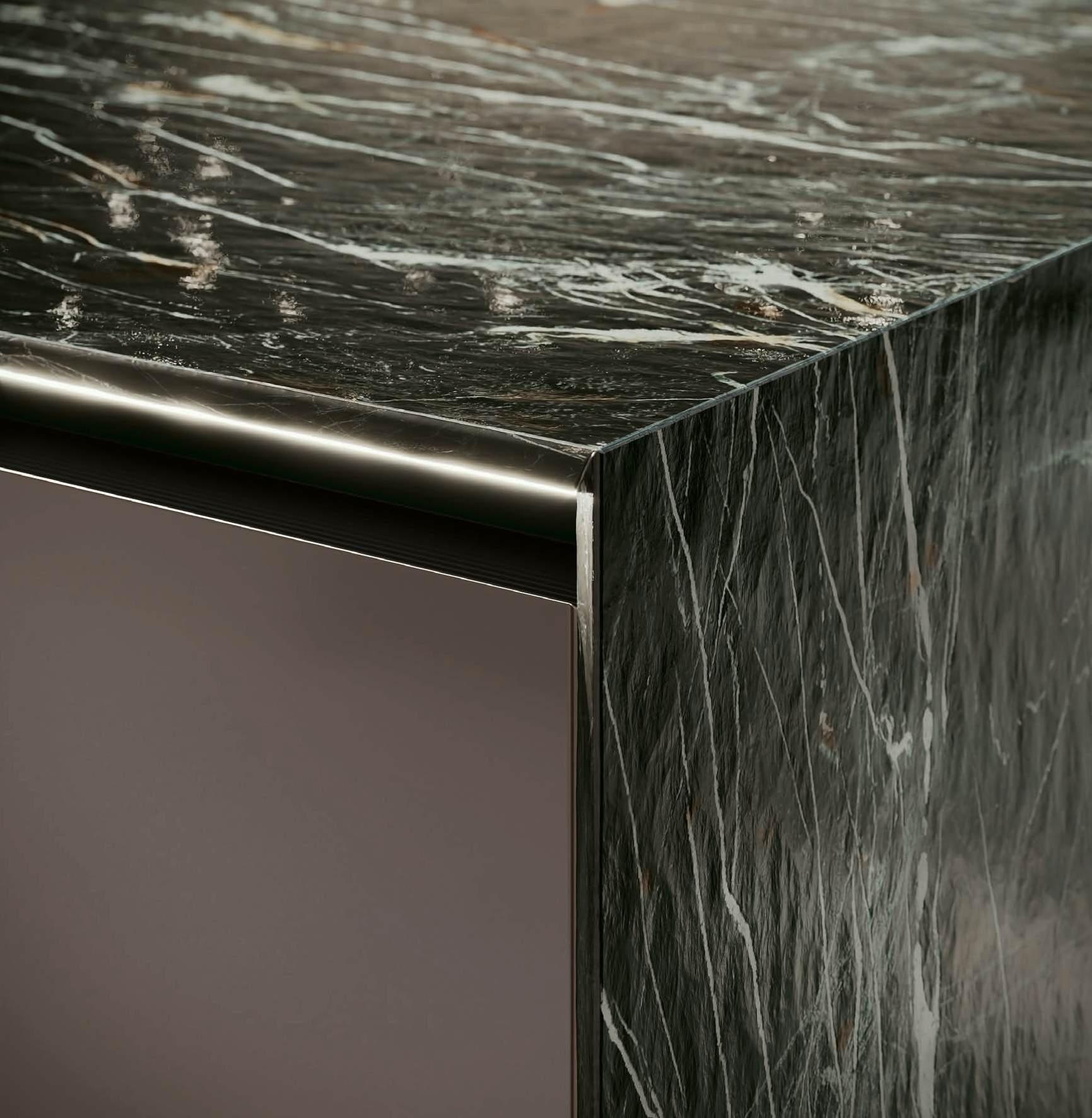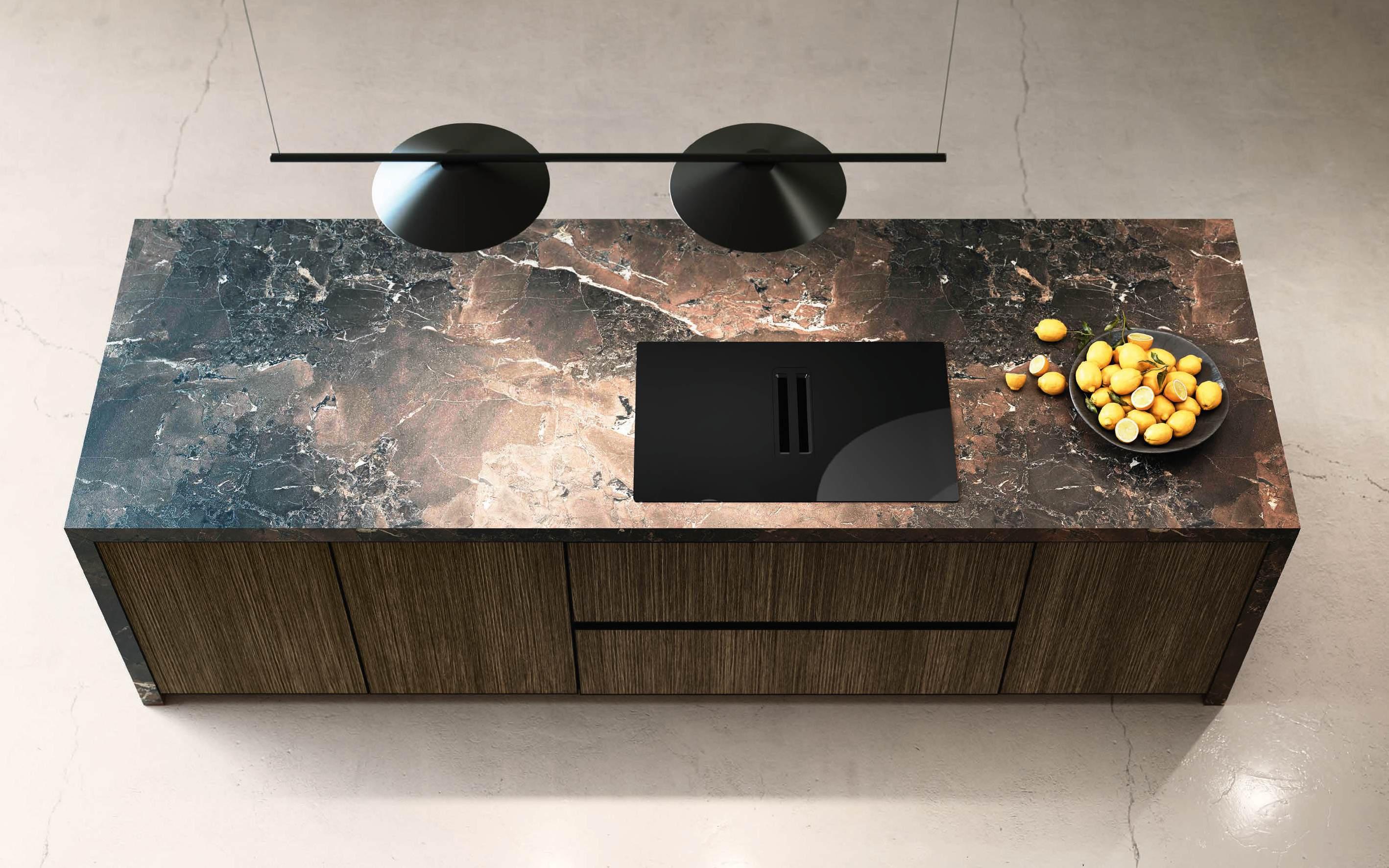 The 8 cm thick Breccia Imperiale porcelain worktop extends onto the sides, joining at a 45° angle. In the background, columns in Fenix Cacao Orinoco laminate house the appliances and encase the Velia door.