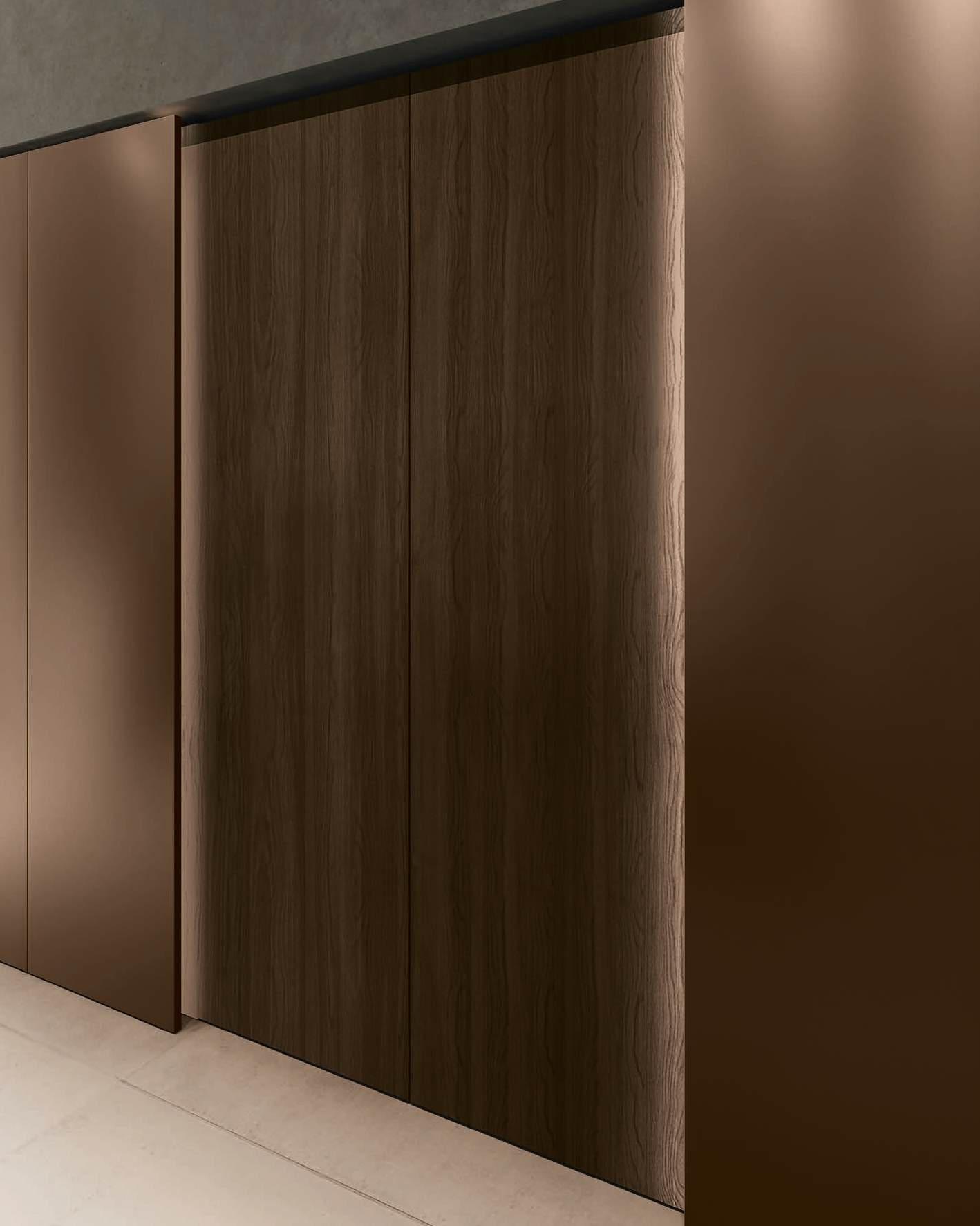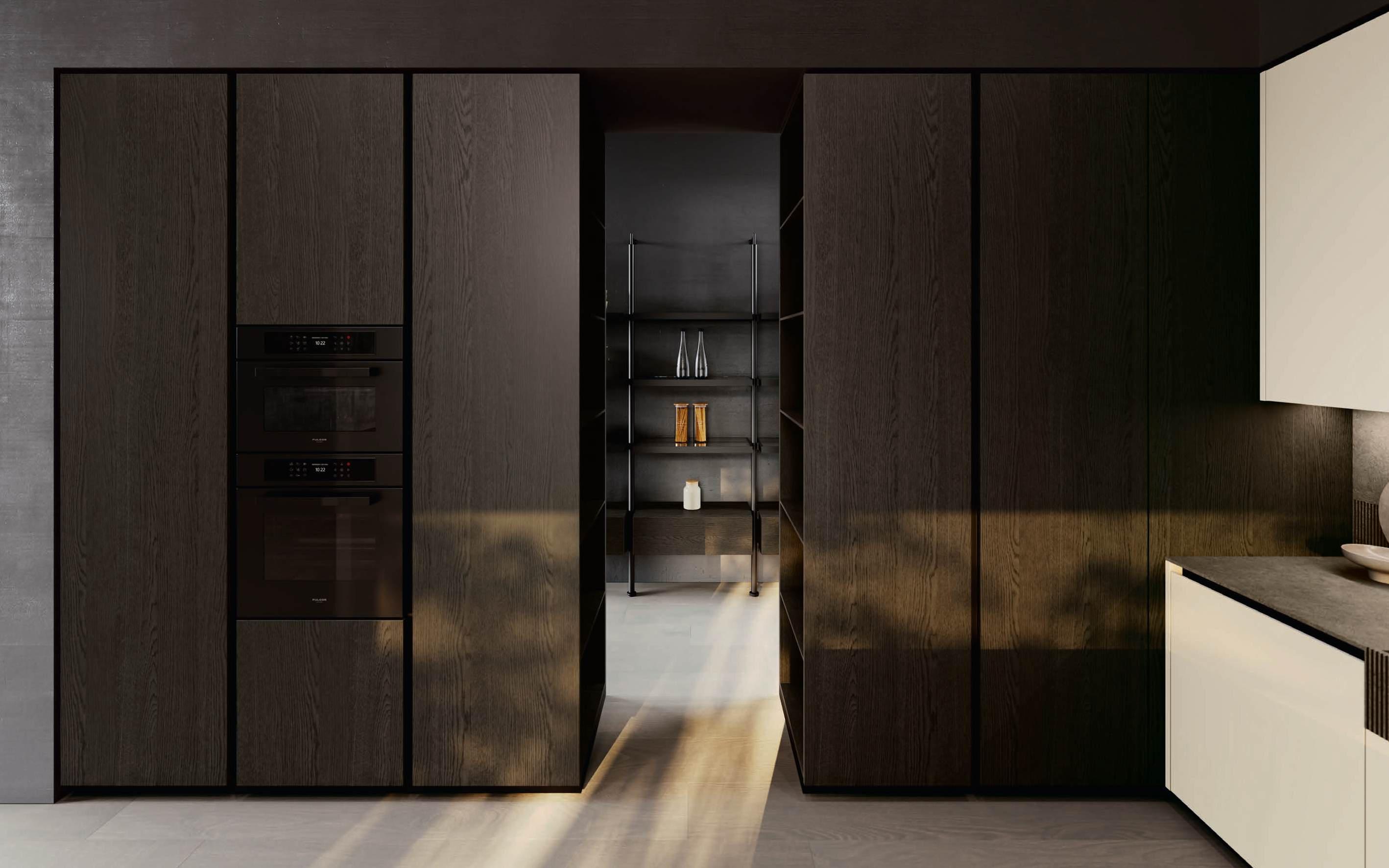 Detail of the wardrobe in Bilaminate Legno Rovere Quercia finish, with vertical groove opening. The left column is equipped with the Maxima pull-out mechanism, followed by a technical column housing the oven and a third central column. Together with its symmetrical counterpart on the right, they create a passageway with terminal open modules in Bilaminate Legno Rovere Quercia.