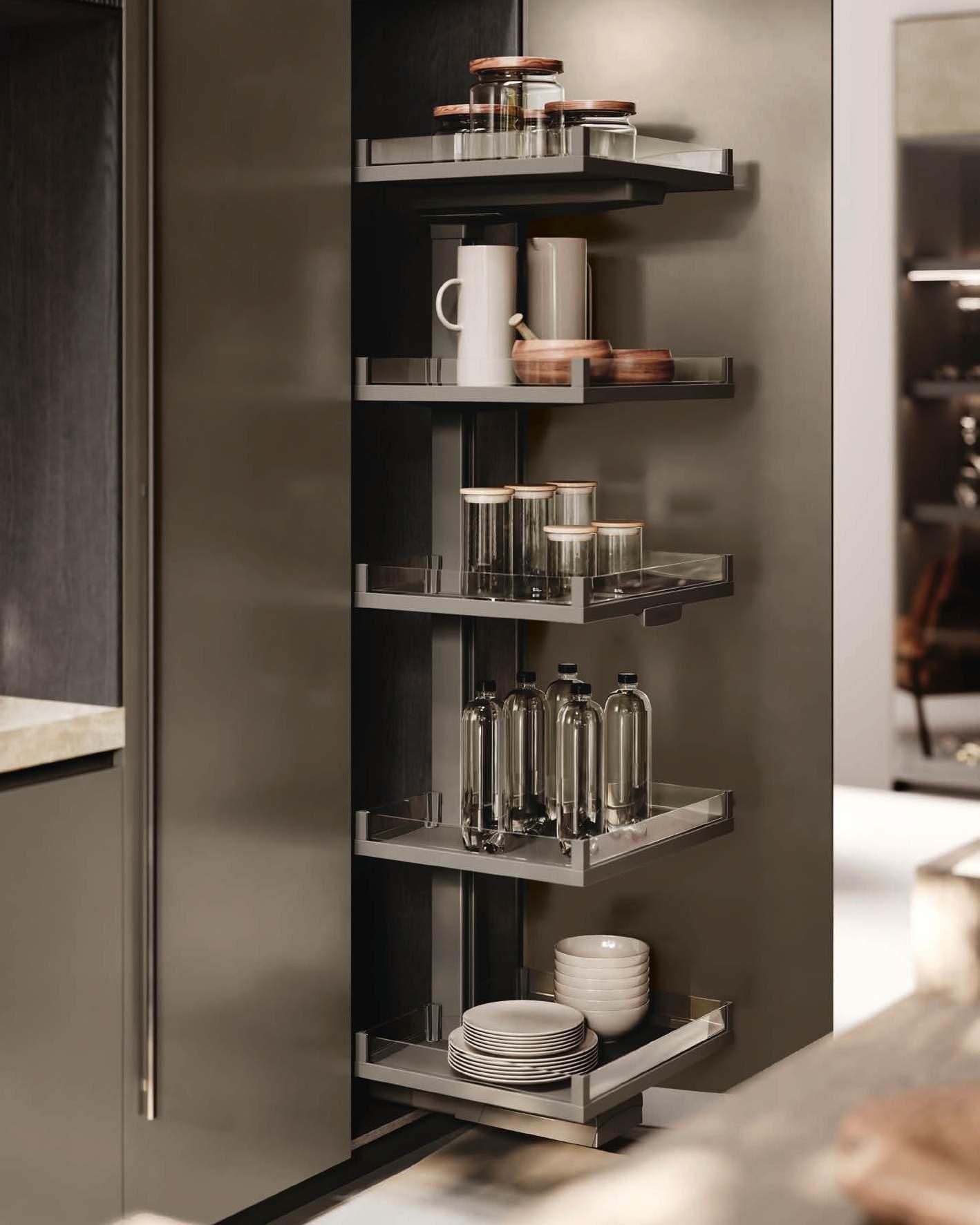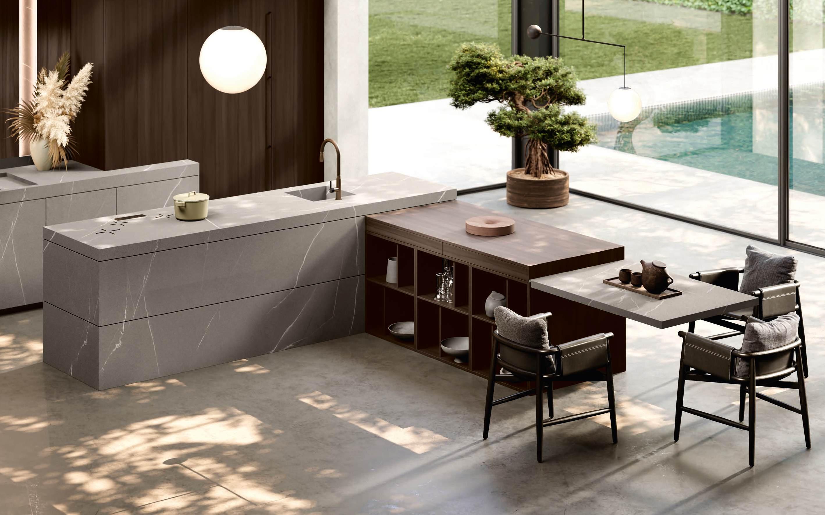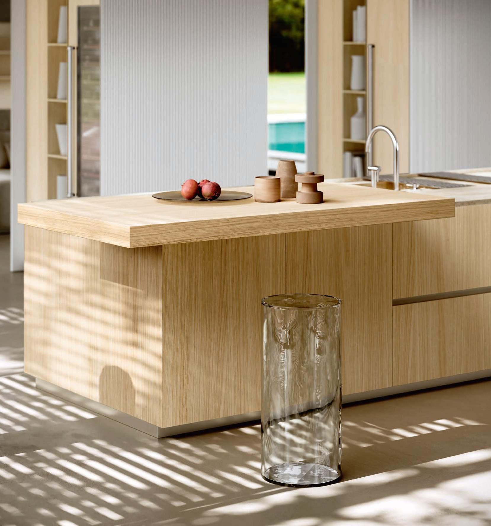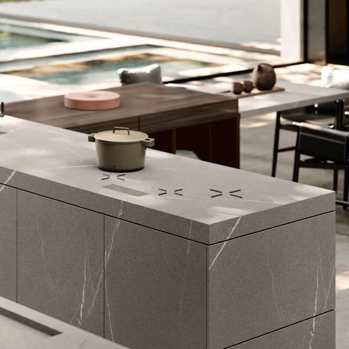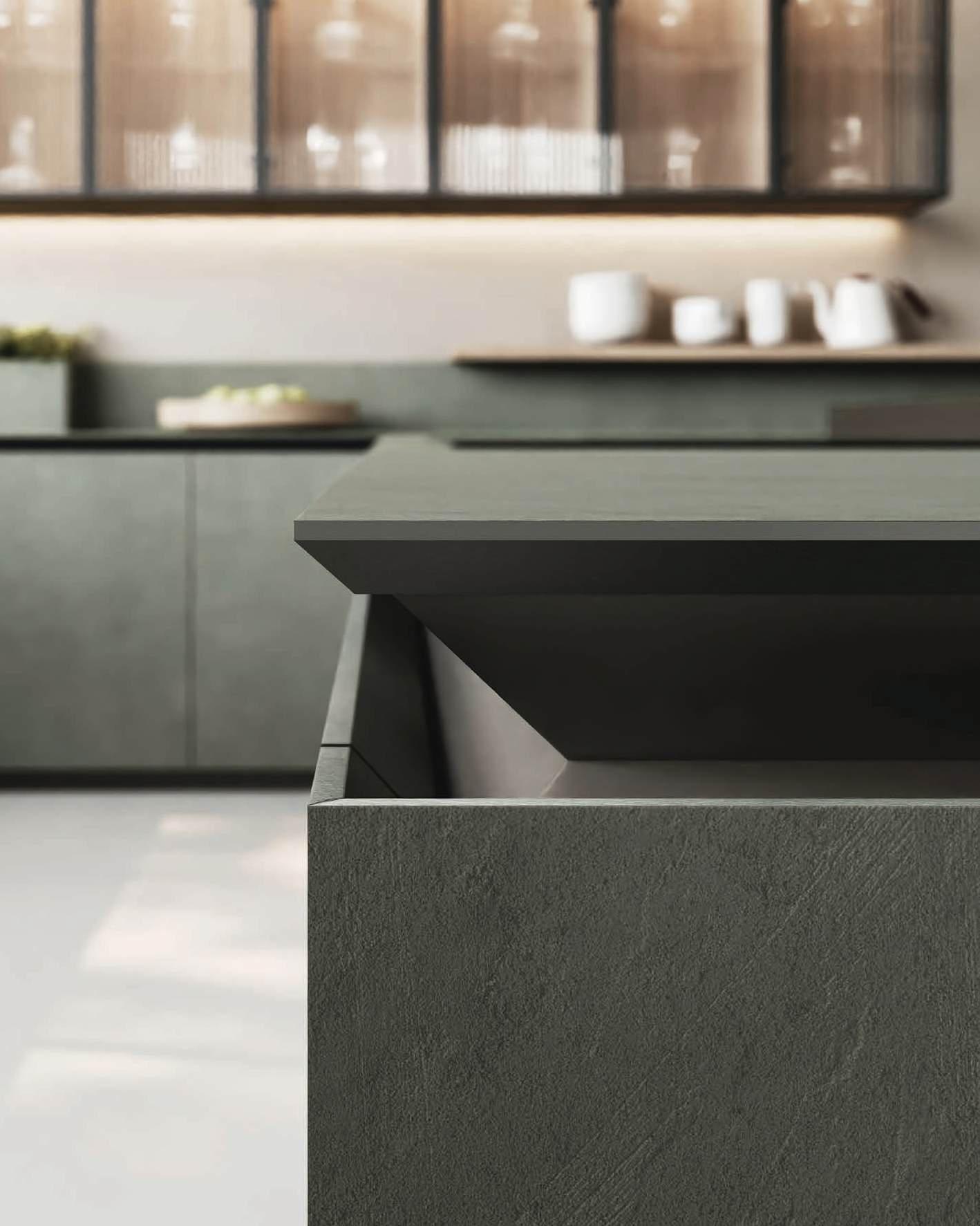 The Bluna island is characterised by its refined monolithic volume that places emphasis on simplicity and cleanliness of lines. The distinctive Stone handles, designed as horizontal sections inserted in the upper edge of the fronts, and the elegant stoneware worktop in matt Silver Root ease the rigor and decorate the aesthetic purity of the surfaces. As in the theatre when the curtain rises, when the wall columns open, a horizon of revelations unfolds, multiplying spaces and functions. The columns hide unexpected solutions such as practical pull-out worktops, washing areas and appliances. As soon as the doors close, the boundaries of order are restored.