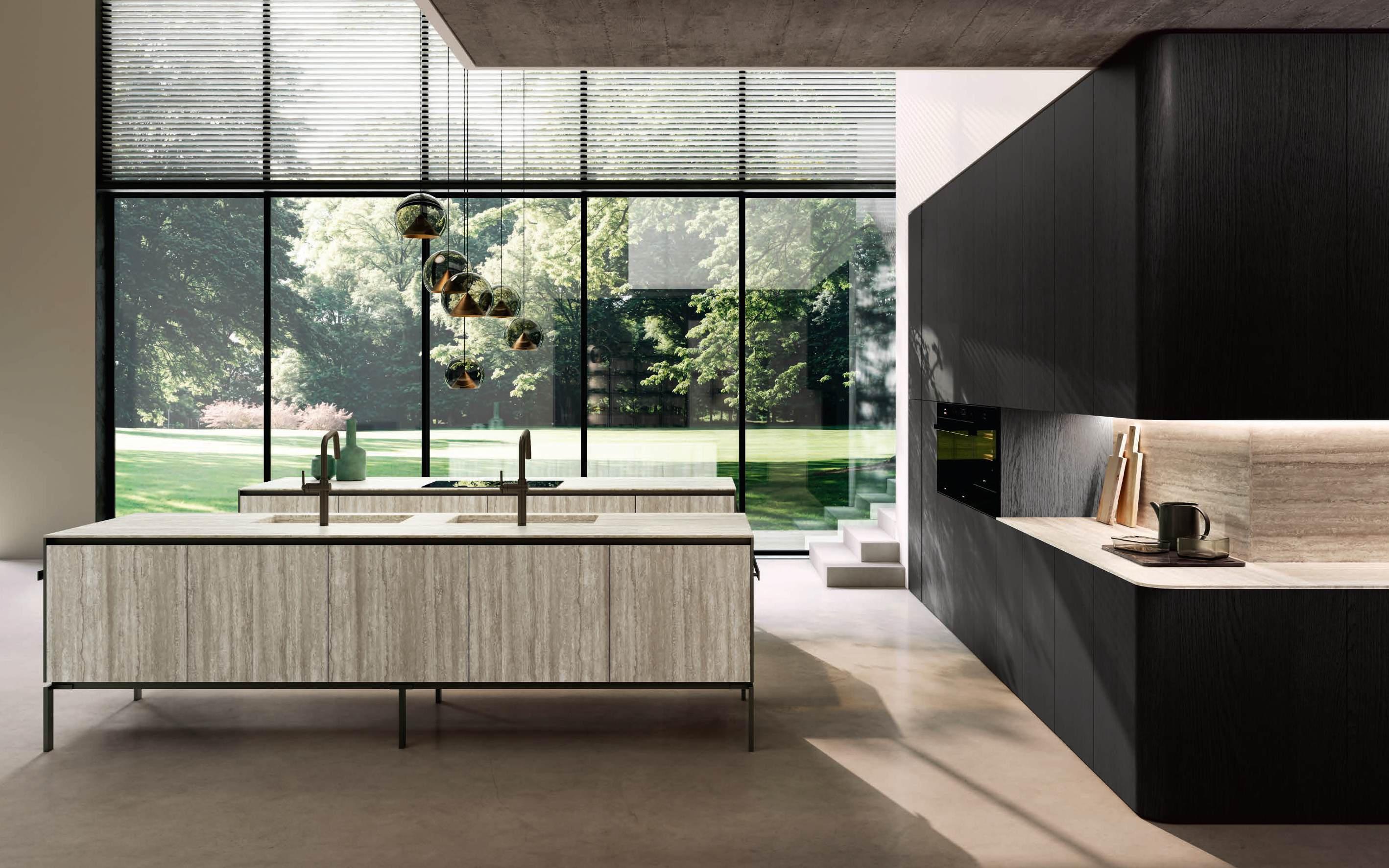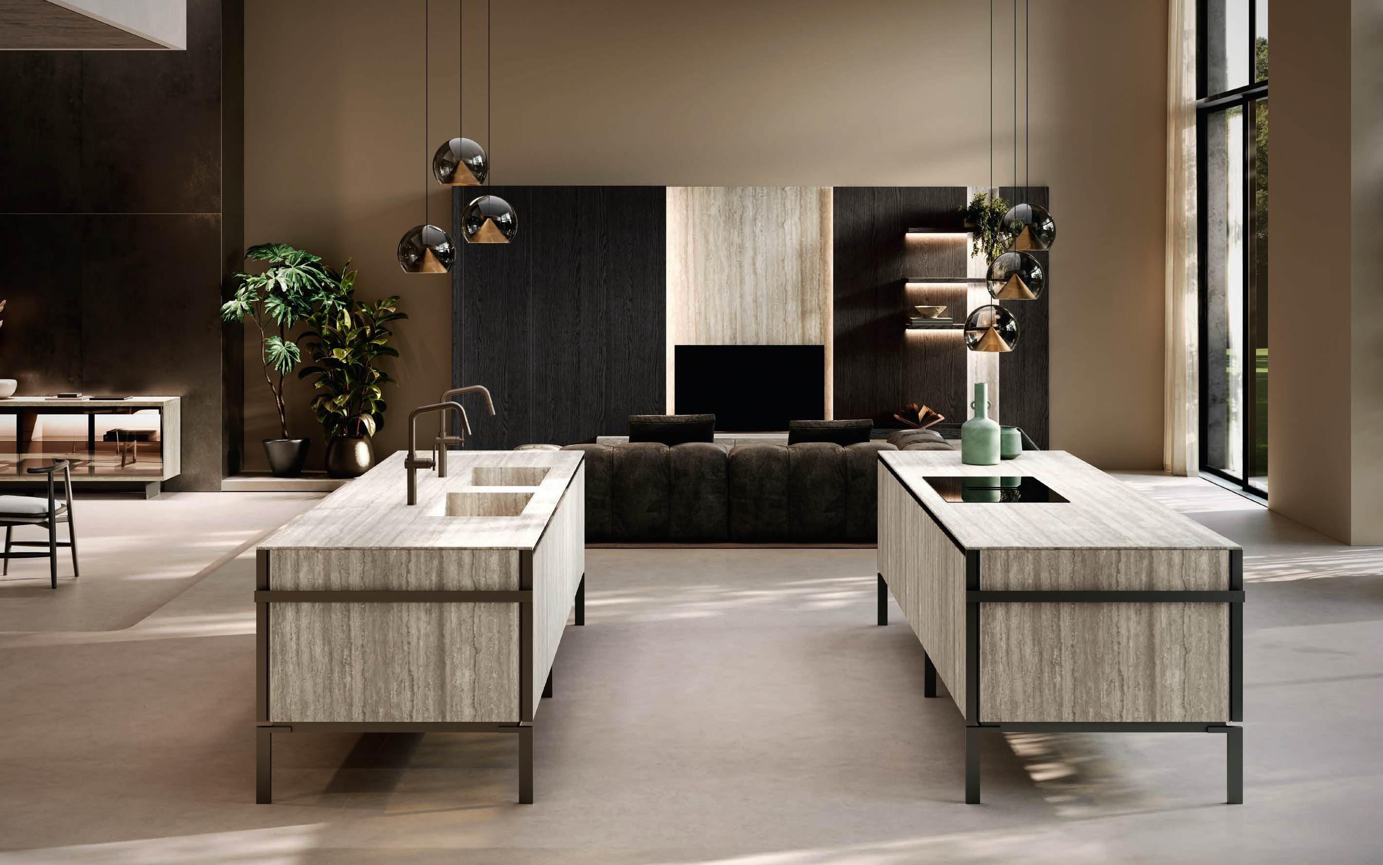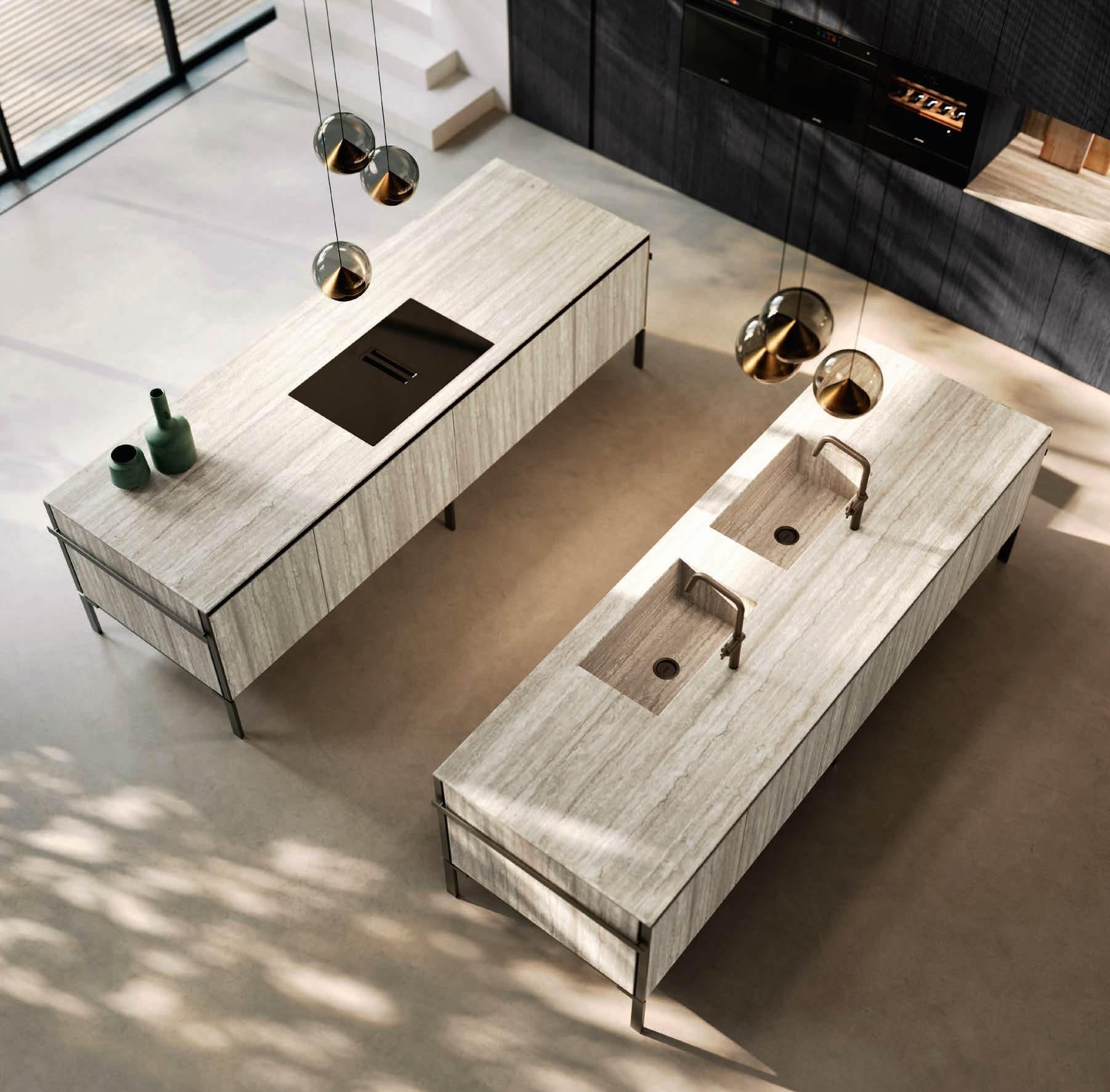 The two islands with Regula bases in matte black aluminum and Lab Travertino Silver Bocciardato Grès doors, Step profile, and black aluminum frame, accommodate on the left an induction cooktop, and on the right a double washing area. The 12 mm thick Solid top is in porcelain Travertino Silver Bocciardato. The sides of the islands are black aluminum and feature a central panel, in the same finish as the Lab doors, equipped with an accessory bar.