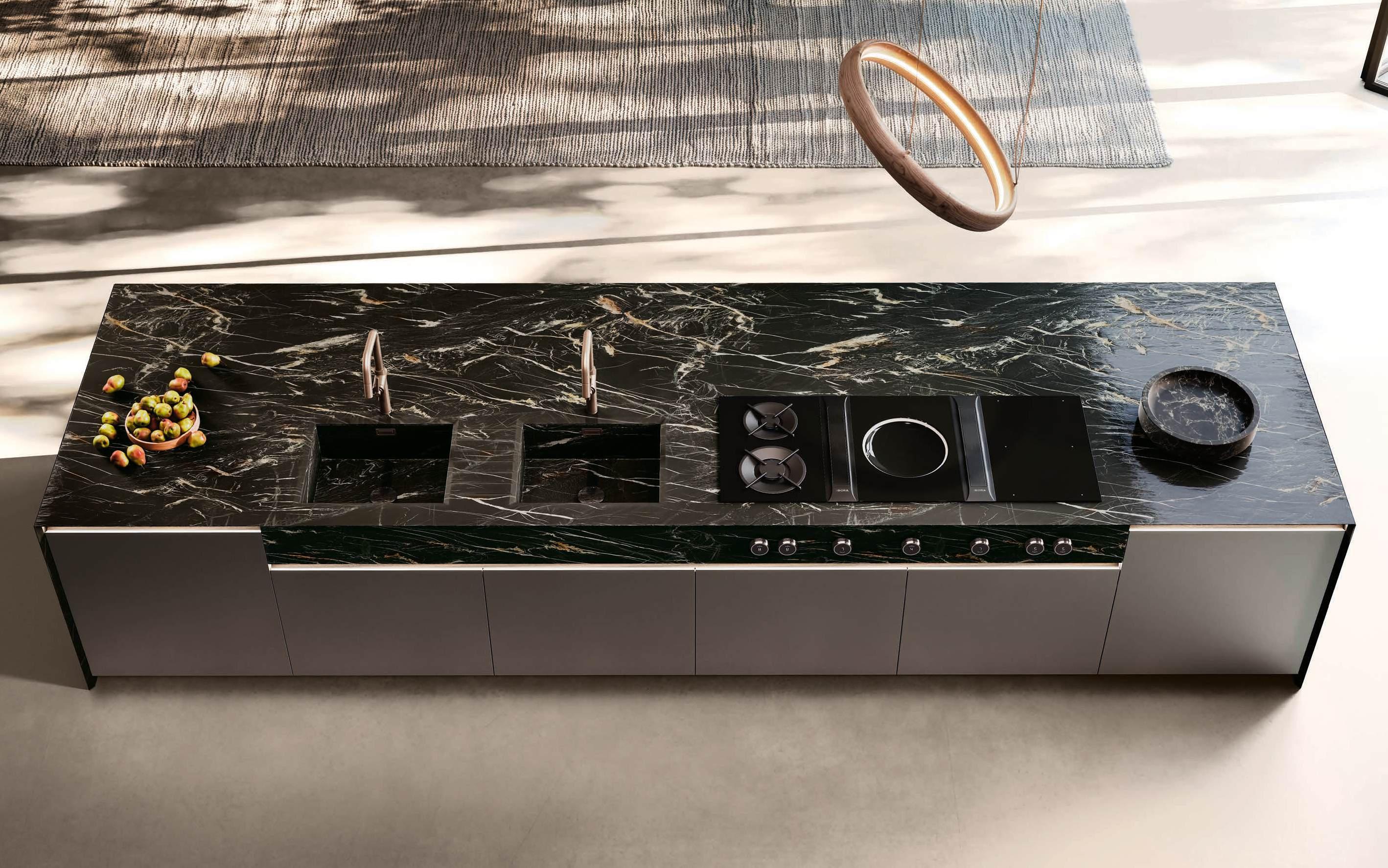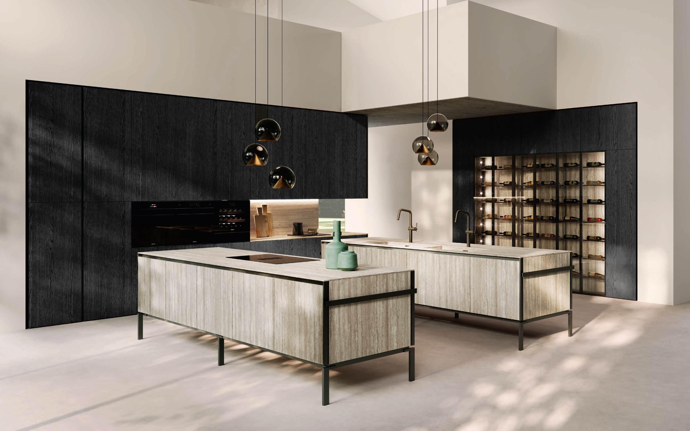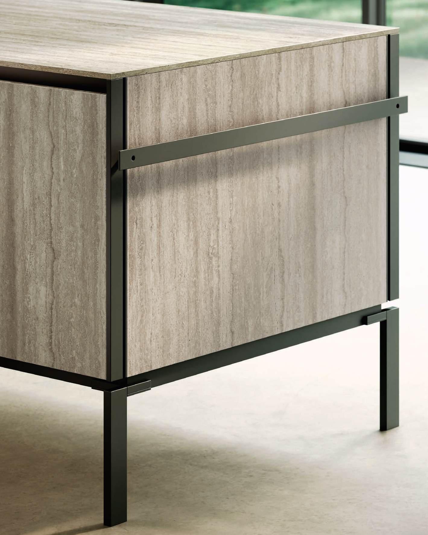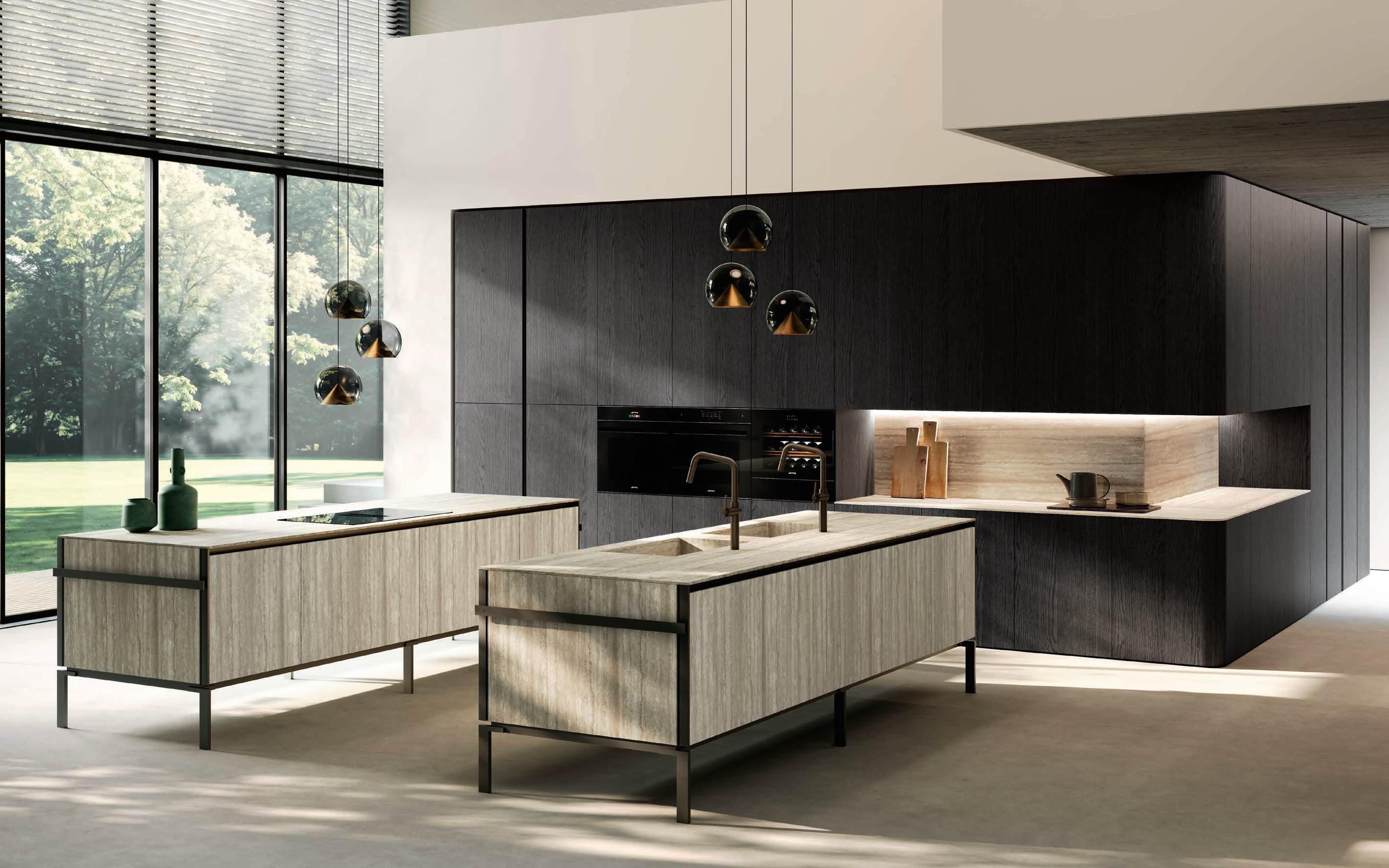 The two islands with Regula bases in matte black aluminum and Lab Travertino Silver Bocciardato Grès doors, Step profile, and black aluminum frame, accommodate on the left an induction cooktop, and on the right a double washing area. The 12 mm thick Solid top is in porcelain Travertino Silver Bocciardato. The sides of the islands are black aluminum and feature a central panel, in the same finish as the Lab doors, equipped with an accessory bar.