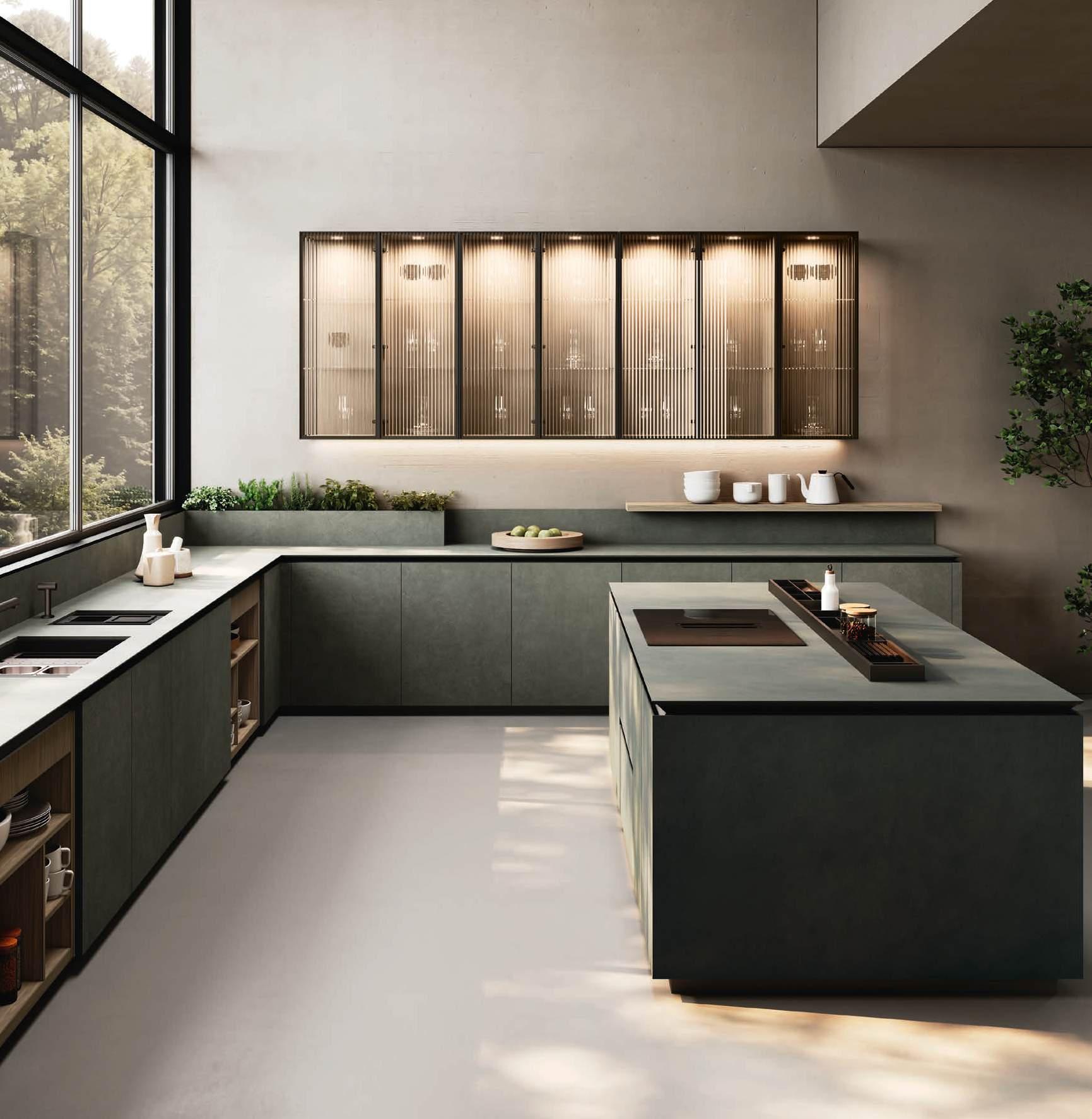 The Bluna collection is enriched with a original look. Doors consisting of a 16 mm thick anthracite grey wood panel on which is applied a 6 mm thick stoneware slab in Pietra Piasentina Grigio Fiammato define the two working areas of the project, the central island and the wall bases. Bluna Grès offers conviviality and sharing thanks to a large snack plan, completed by open spaces functioning as bookcases for full integration of living and kitchen. A clear aesthetic and functional division is present between the stone island, which concentrates the washing and cooking areas, and the colonnade in Noce Canaletto Grigio finish that houses the appliances. At the core of the cabinetry, then, the Petra glass units perfectly combine dark bronze and glass.
