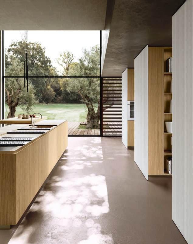 Le finiture proposte, in abbinamento al gioco di spessori e luci, rendono la zona living uno spazio unico con la cucina.