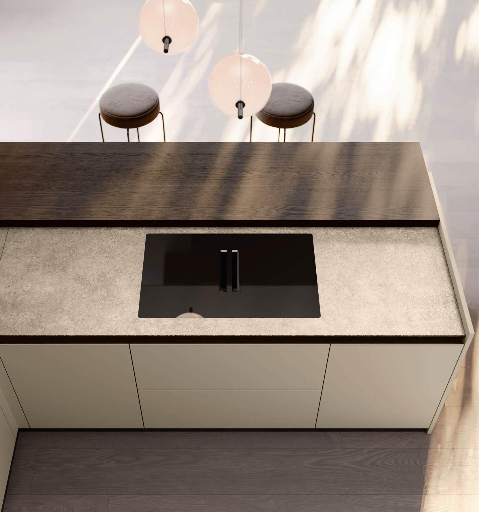 The integrated sink built in the same finish as the worktop creates a clean, uncluttered look. This gives the kitchen an elegant and contemporary design, ideal for lovers of minimalist style.