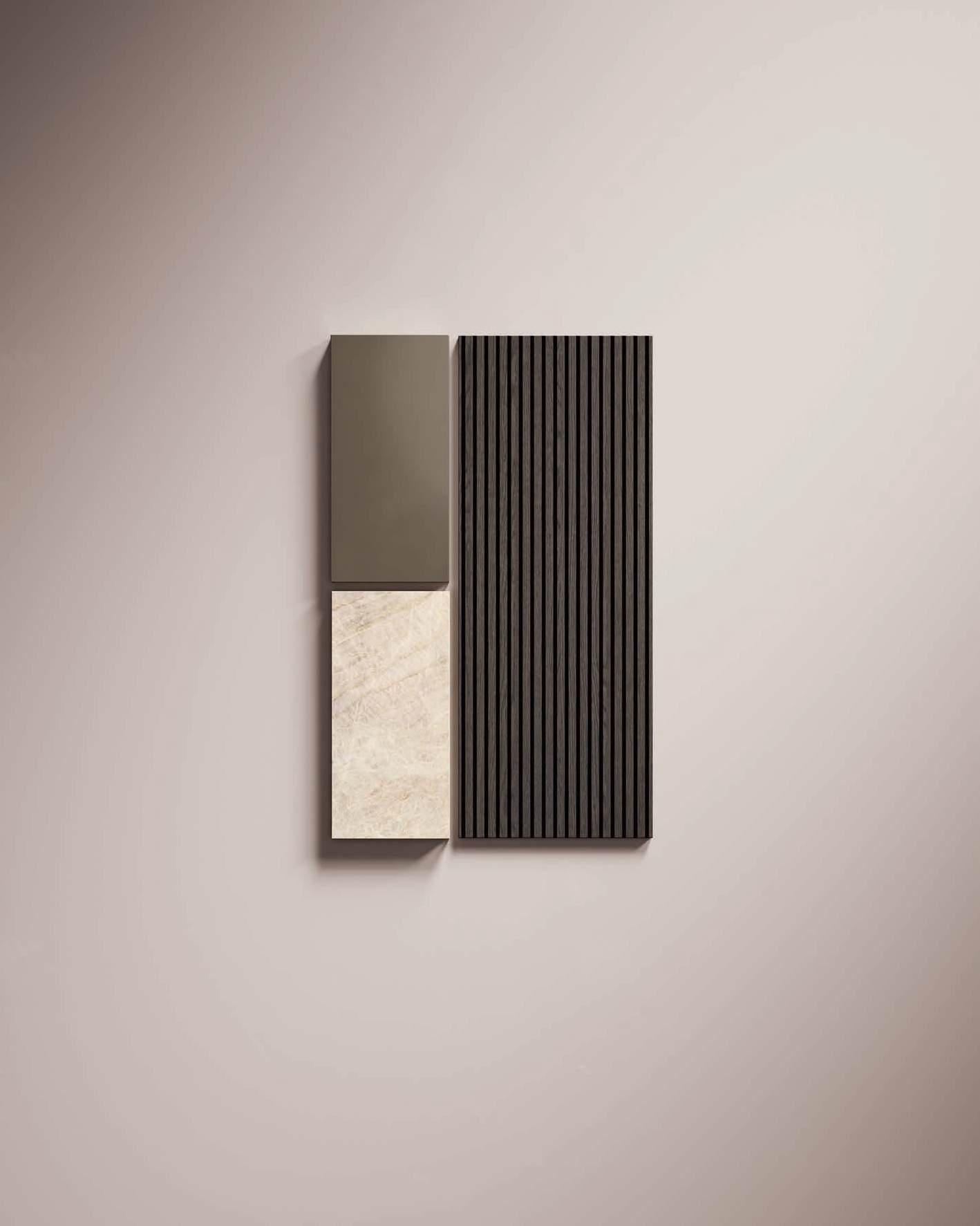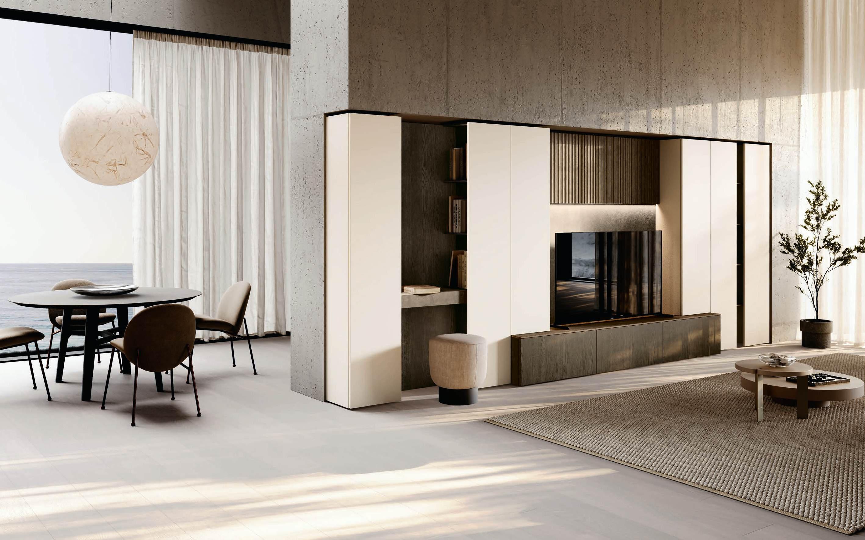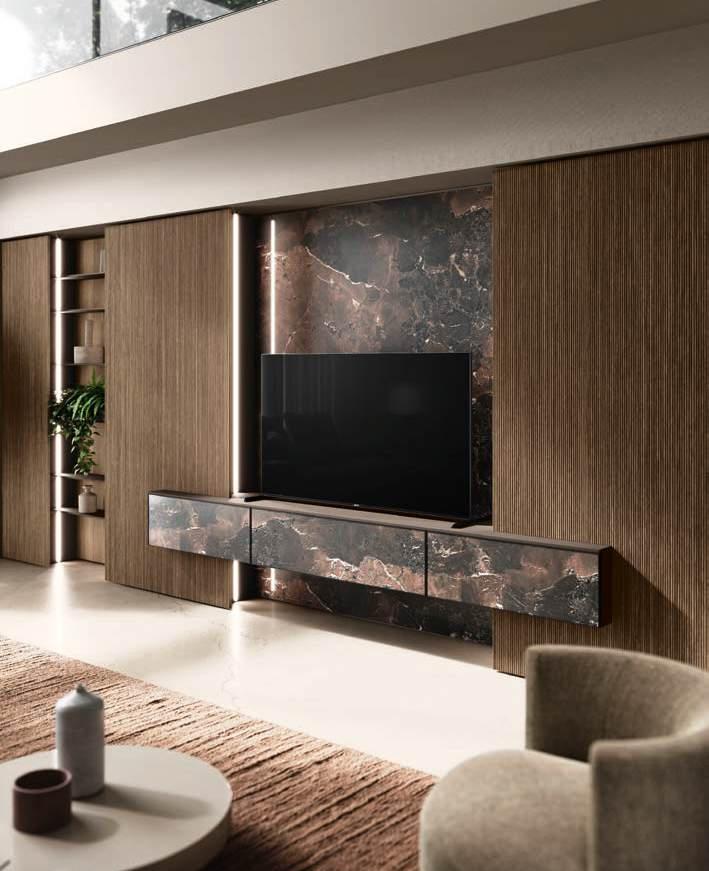 In a symphony of materials and finishes, the kitchen becomes an authentic sensory experience, where every detail is a note of harmony. The Bluna island, theatre of taste and functional soul of the kitchen area, is characterised by the refined encounter between the black backdrop of the top and the monobloc cover in natural stone together with the metallic elegance of the doors in Dakhìa Beige. To enhance the visual experience and create a unique and enveloping atmosphere, the innovative emme groove integrates LED profile to illuminate the location where food preparation becomes an art. The Hily colonnade, with its distinctive wood frame, serves as the background of the island while the Zen windows, which feature alternating wooden slats concealing smoked glass, lead to the exploration of spaces and functions related to the diverse needs of modern living.